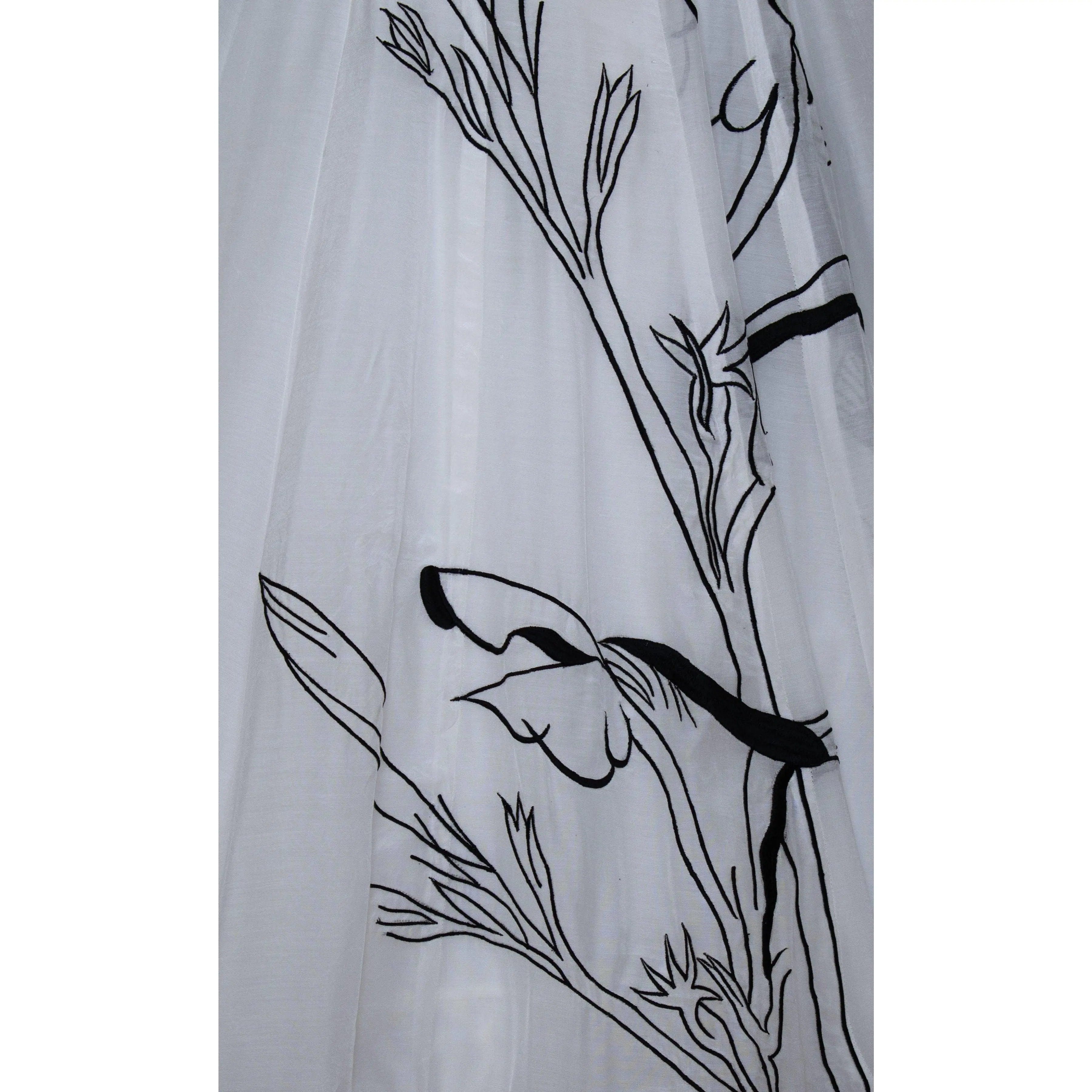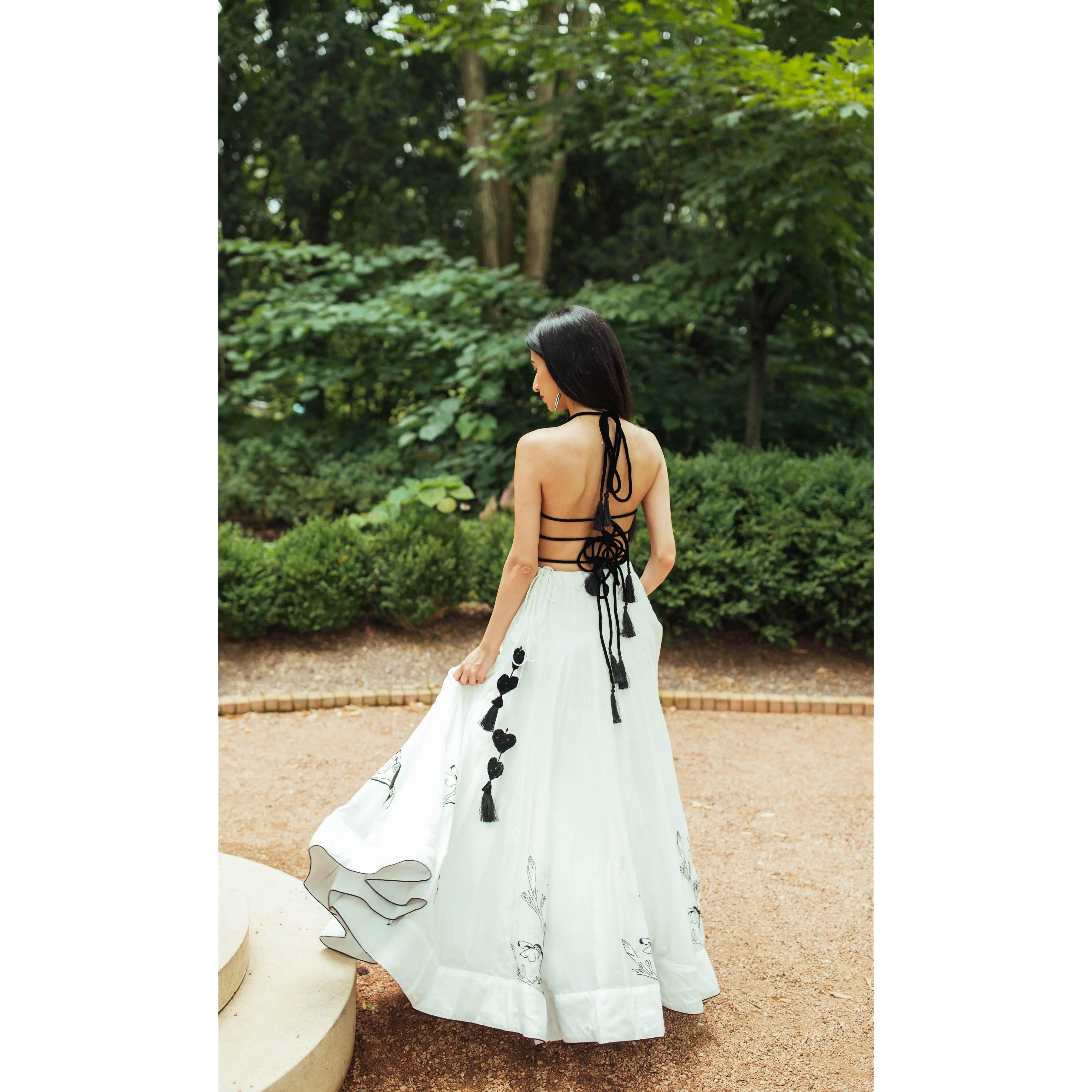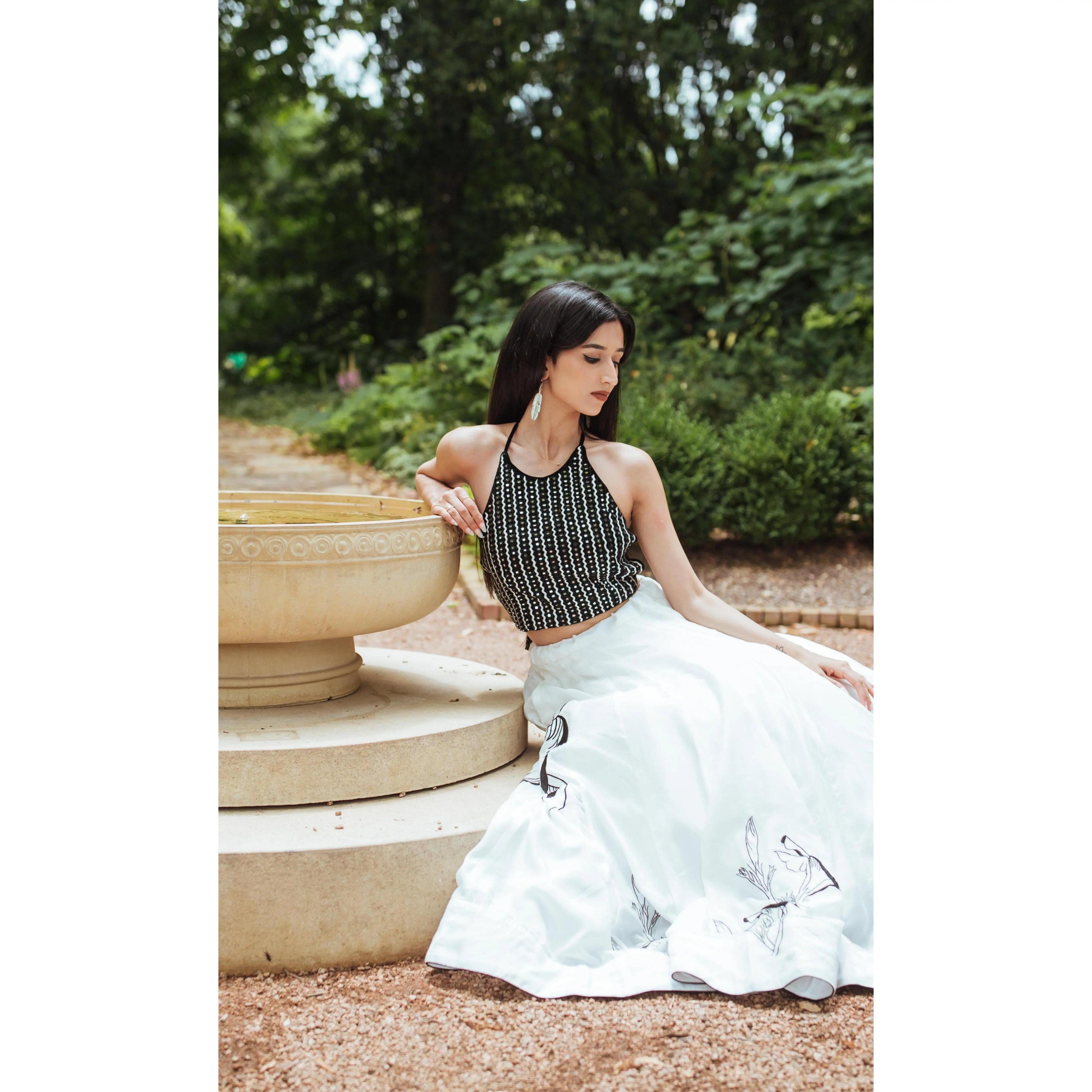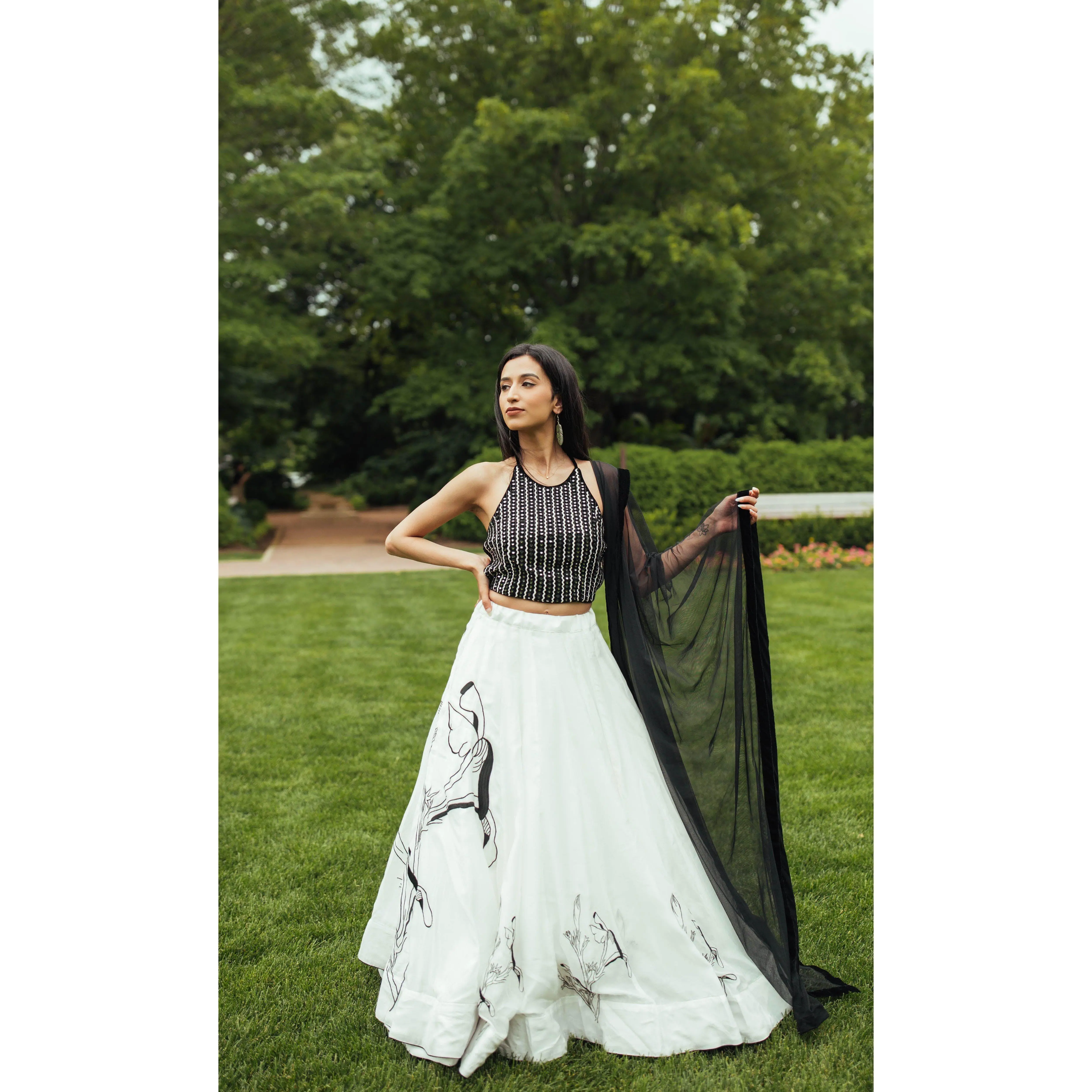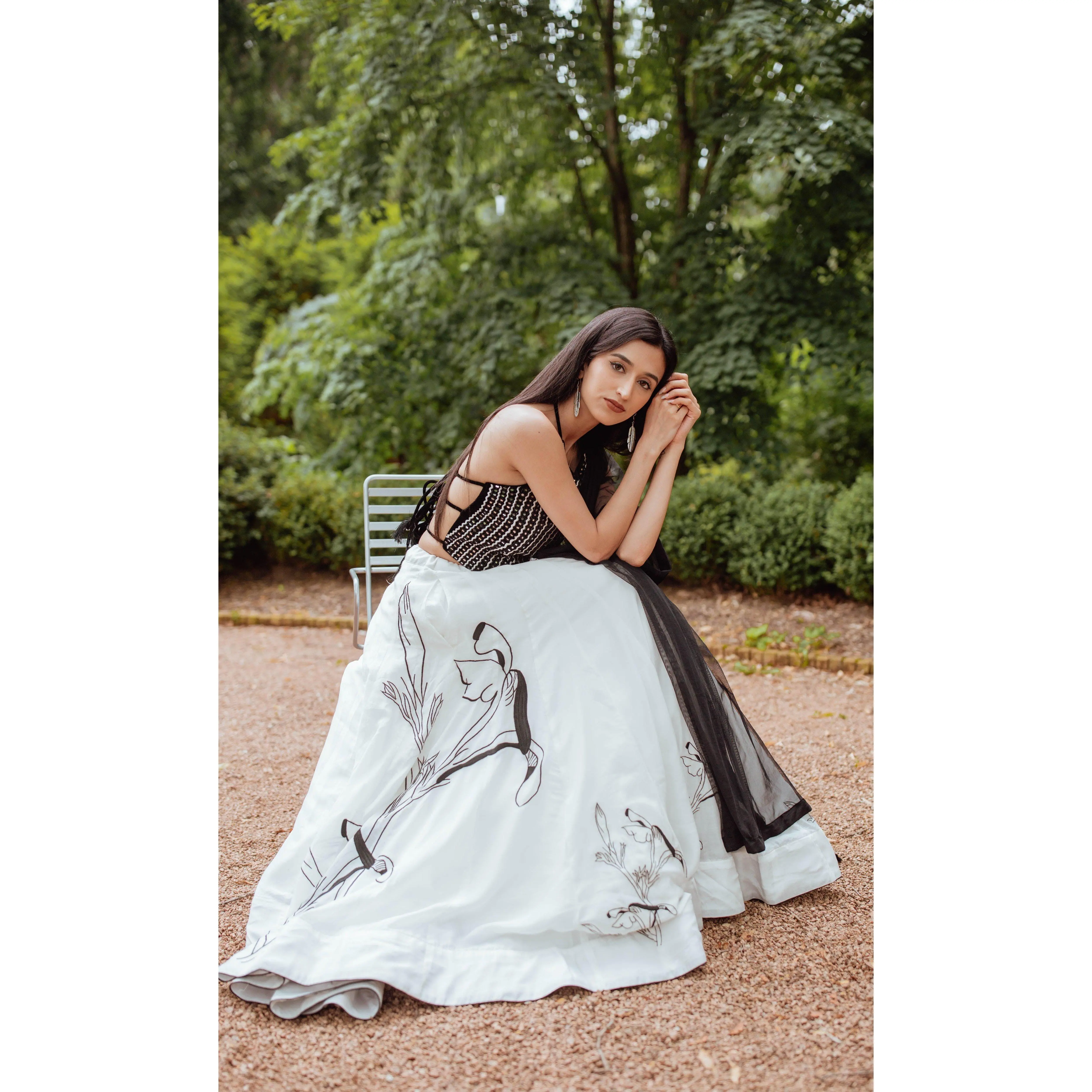 A graceful lehenga set designed with artisanal detail. The flowing silk lehenga comes in a delicate powder off-white shade and features subtle resham embroidery along the hem, creating a refined contrast against the airy silhouette. It is paired with a heavily embroidered velvet blouse adorned with mirror, cutdana, and resham work in a striking black base. Finished with a lightweight net dupatta, this three-piece lehenga set blends modern structure with traditional craftsmanship.