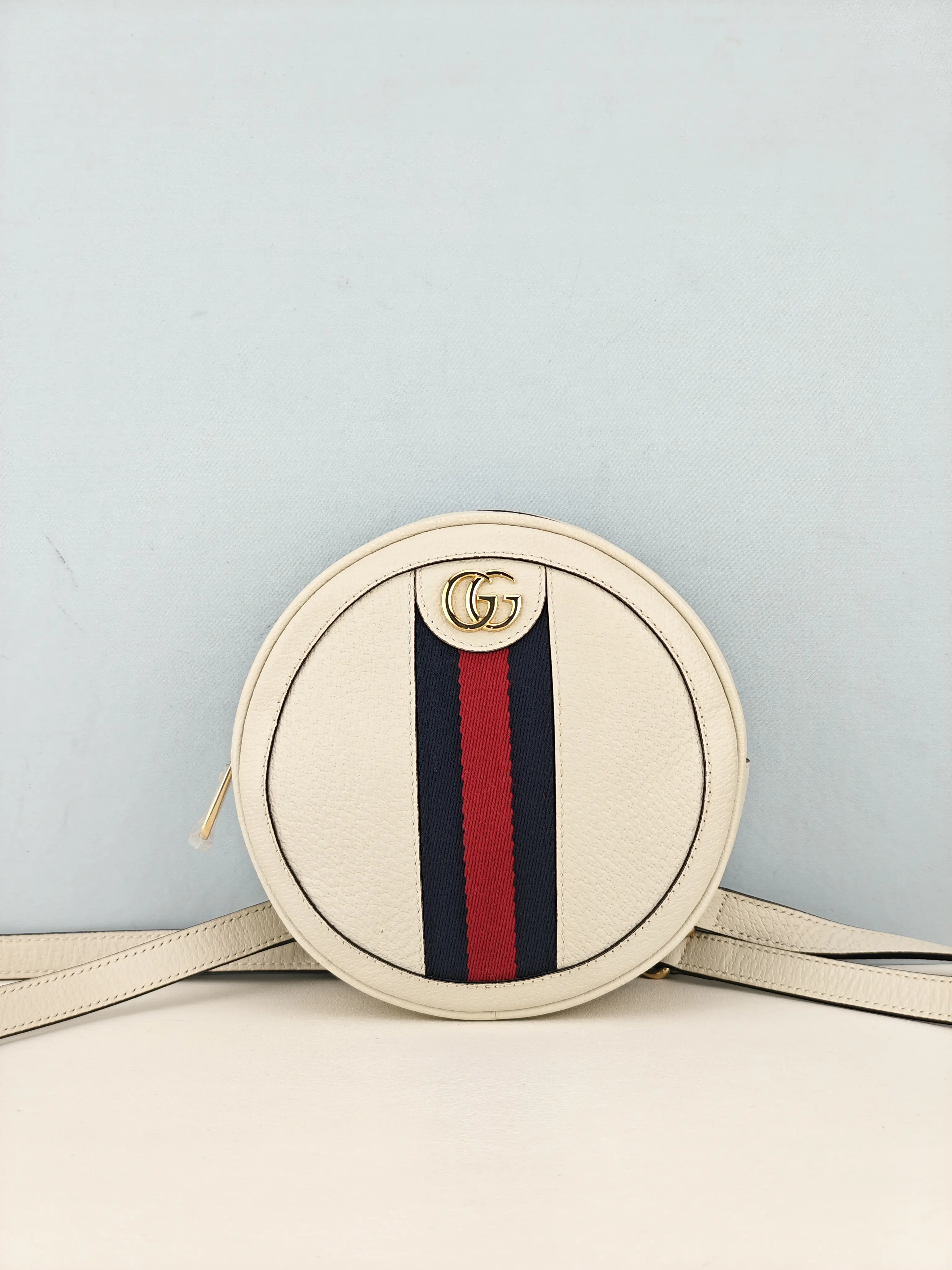 This pre-owned authentic Gucci White Leather Ophidia Vintage Web Circle Backpack Bag is a stylish and versatile choice. Its white leather material and vintage design make it a great addition to your collection.
