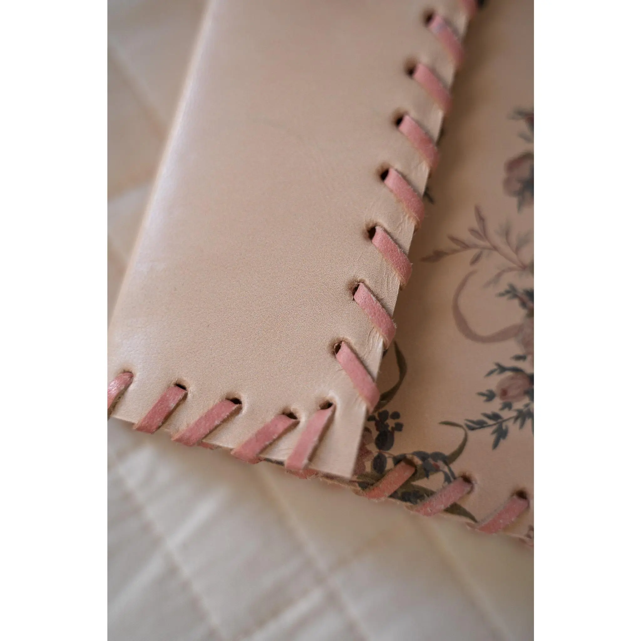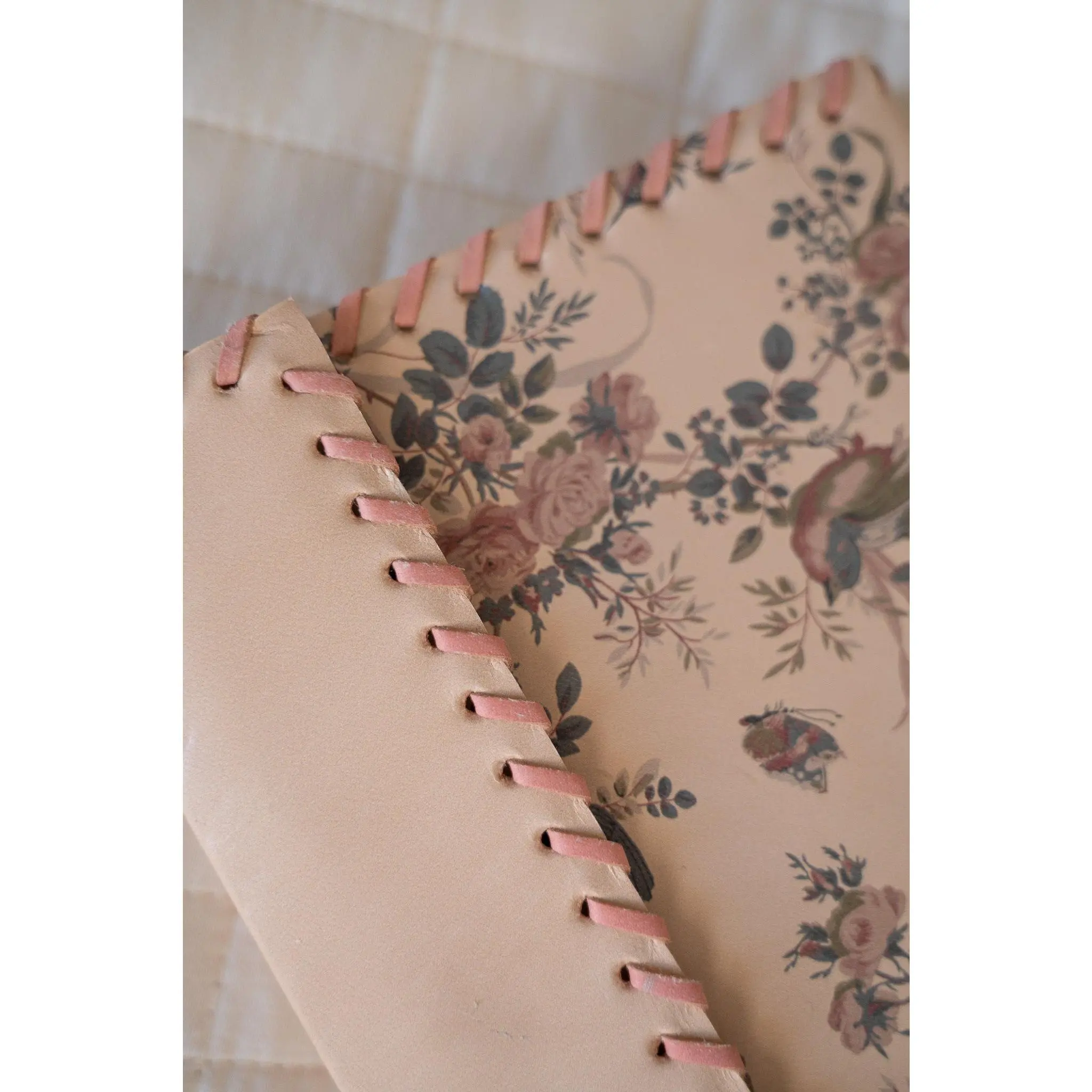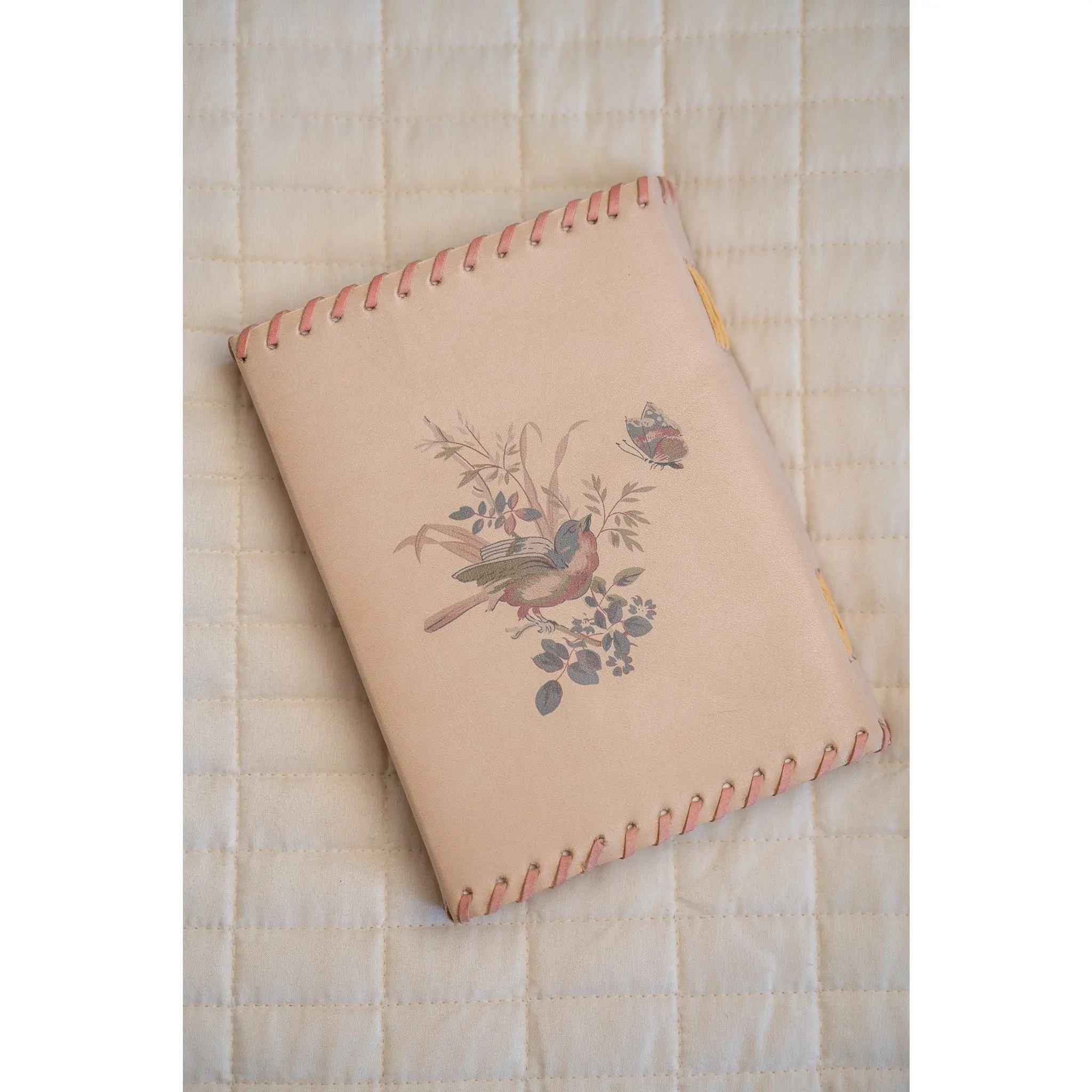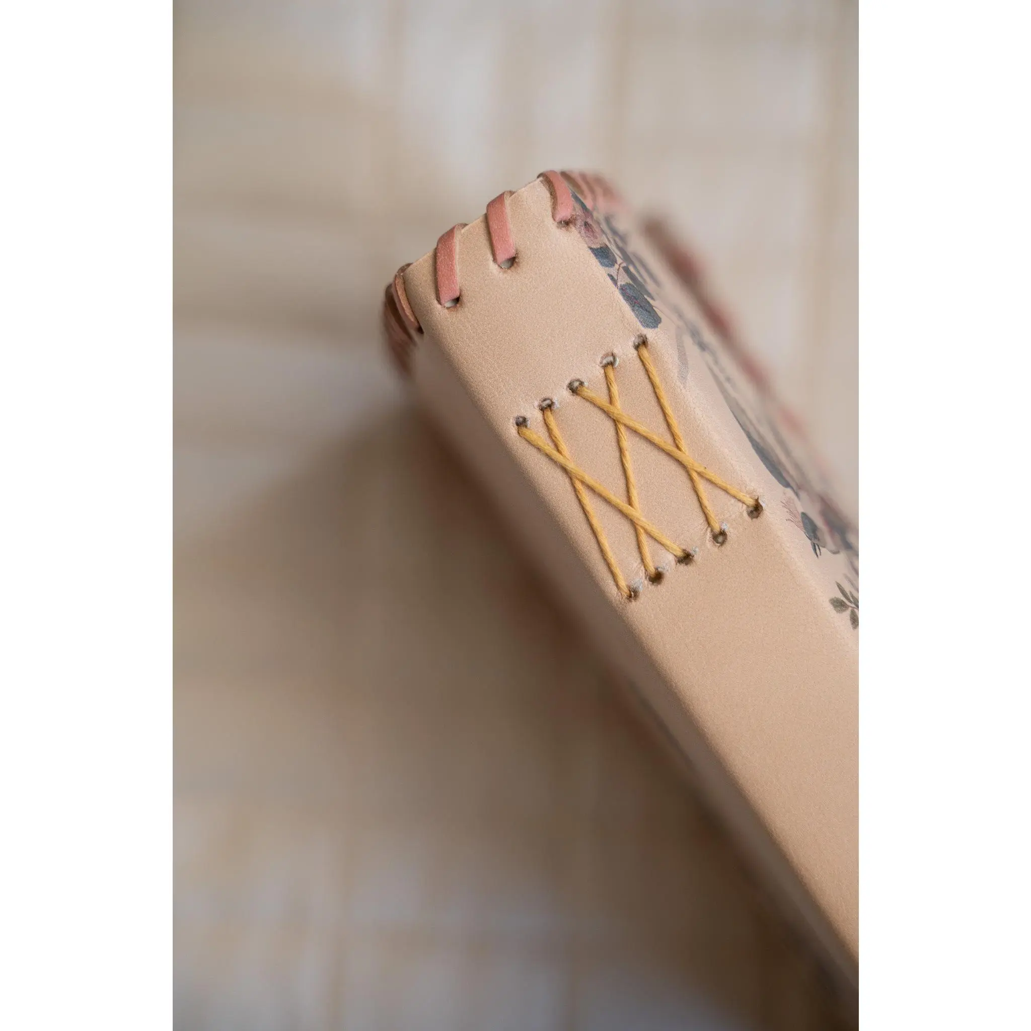 Pretty enough to make you want to write every day. This leather-bound journal wraps a blush pink cover in a romantic print of sparrows and roses, with leather whip stitching along the spine and a magnet closure that snaps shut with the most satisfying finality. A hundred pages of recycled cotton paper wait inside — blank, unhurried, and entirely yours.