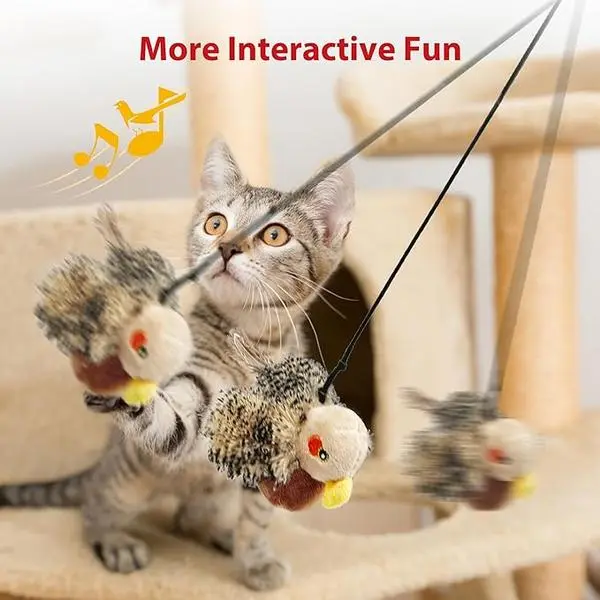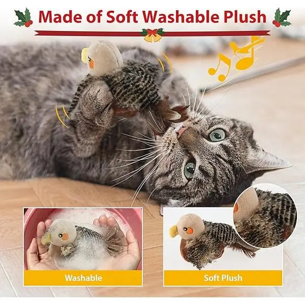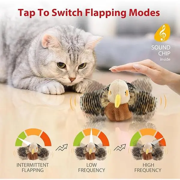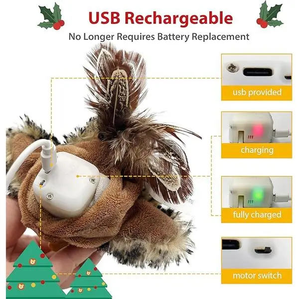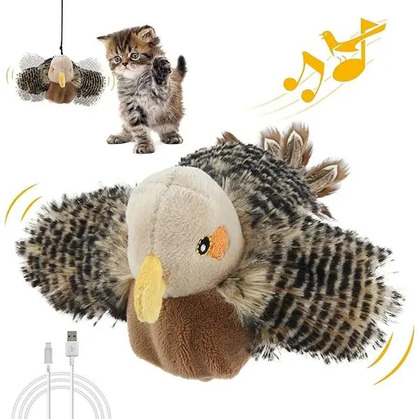🌟 Interactive Cat Toy 🌟- Chirping, Flapping, and Fluttering: The toy mimics a real bird, arousal your cat's hunting instinct and keeping them mesmerized.- 3 Models: Gentle, normal, and active modes to satisfy cats with different personalities.- Hangable Design: Includes an elastic rope for hanging, encouraging cats to jump and catch.- Catnip Pouch: Includes a catnip pouch to help relieve stress and keep cats happy.- Rechargeable: USB rechargeable with a long battery life. USB cable included.- Energy Saving: Automatically dormant when the cat stops playing for more than 15 seconds.
