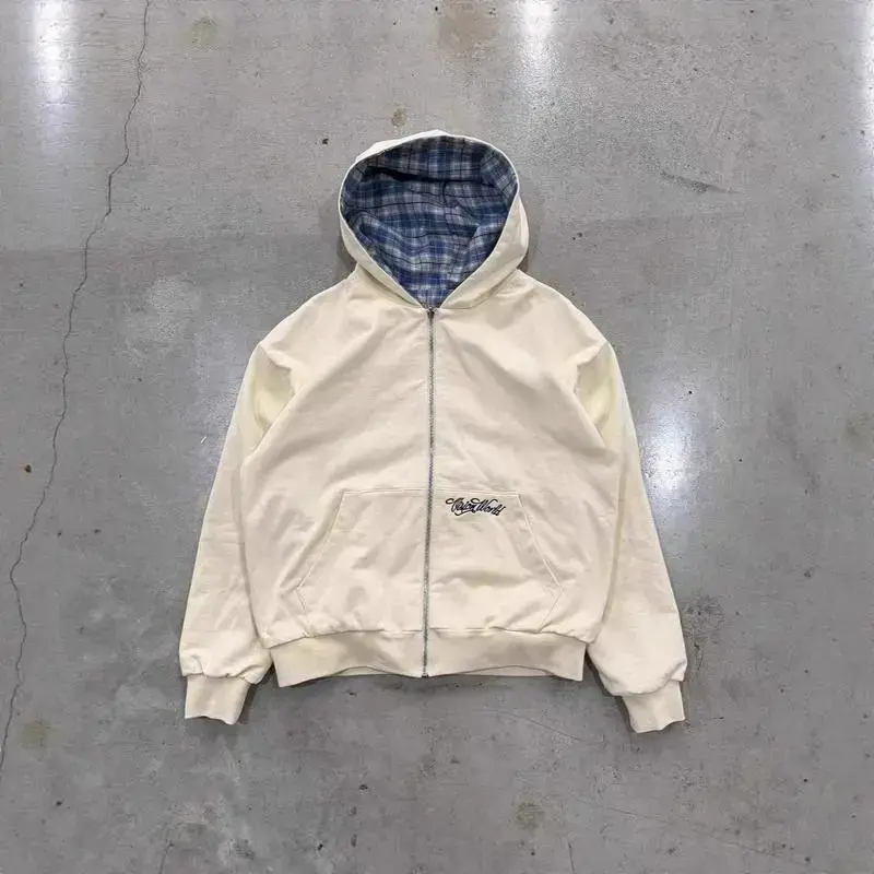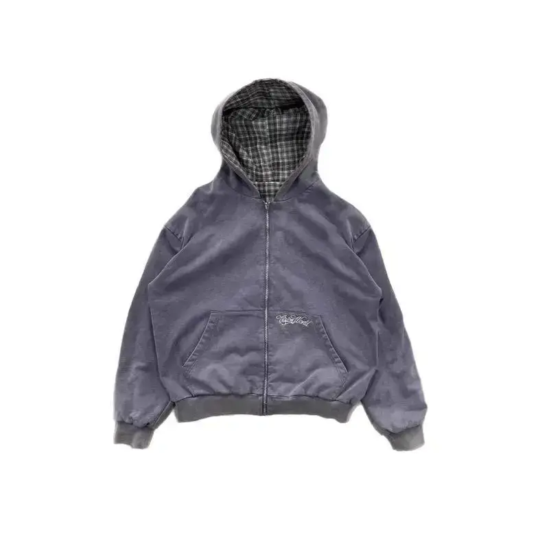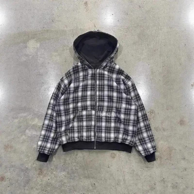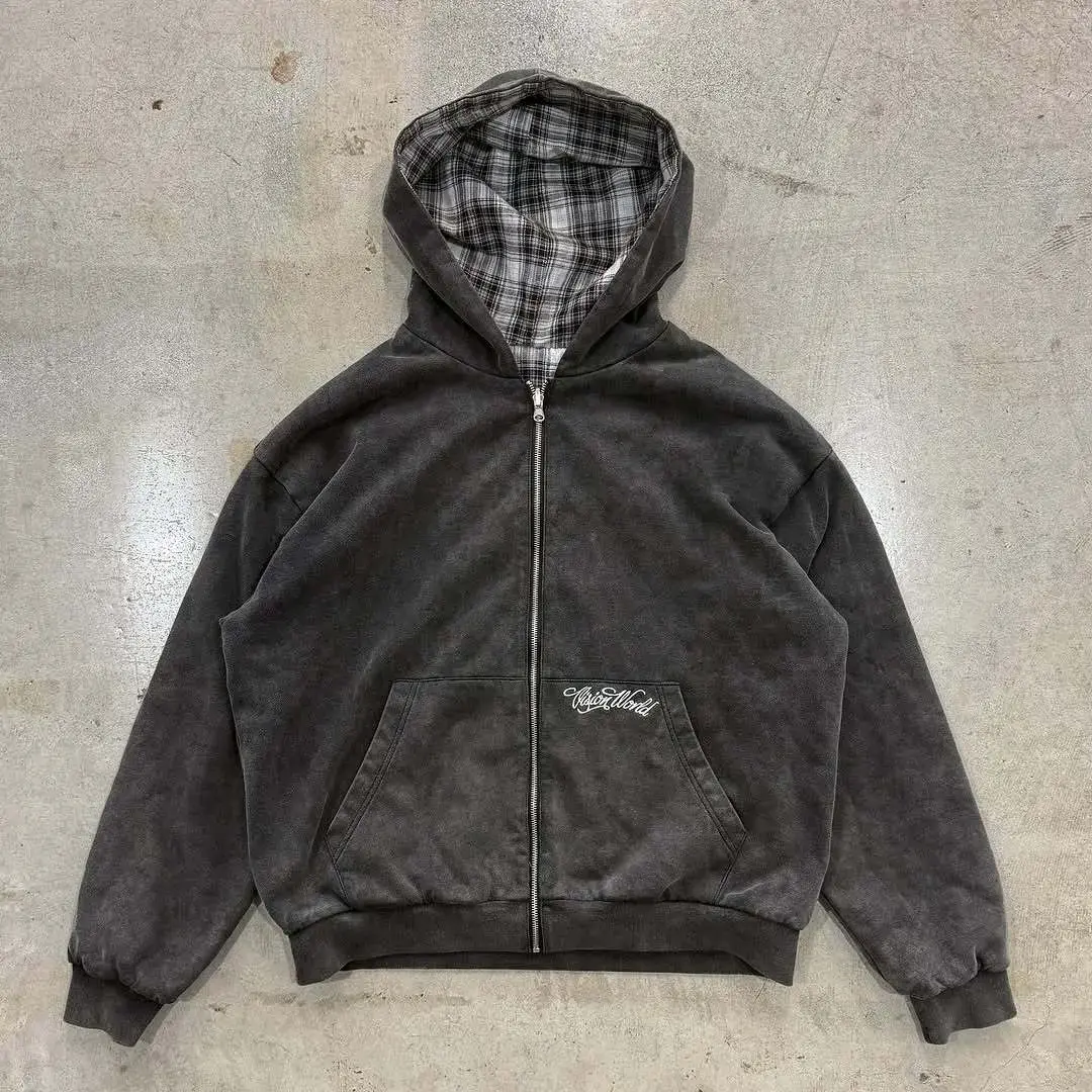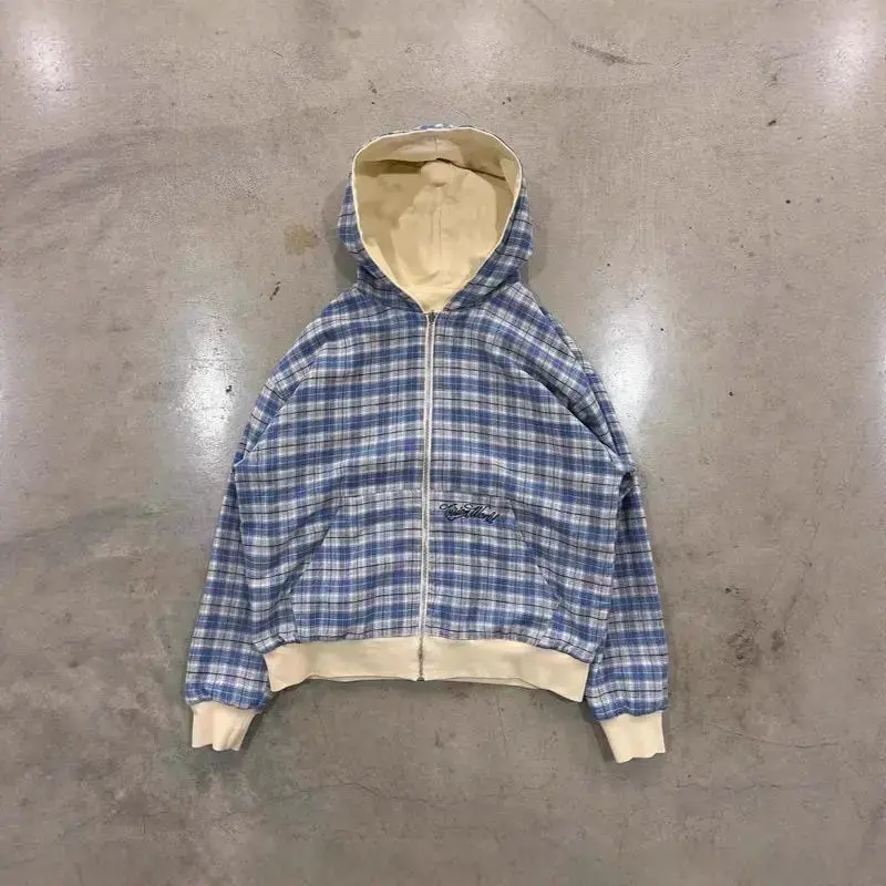 Street hooded sweater jacket autumn loose plaid splicing casual personality cardigan double-sided sweater