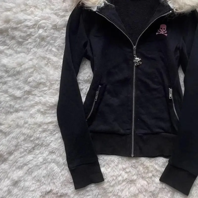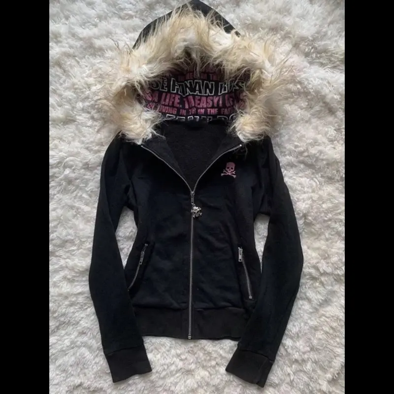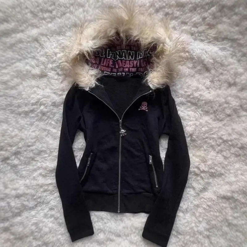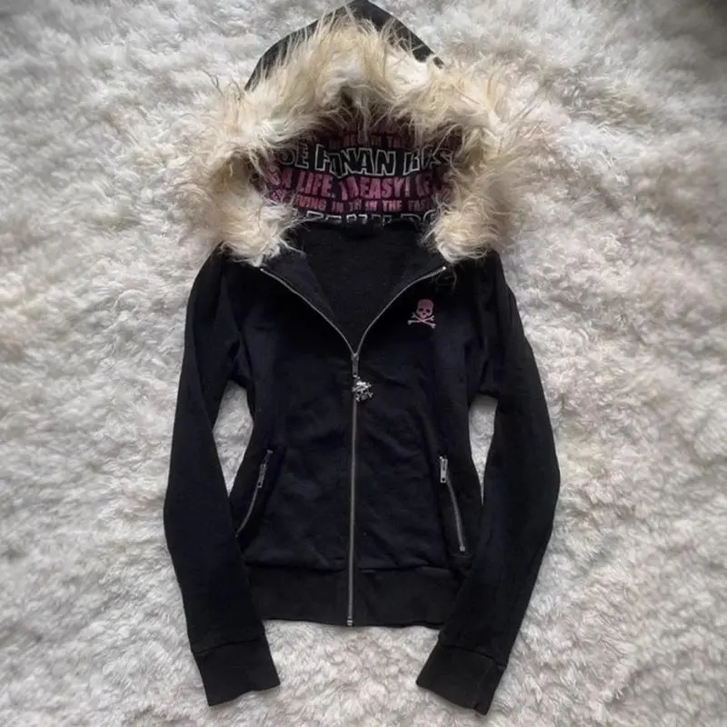 GothicStyleHoodedCardiganLetterPrintWomen'sThickenedWinterCoatFurCollarDesignZipperJacket
