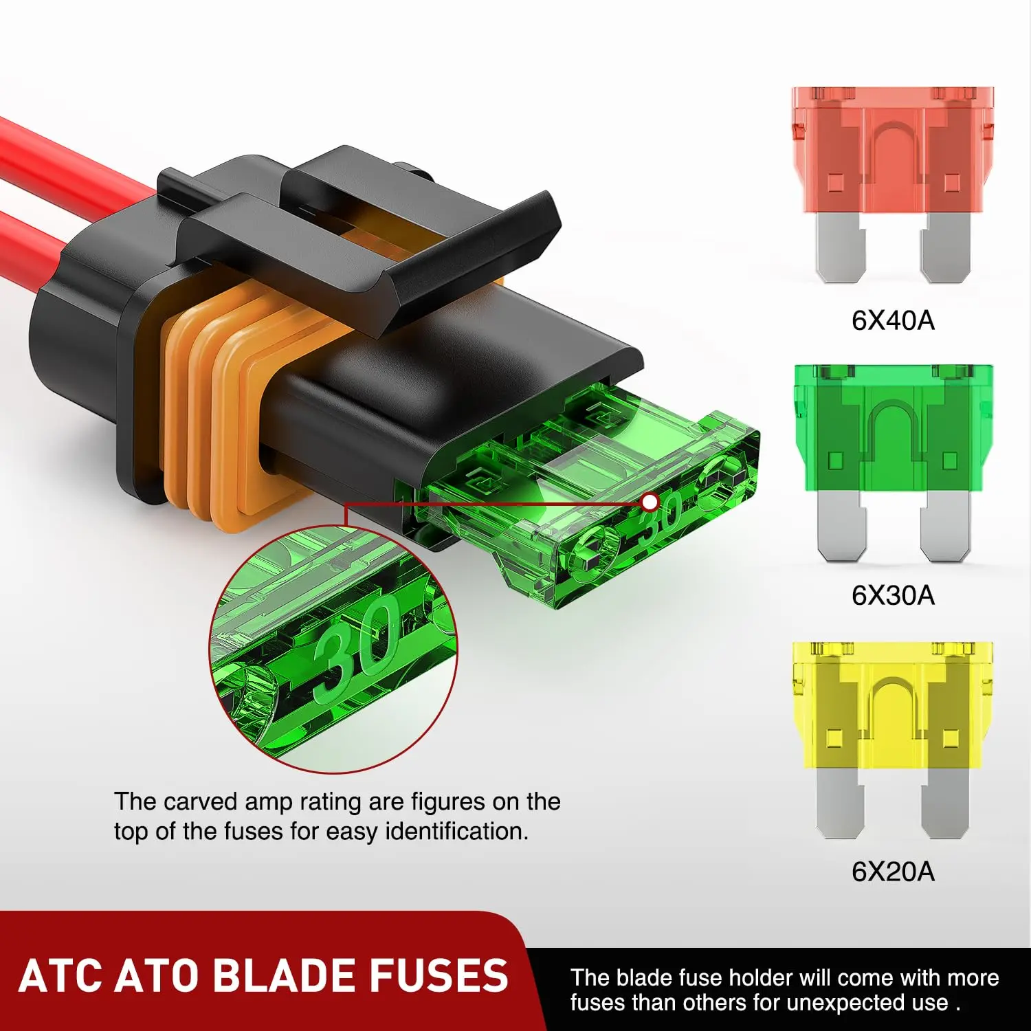 The wire blade fuse holder will come with additional ATC/ATO blade fuses for your choose, can be identified by the mark amp rating figure on the top.