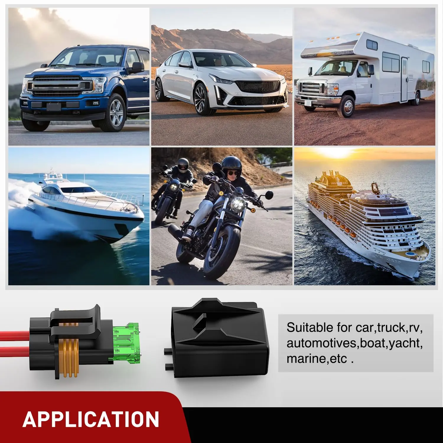 Fits most automotive vehicles such as cars, trucks, campers, SUVs, 4X4, boats, and RVs or car electronic devices such as radio, dashboard cameras, radar detectors, GPS, car recorders, car alarms, DVD players, and other electronic devices, etc.
