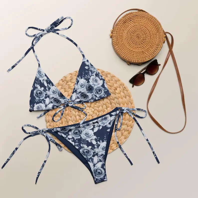 ·The bikini features a navy base with floral patterns, offering a stylish and comfortable fit. 🌸