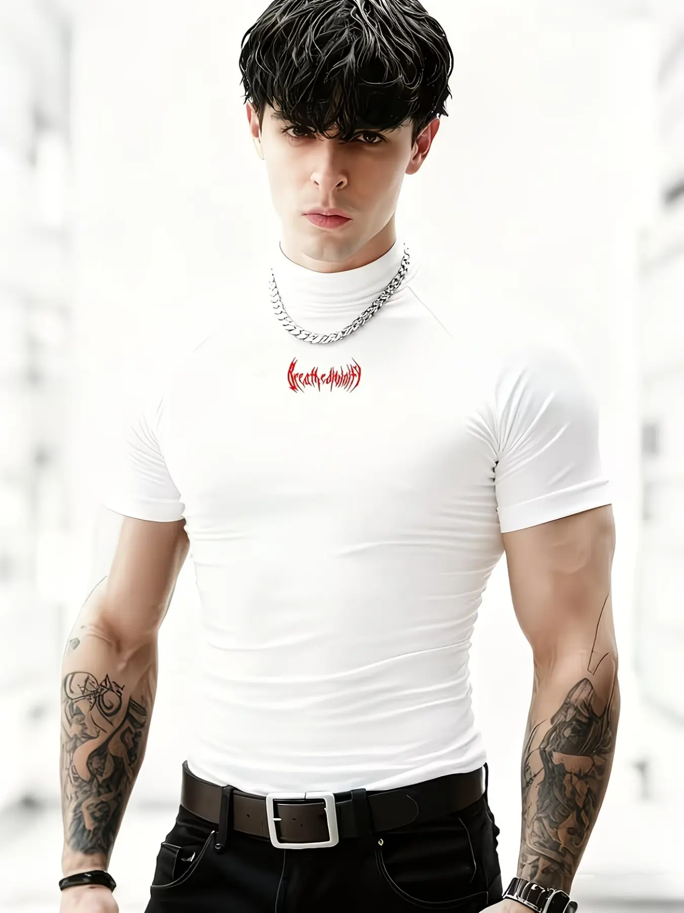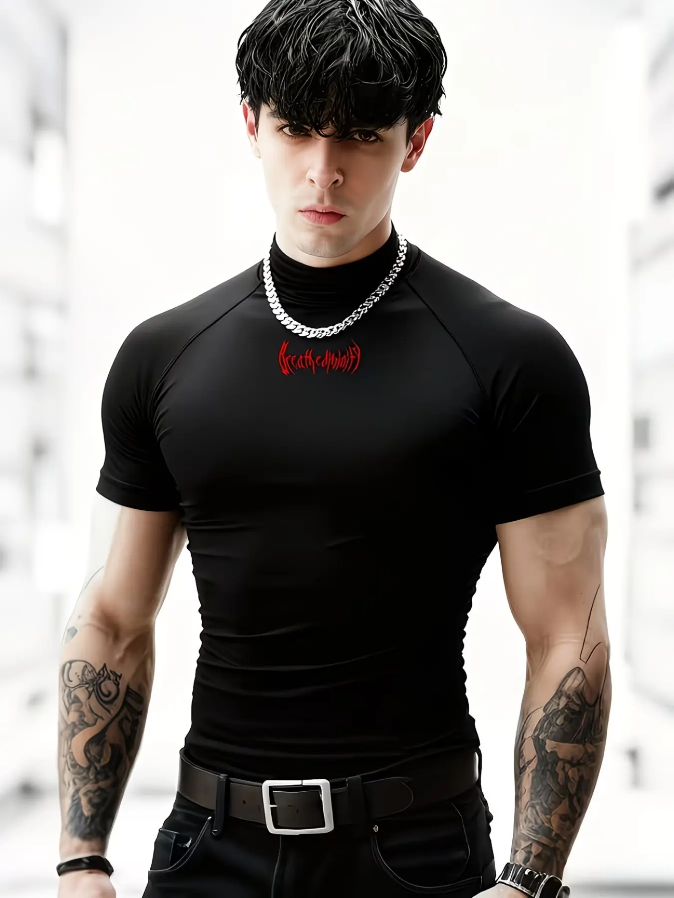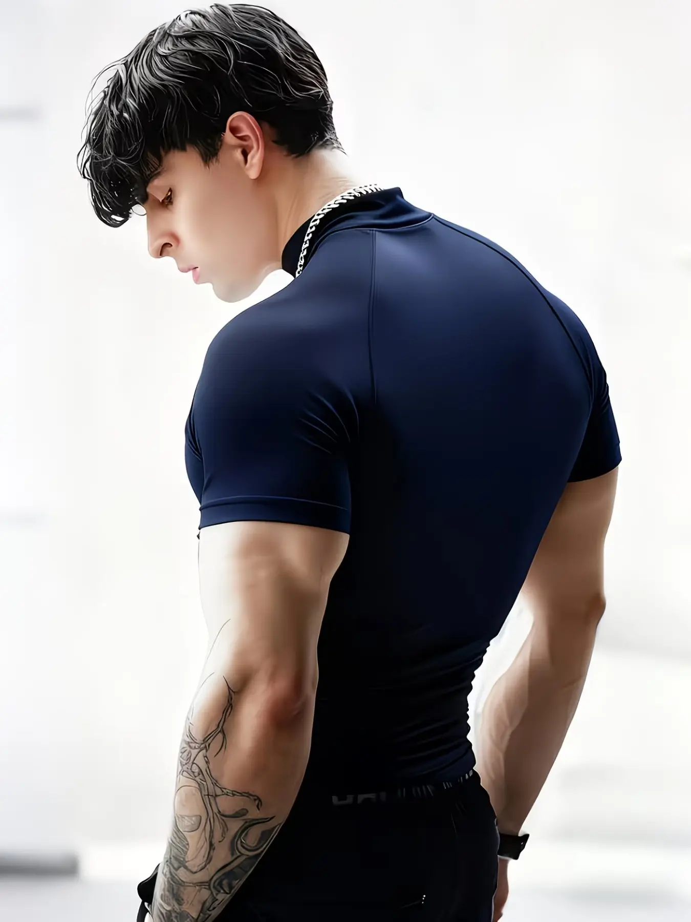 Men's Thorn Print High Neck Tight Fit Short Sleeve Gym Quick Dry Elastic Training Top, Sporty Casual Bottoms, All Seasons Wear