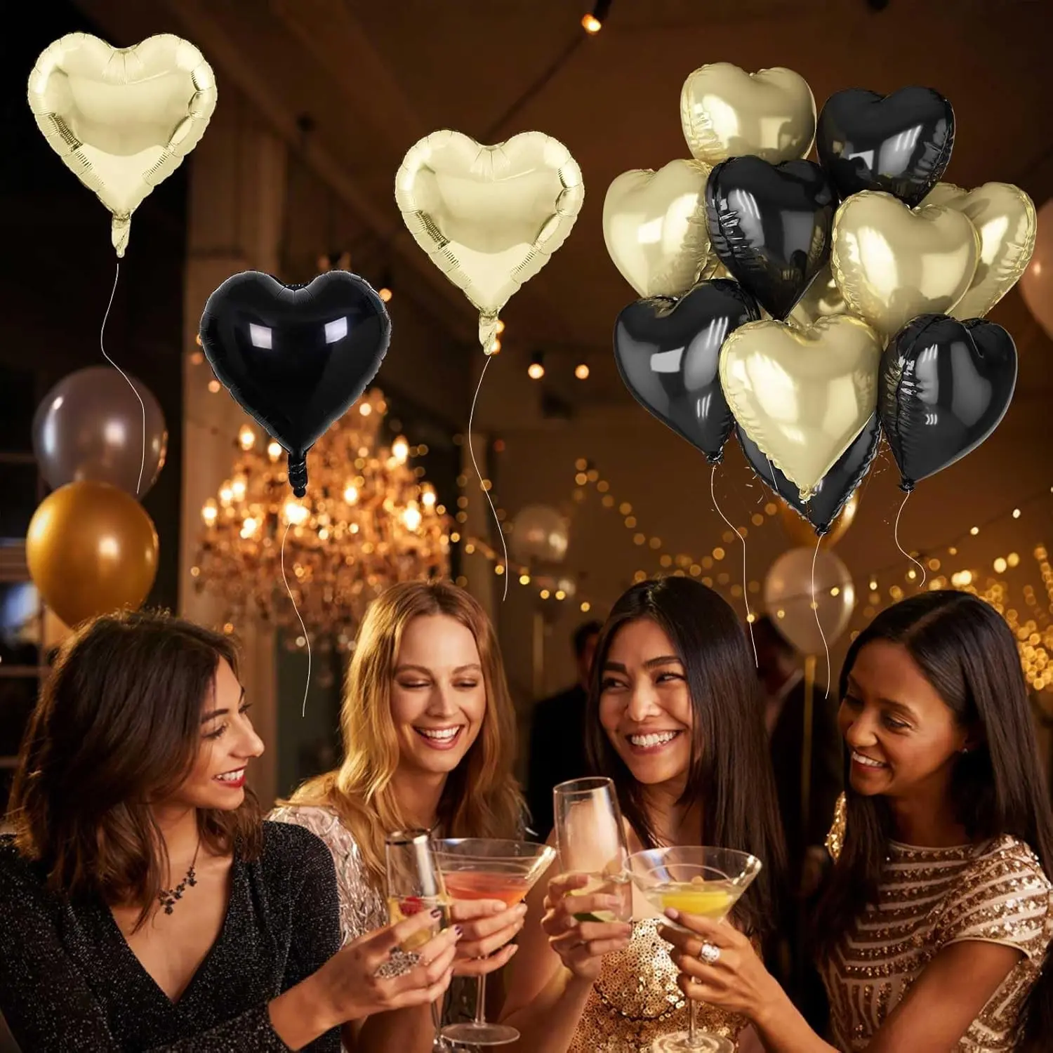 Black gold aluminum foil heart-shaped balloons, 18 inch 10 pack heart-shaped balloons with two accessories, suitable for occasions such as birthdays, graduation ceremonies, Valentine's Day, baby parties, anniversaries, etc.