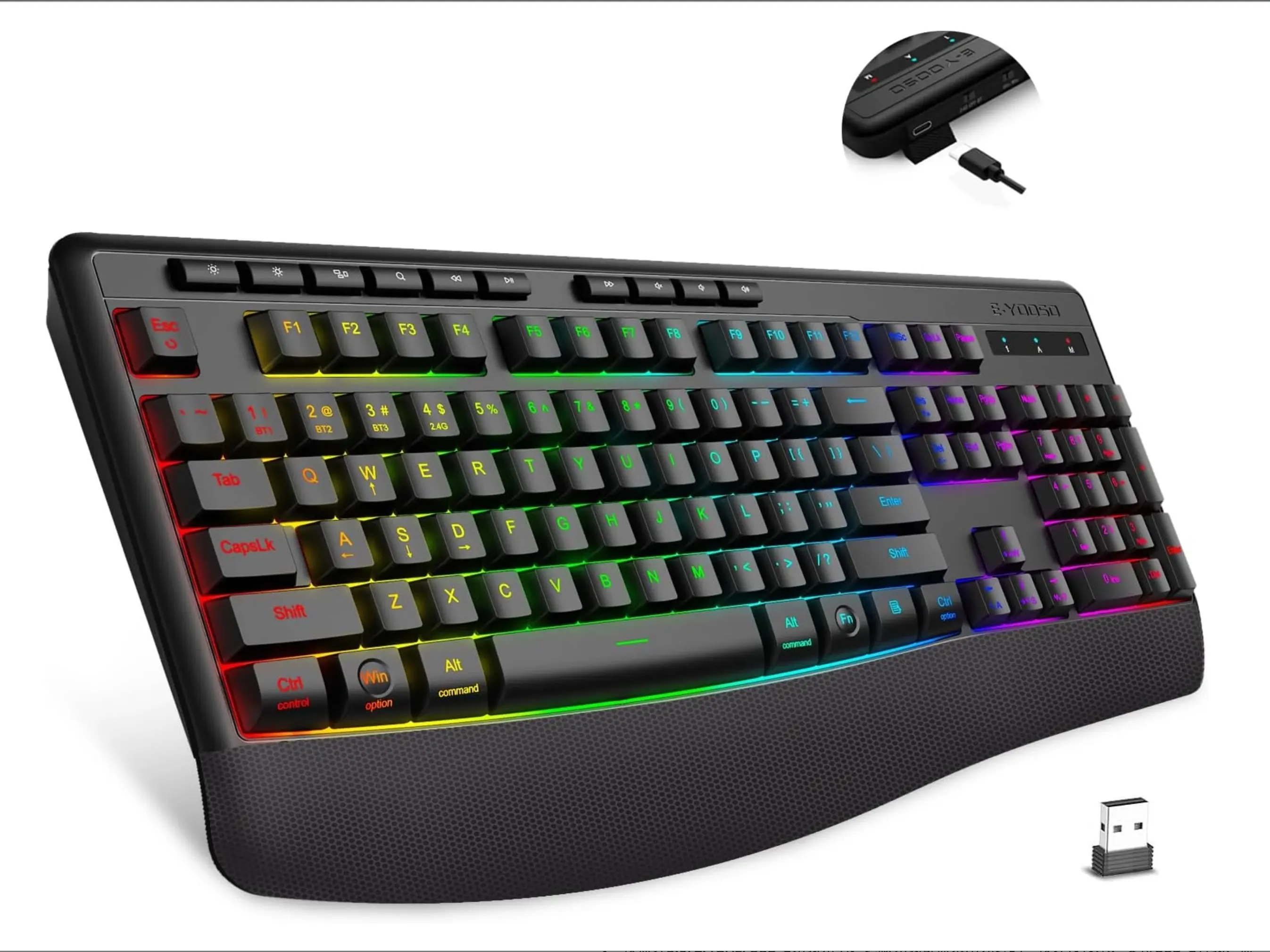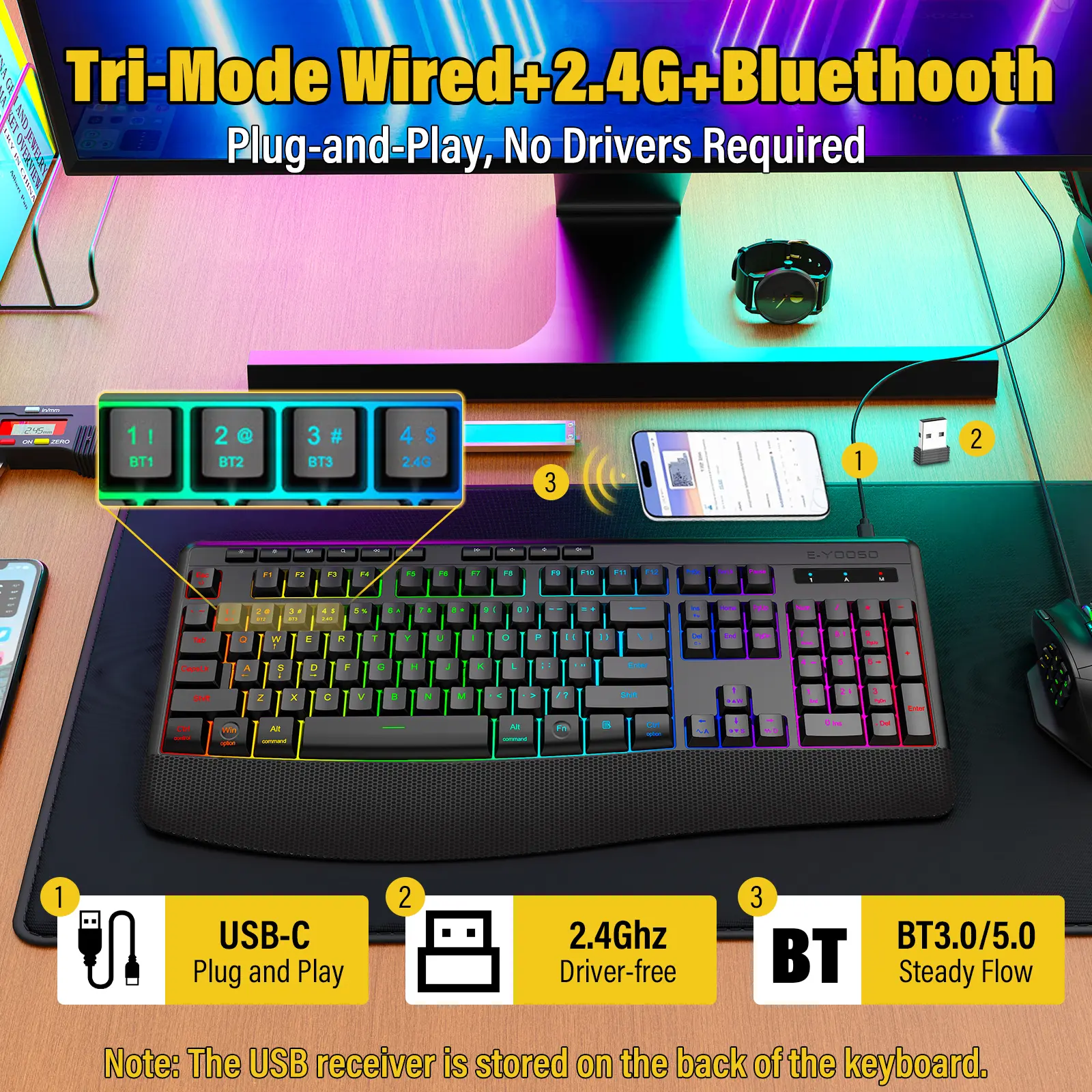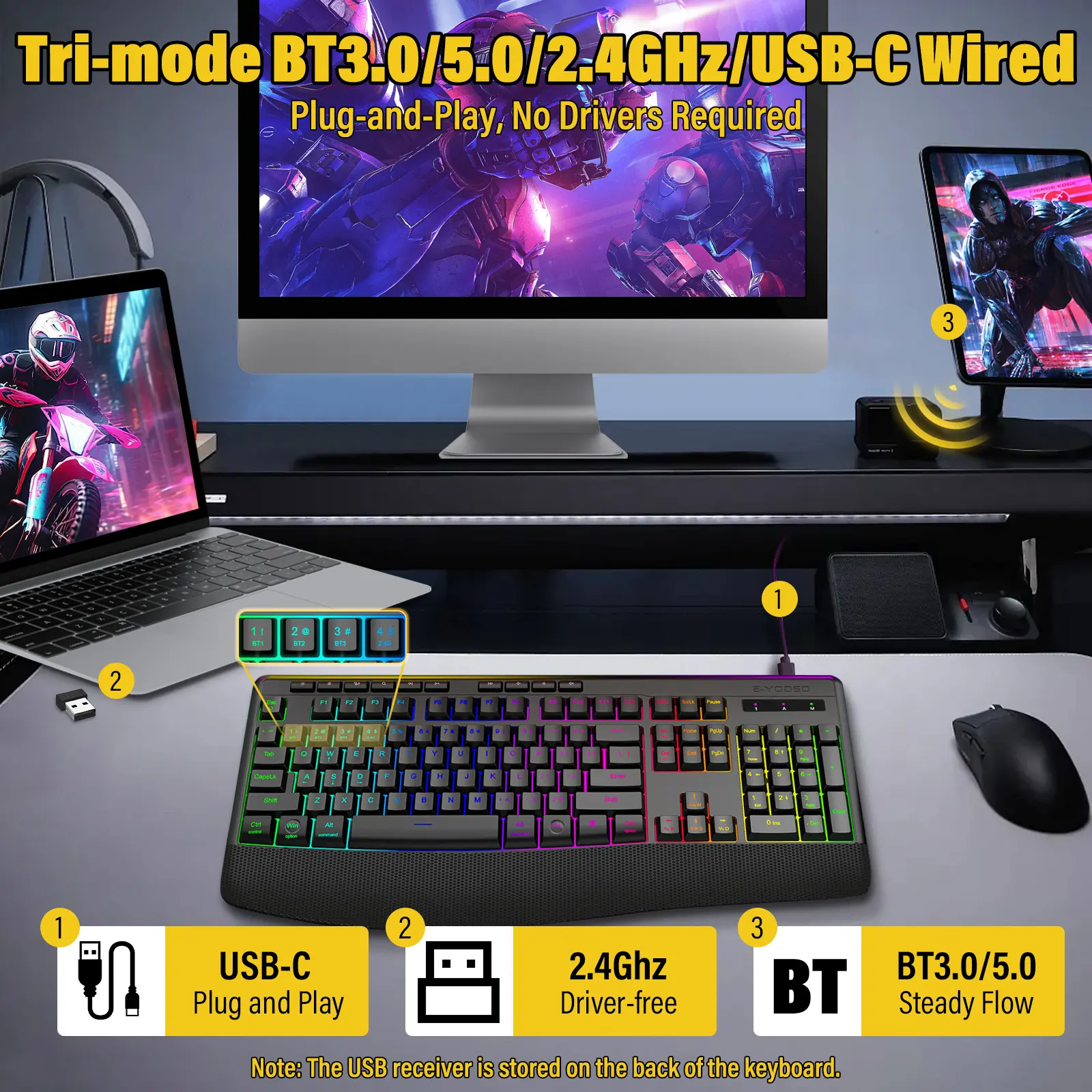 【Connect Everything - Tri-Mode Tech】 Switch seamlessly between Bluetooth 5.0/3.0, 2.4GHz Wireless, and USB-C Wired modes. Pair with your Laptop, Tablet, and Phone simultaneously. Plug & Play—no drivers needed!