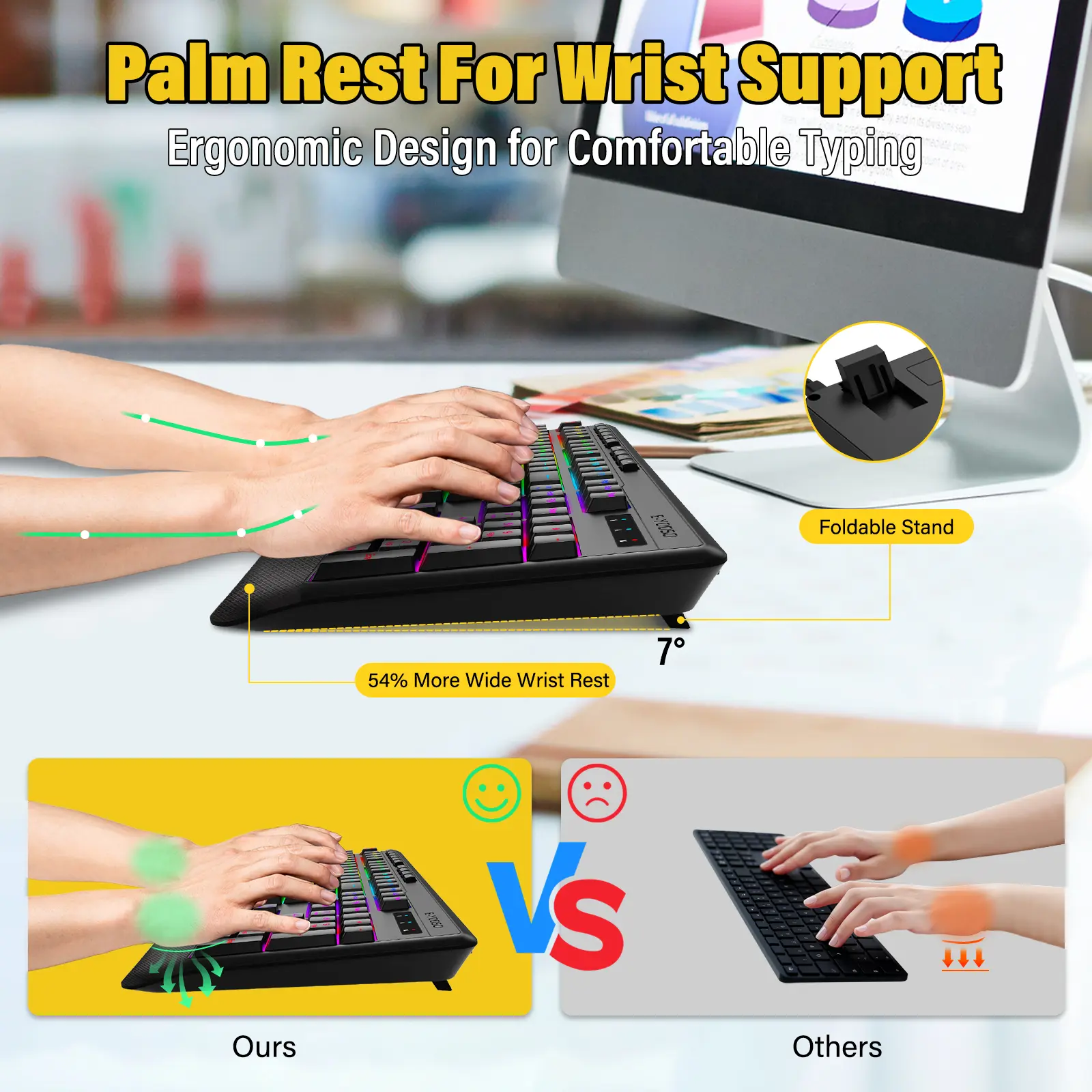 Ergonomics: Built-in Wrist Support + Adjustable Tilt Legs