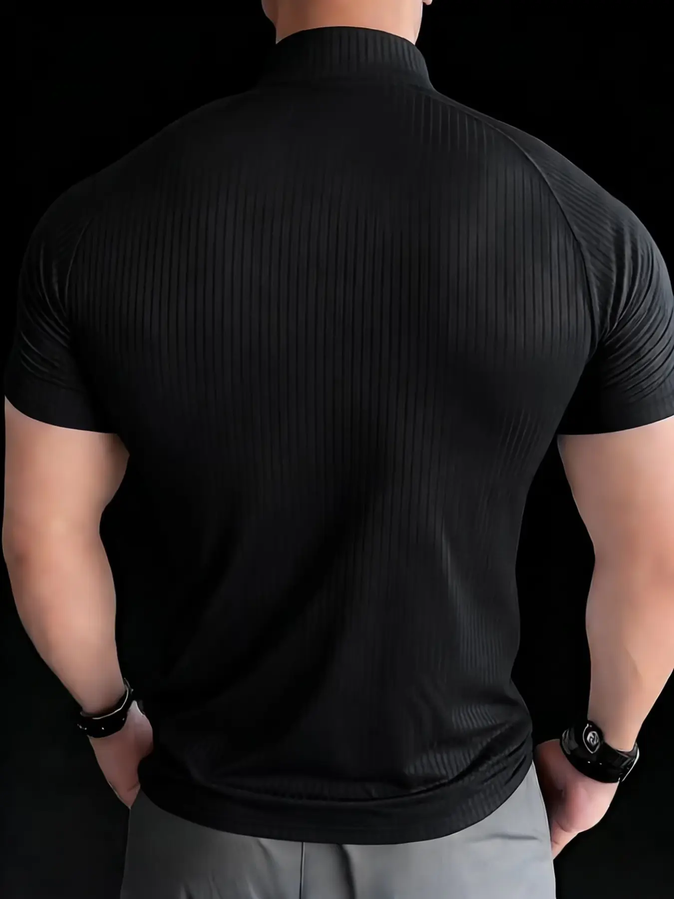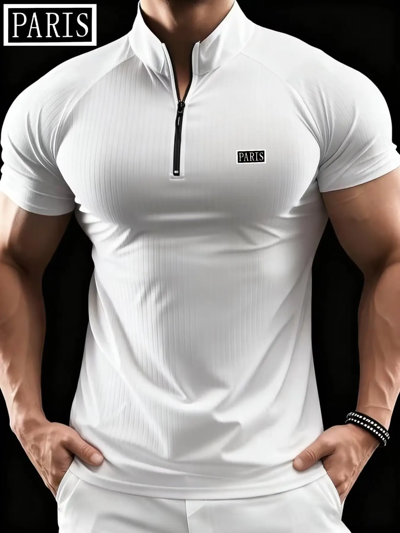 Men's Paris Stand Collar Polo Shirt, Elastic Ribbed Slim Fit, Muscle Show, Casual Sportswear, All Seasons, Loose-Fitting, Plain Pattern