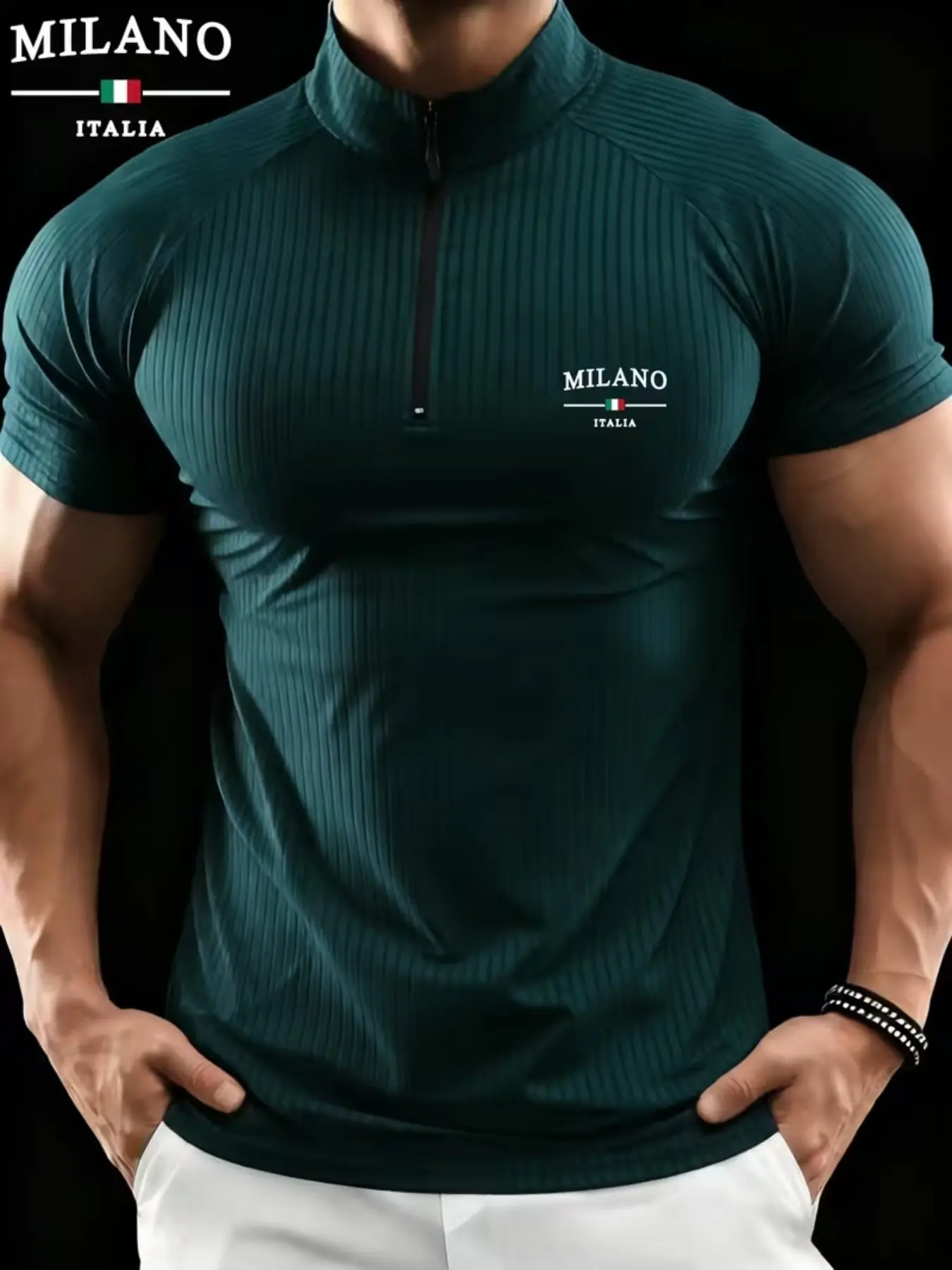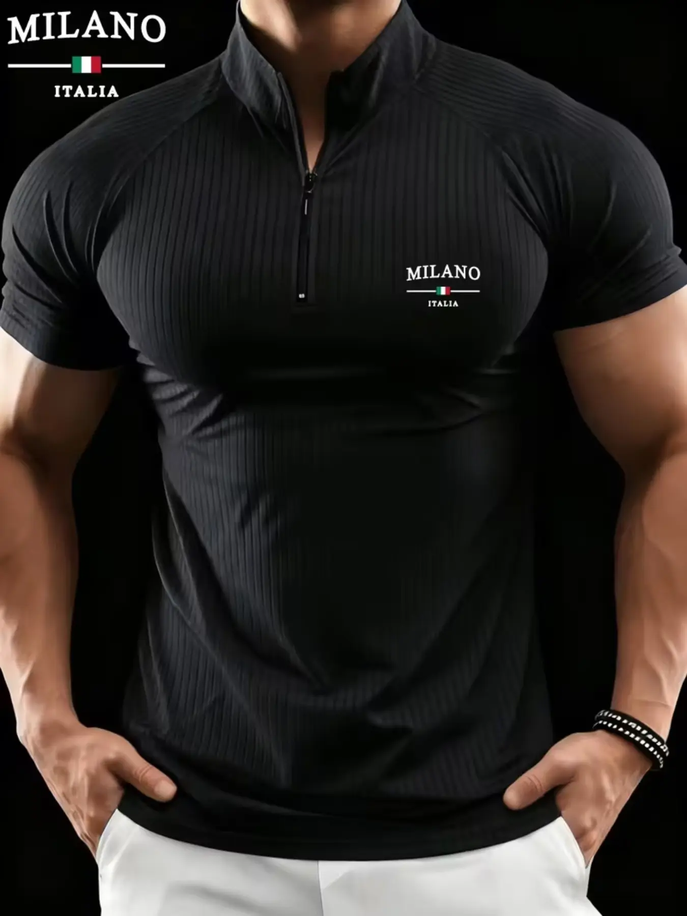 Men's Milano Stand Collar Polo Shirt, Elastic Ribbed Slim Fit Muscle Show, Casual Sportswear, All Seasons, Loose-Fitting, Zipper Design