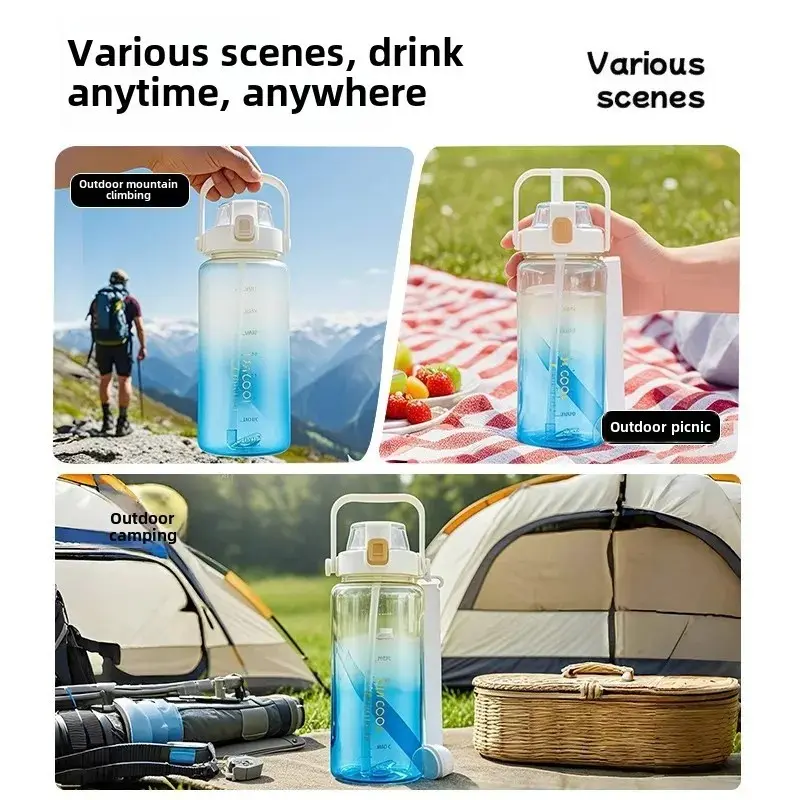 This water bottle is engineered for maximum versatility. Its large but manageable size, coupled with the convenient strap and handle, makes it ideal for outdoor mountain climbing, camping, picnics, and other adventures. It fits well in hand and is great for drink anytime, anywhere—perfect for fitness enthusiasts and explorers alike.