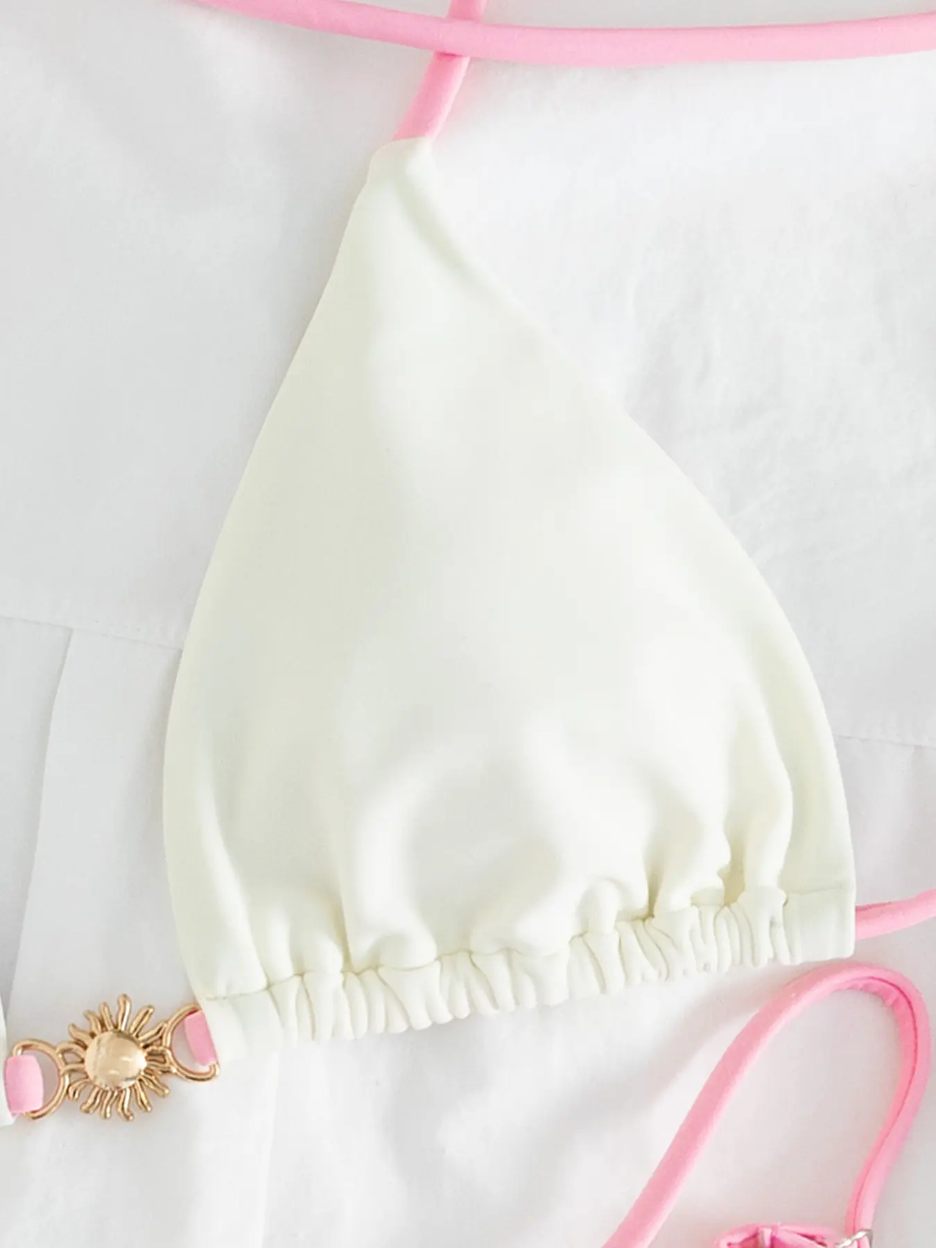 Women's Sexy Swimwear Set, Block, Metal Decoration Front Back Straps, Adjustable Side Tie Triangle Bottoms, Solid Bikinis