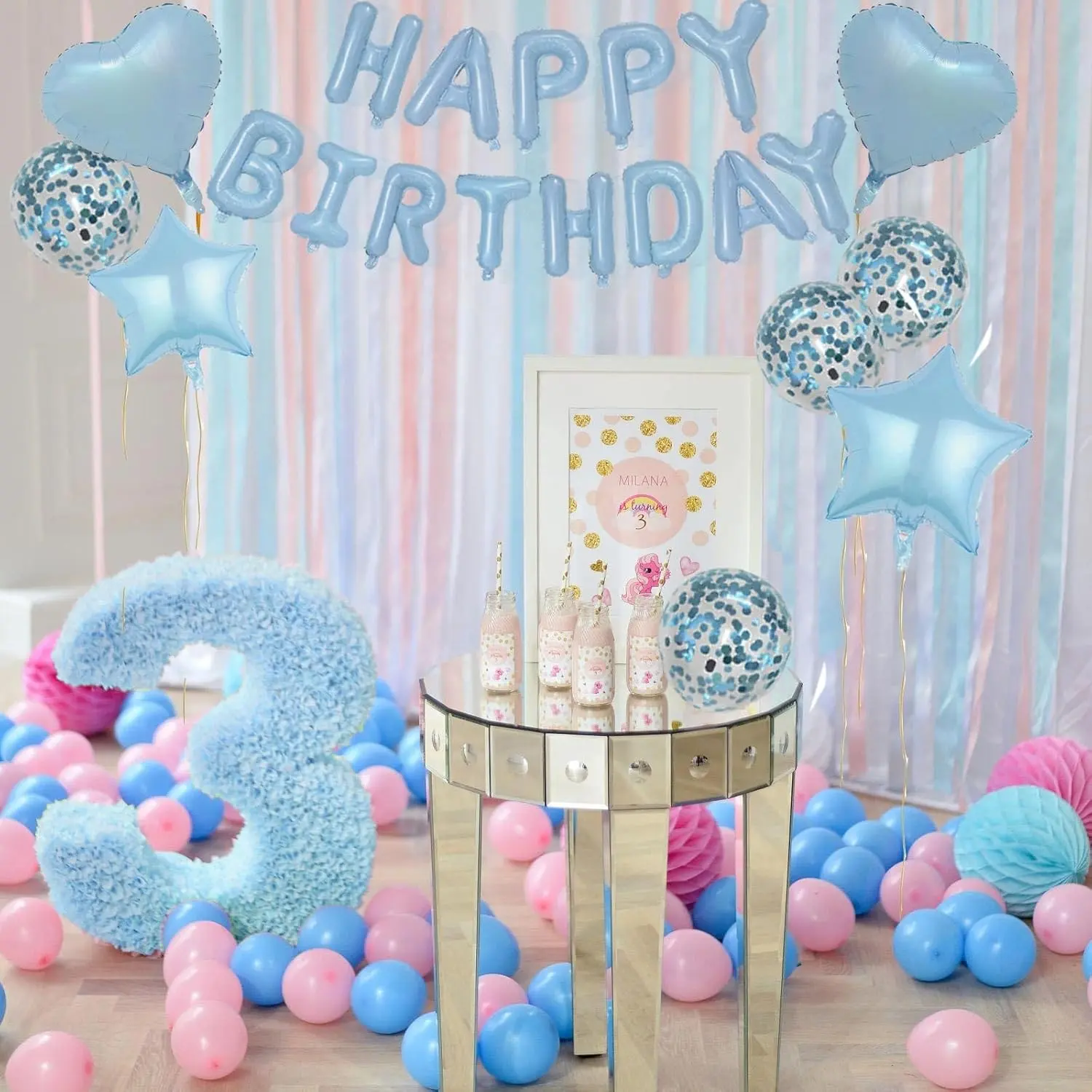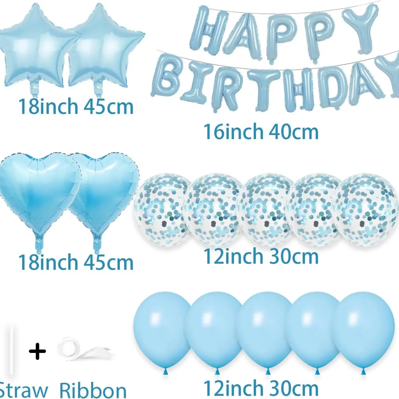 29 Pcs Light Blue Birthday Decorations, 3D Letters Light Blue Happy Birthday Balloon Banner, Pentagram Heart Foil Balloons Confetti Balloons Kit For Boys Girls Birthday Party Supplies