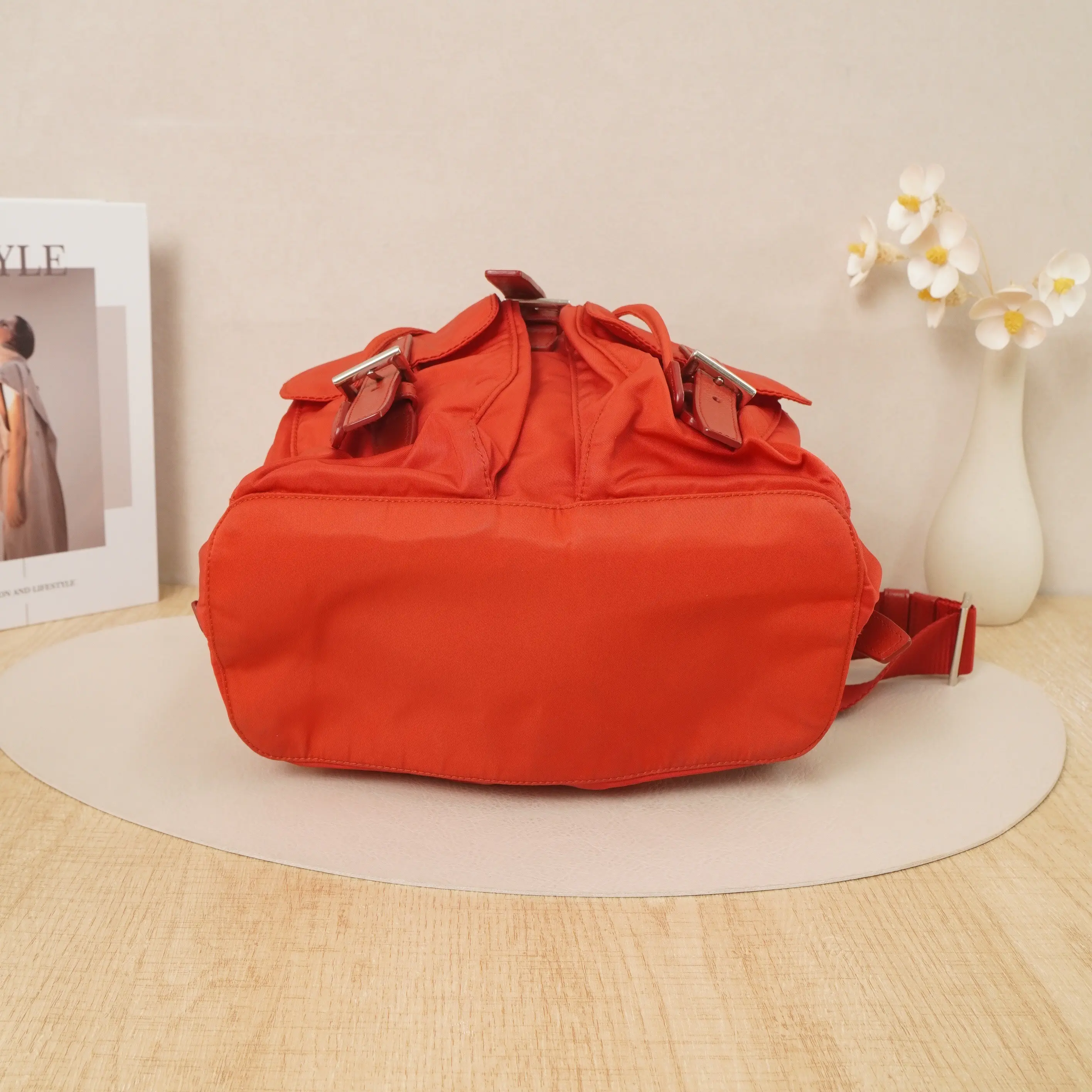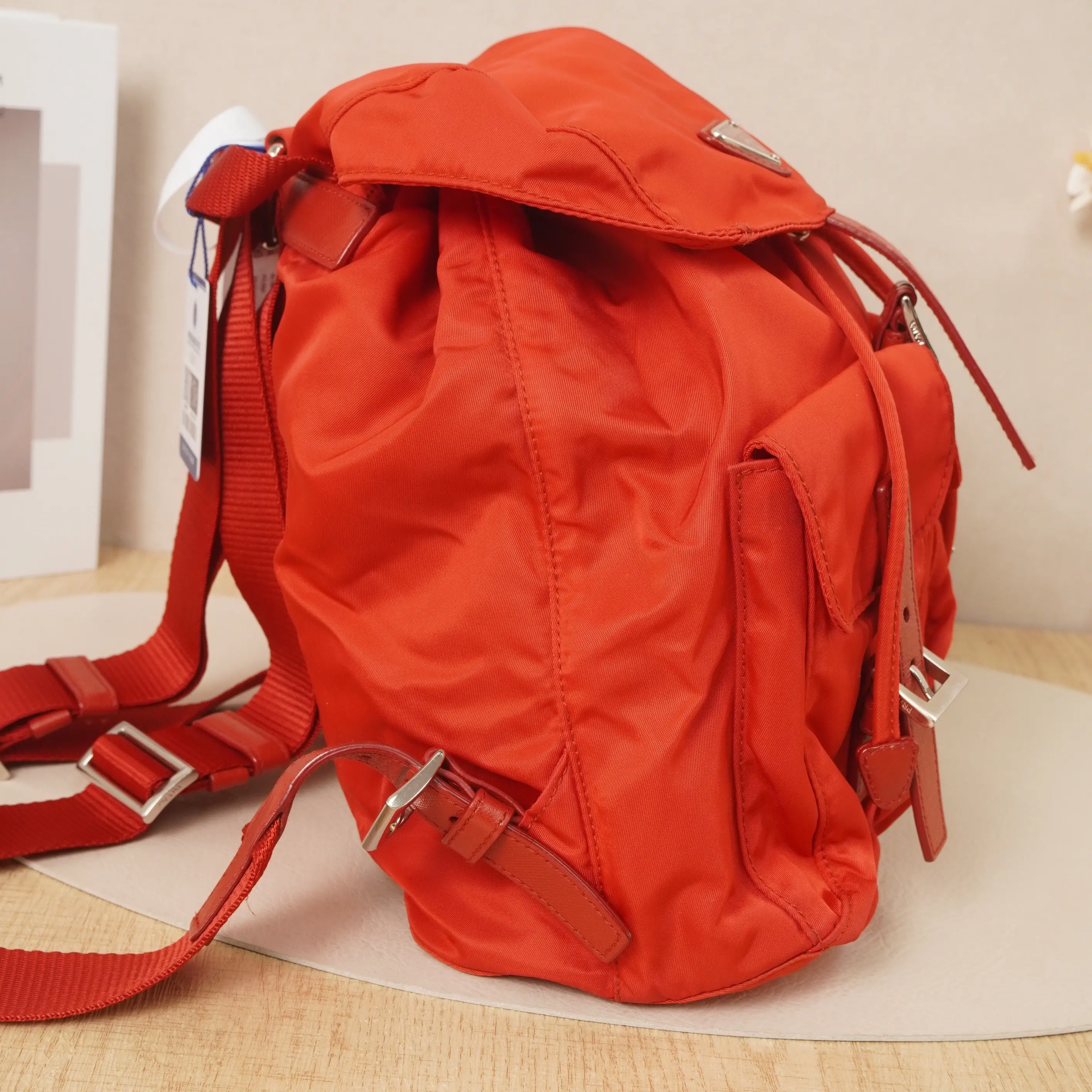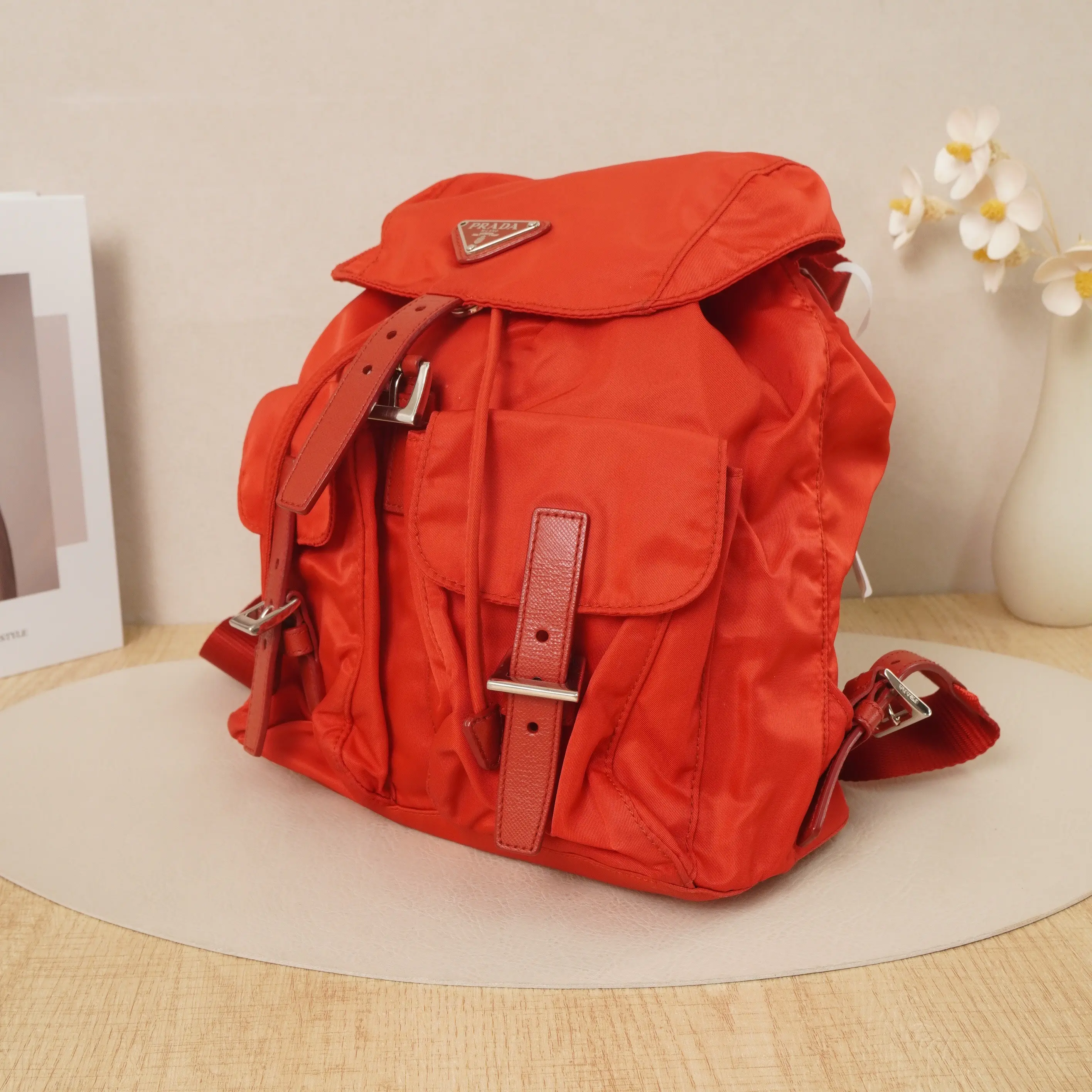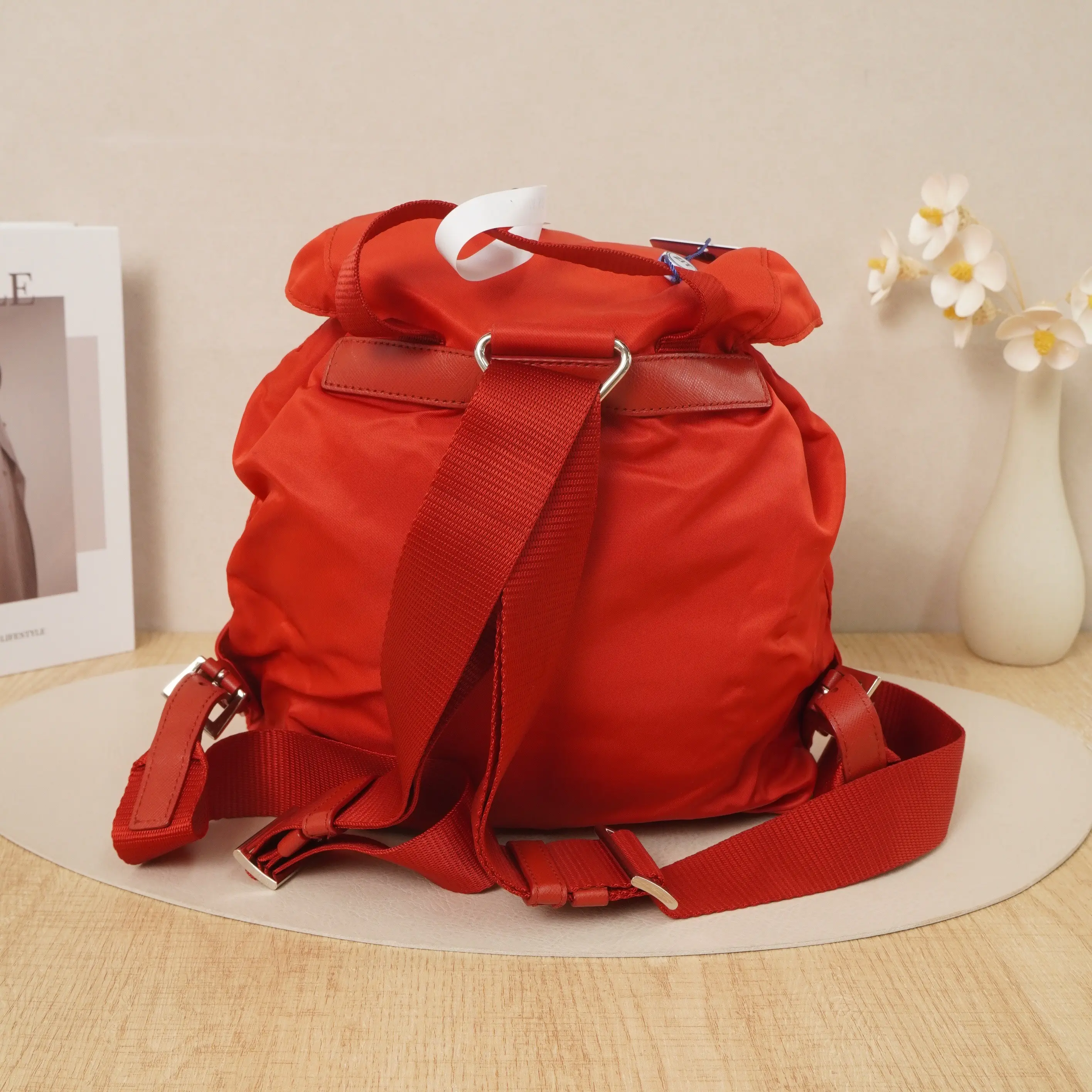 ·Design: Vibrant red nylon with leather accents, iconic silver-tone triangle logo, and drawstring closure.