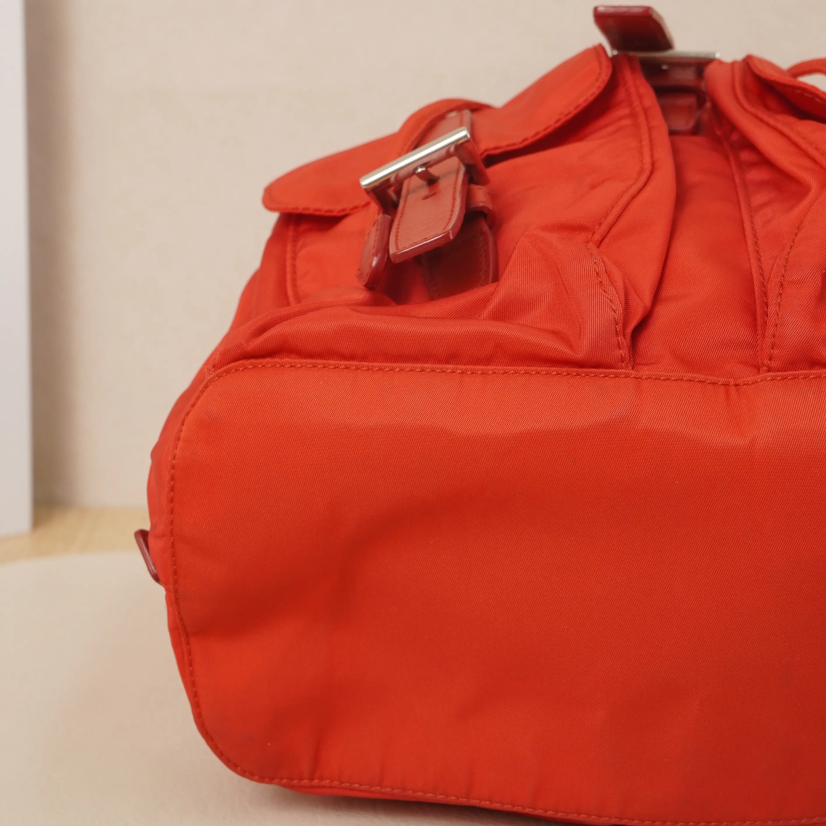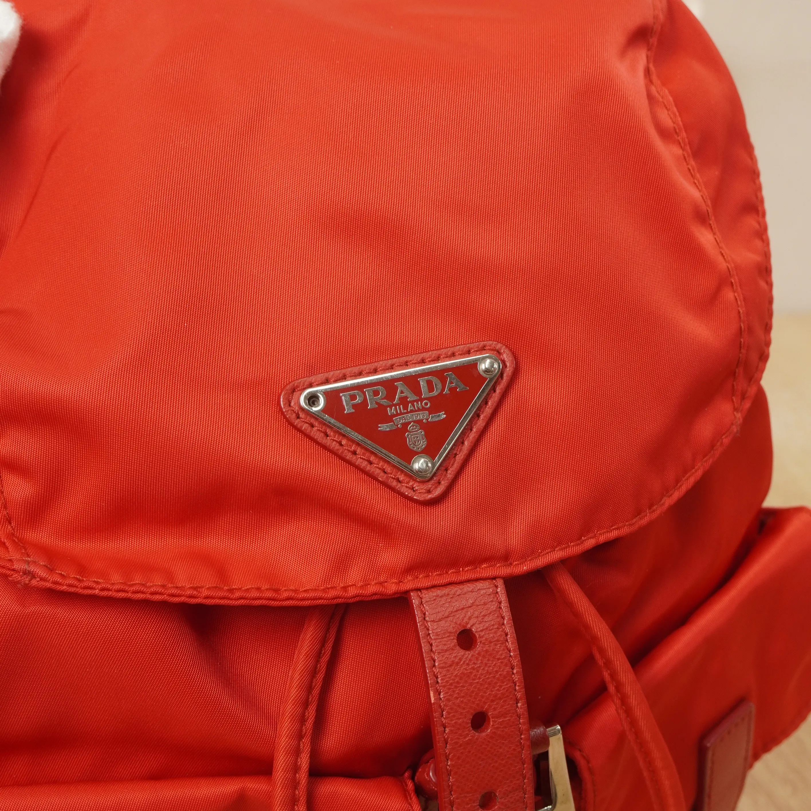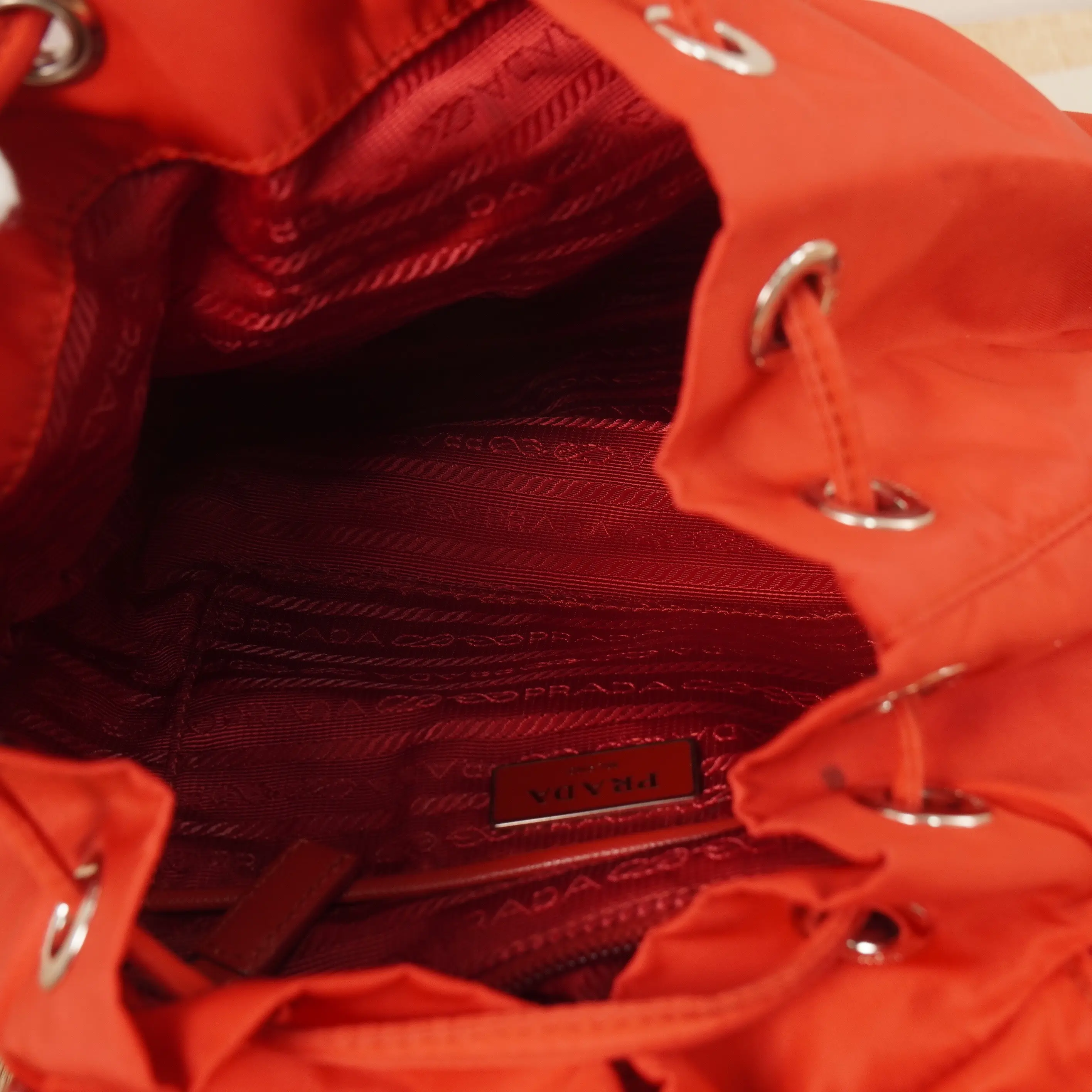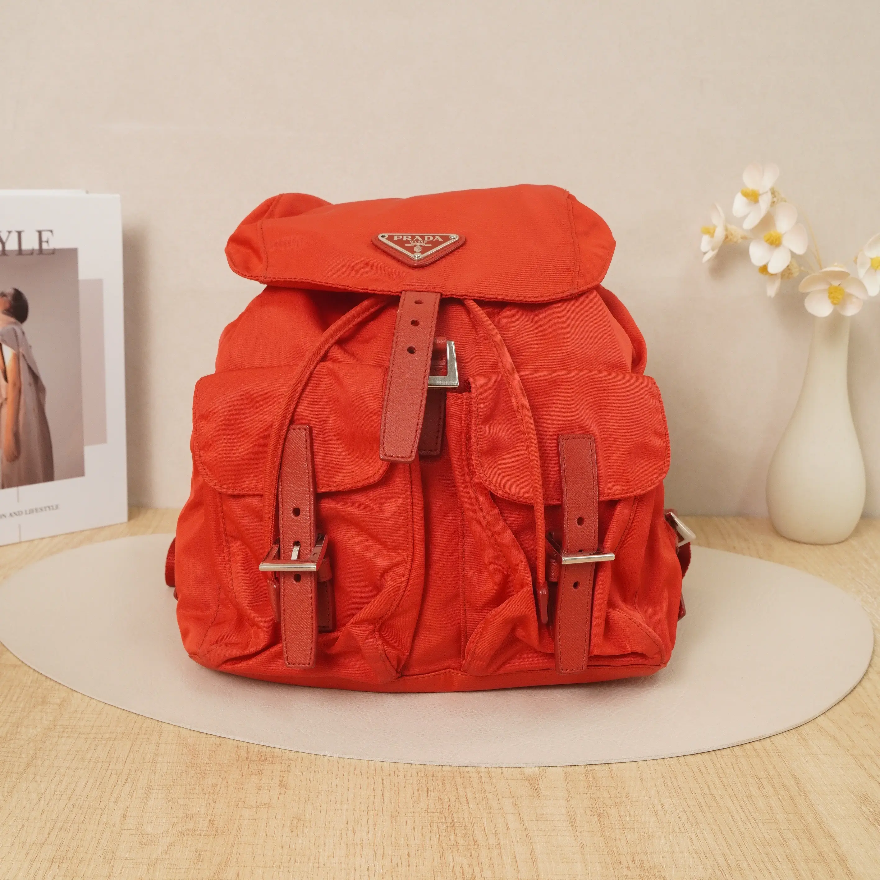 ·Design: Vibrant red nylon with leather accents, iconic silver-tone triangle logo, and drawstring closure.
