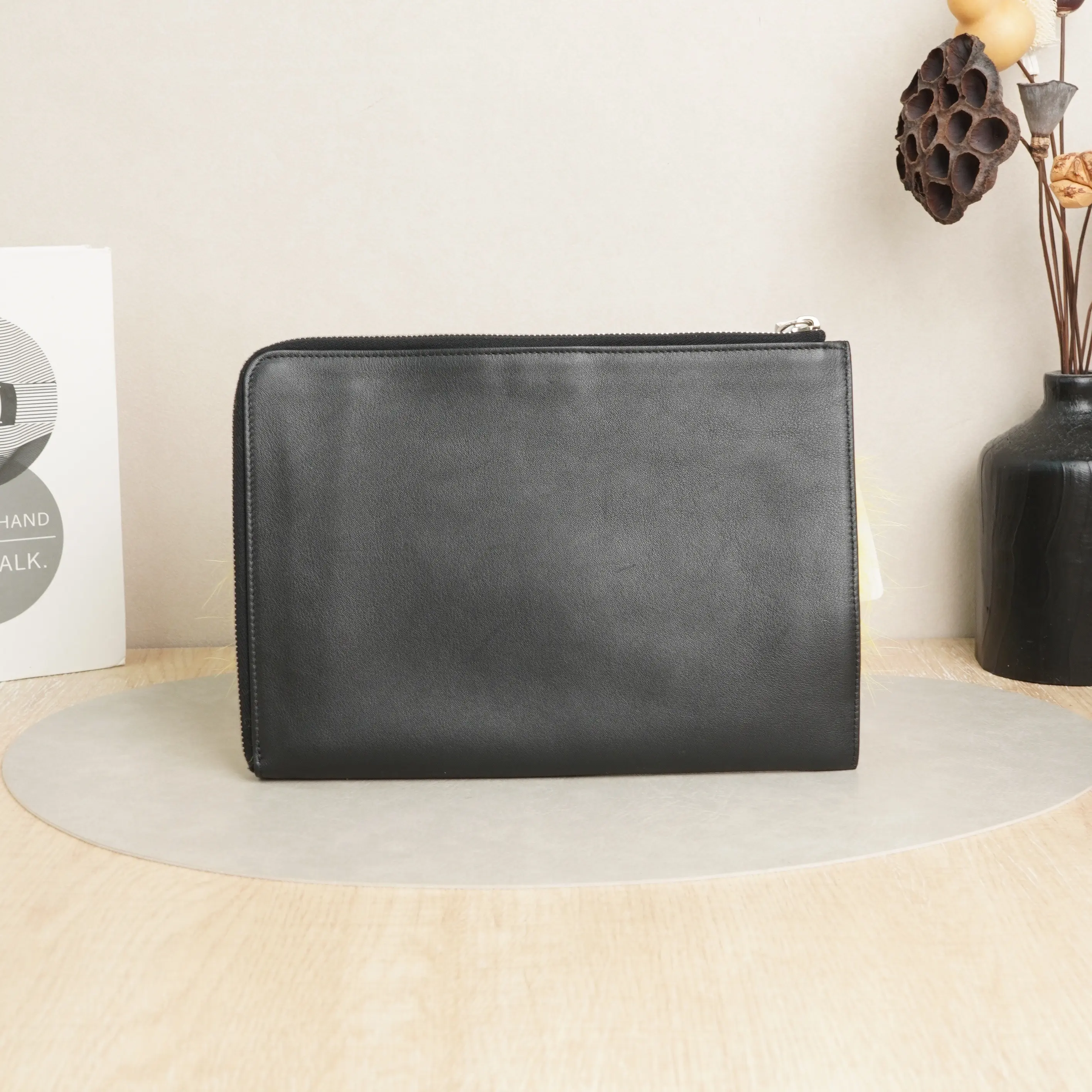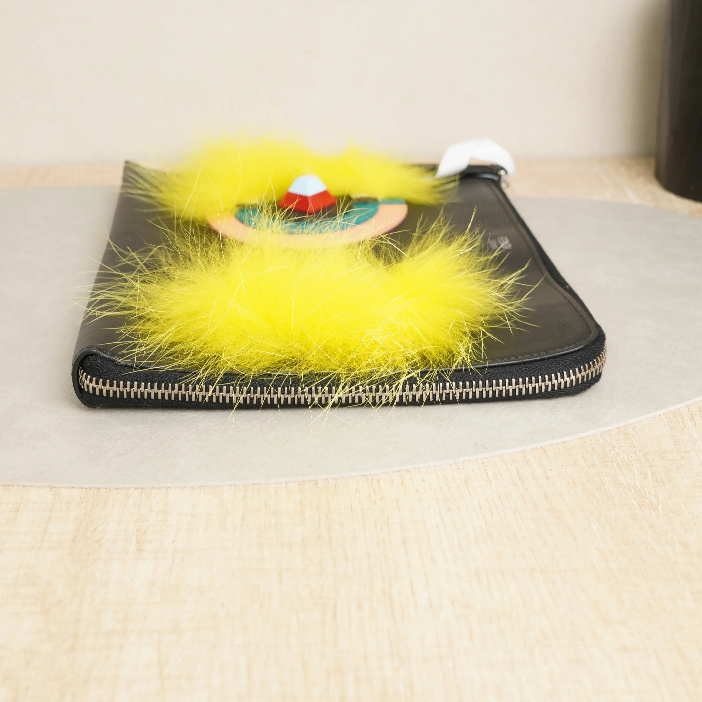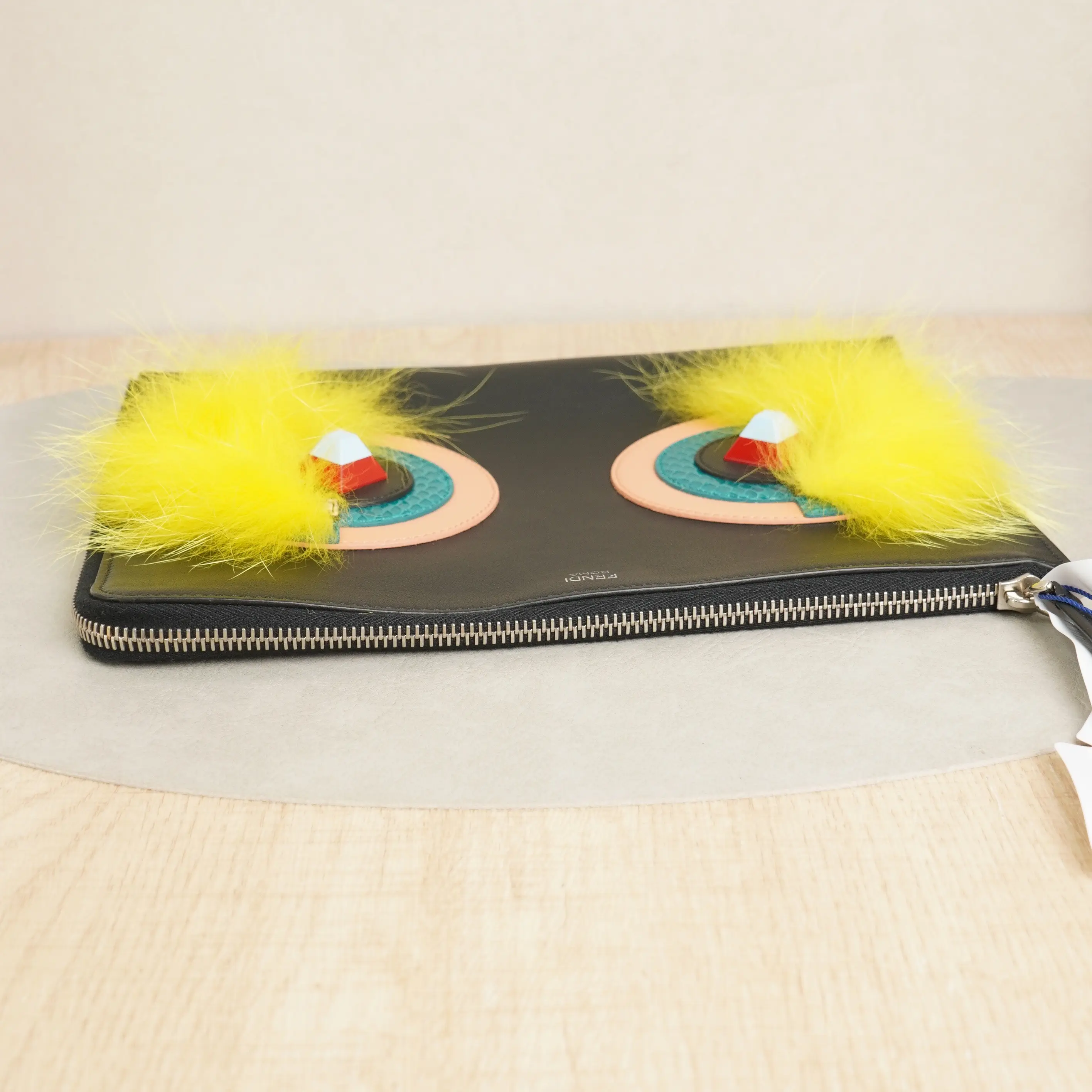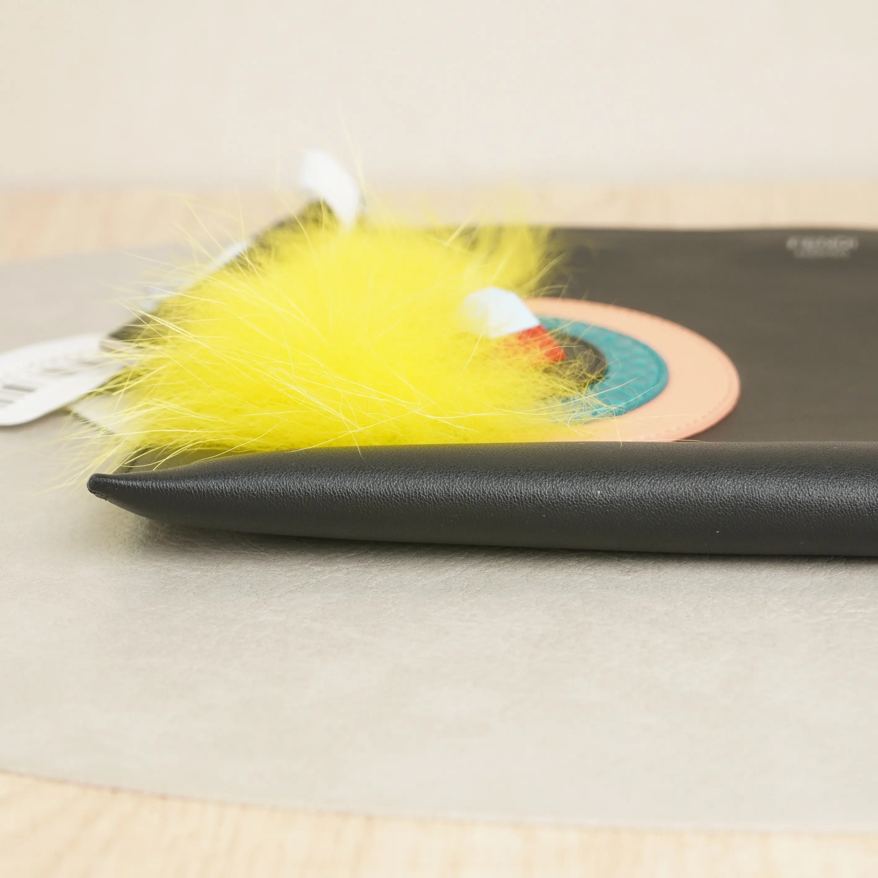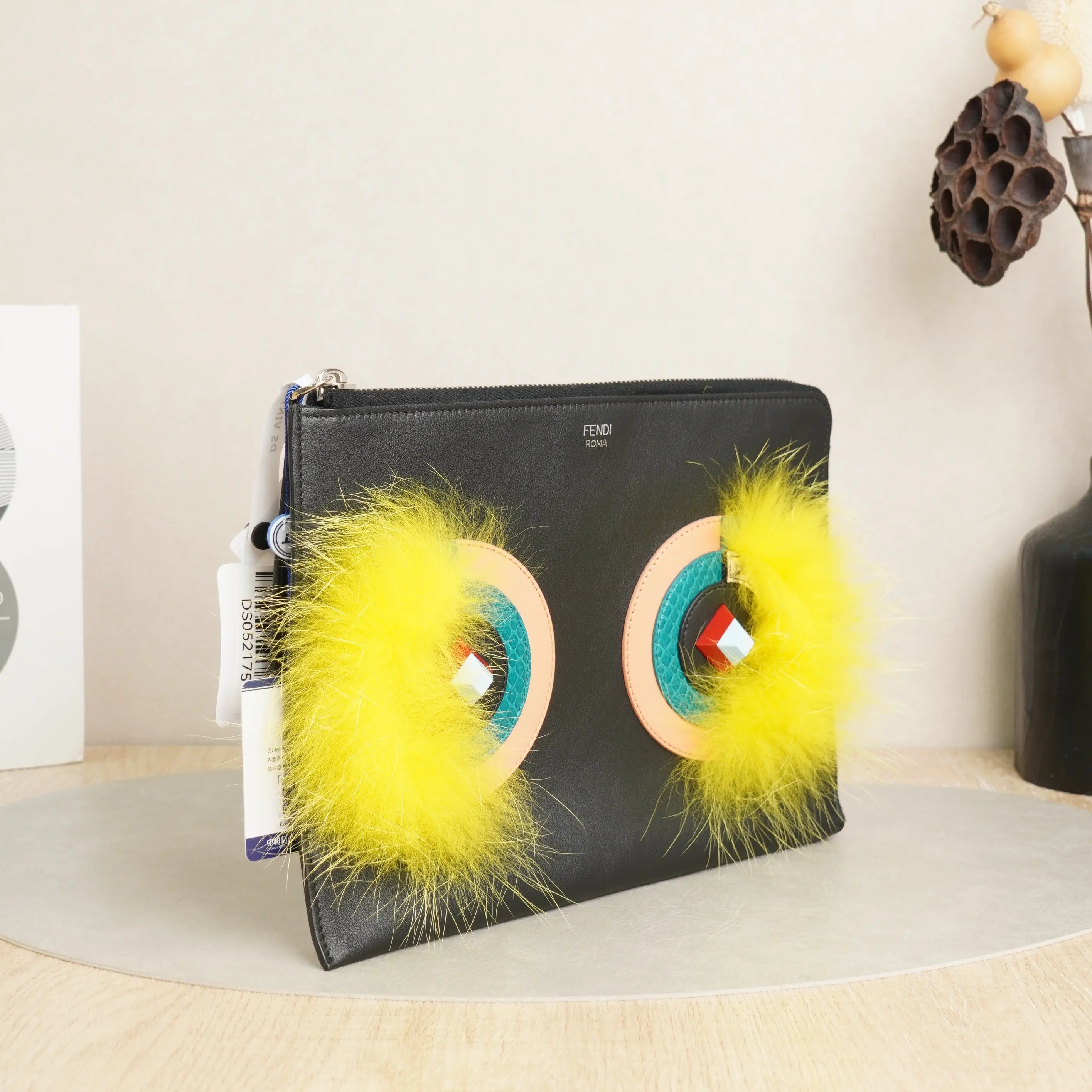 ·Design: Black calfskin leather with playful yellow fur monster eyes, colorful circular appliqués, and silver-tone zip closure.