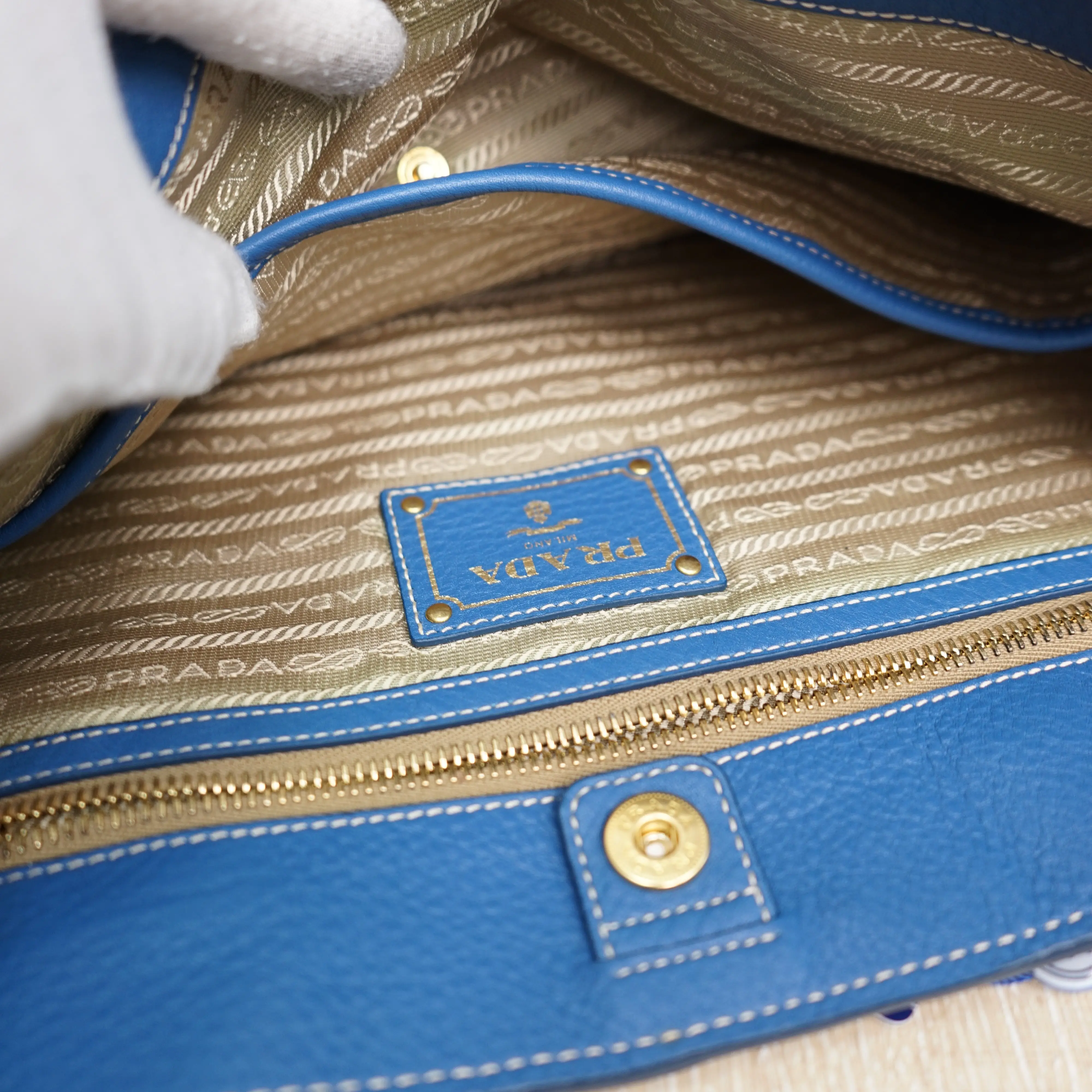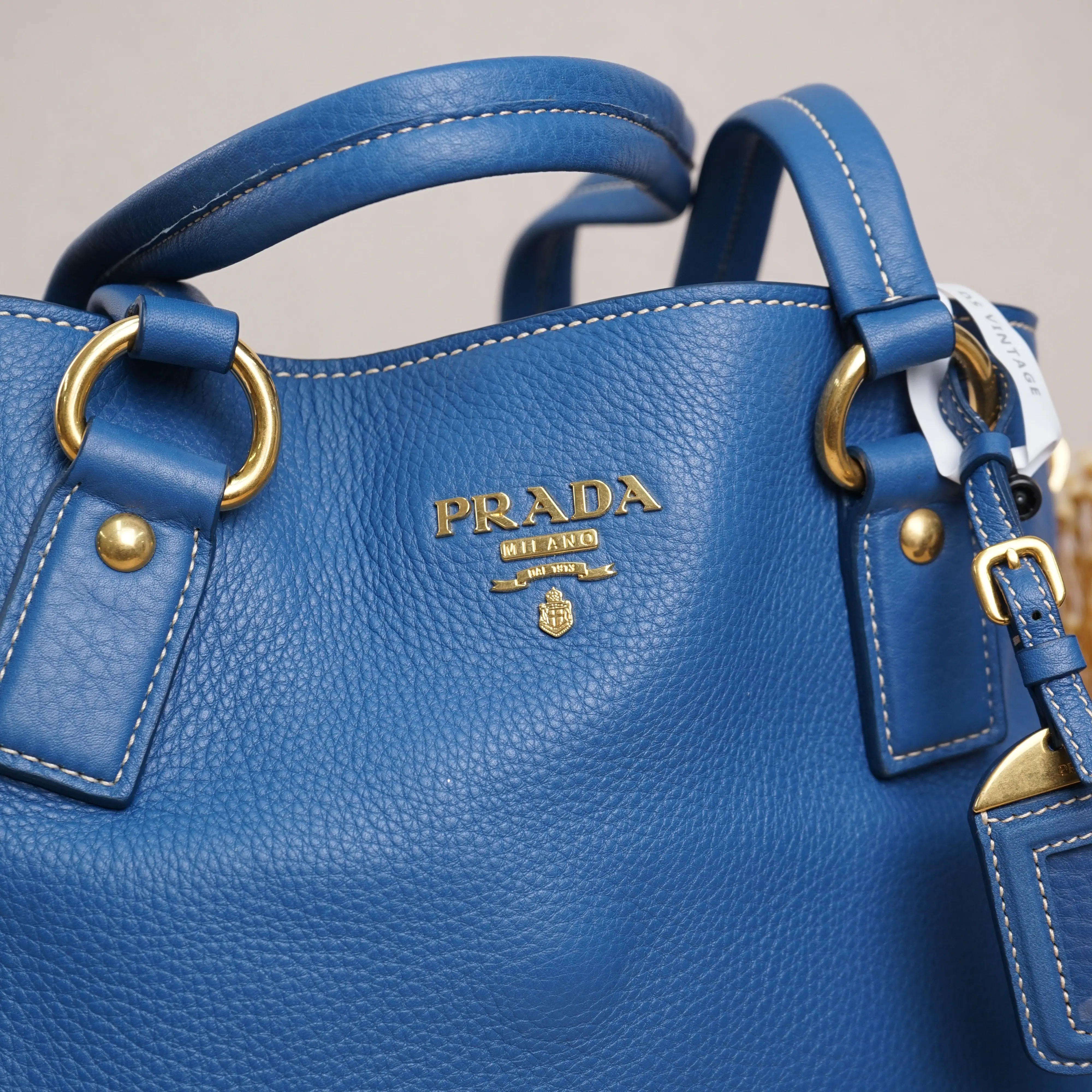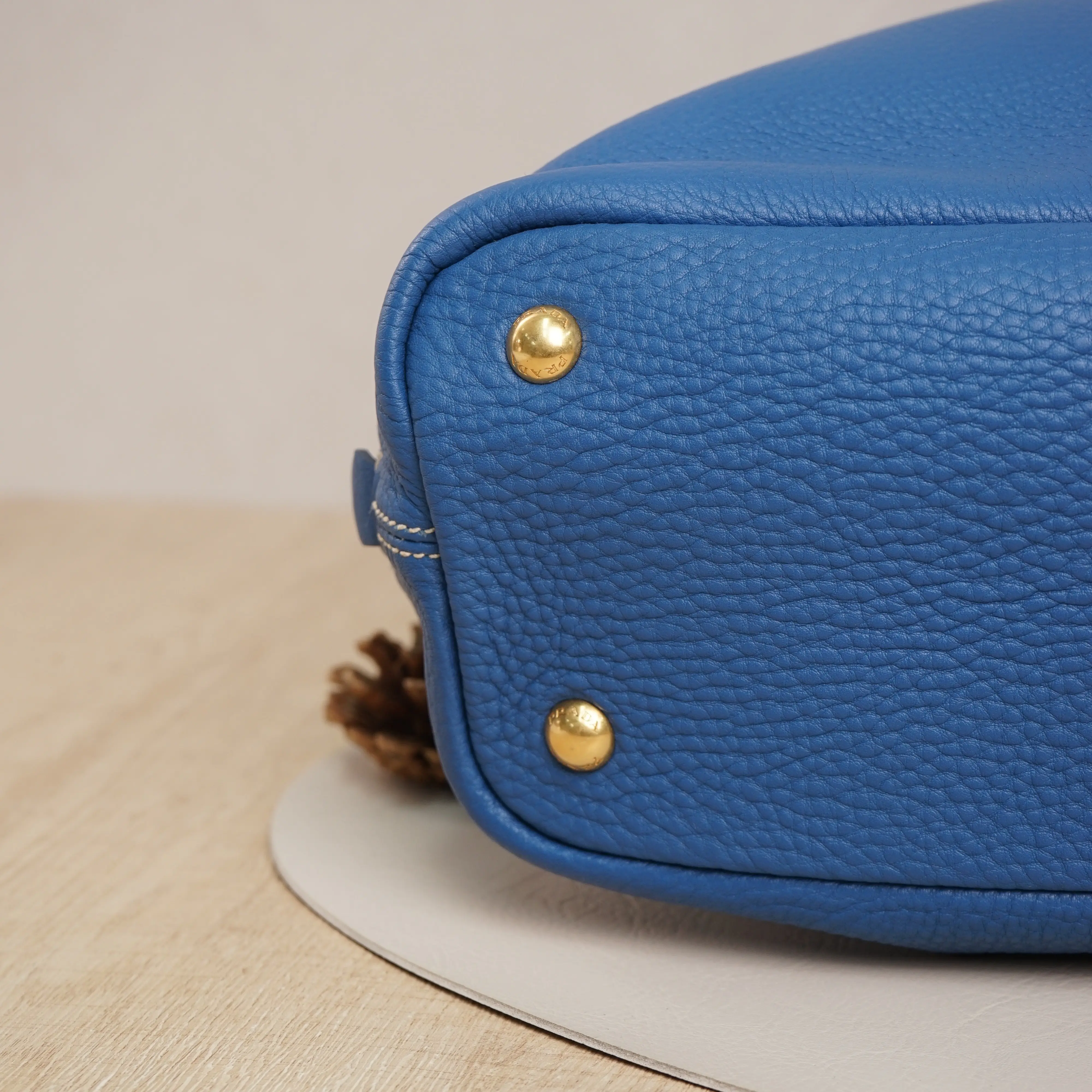 ·Design: Vibrant blue pebbled leather with gold-tone hardware, dual top handles, and a detachable shoulder strap.