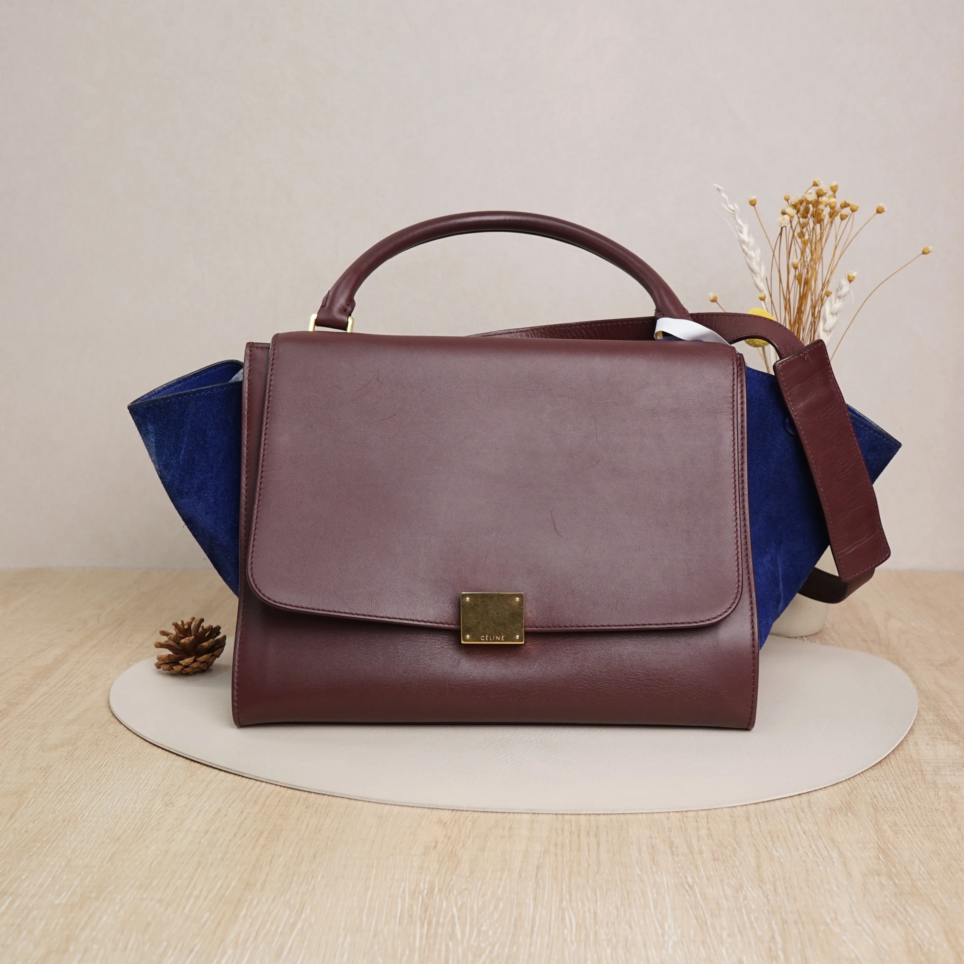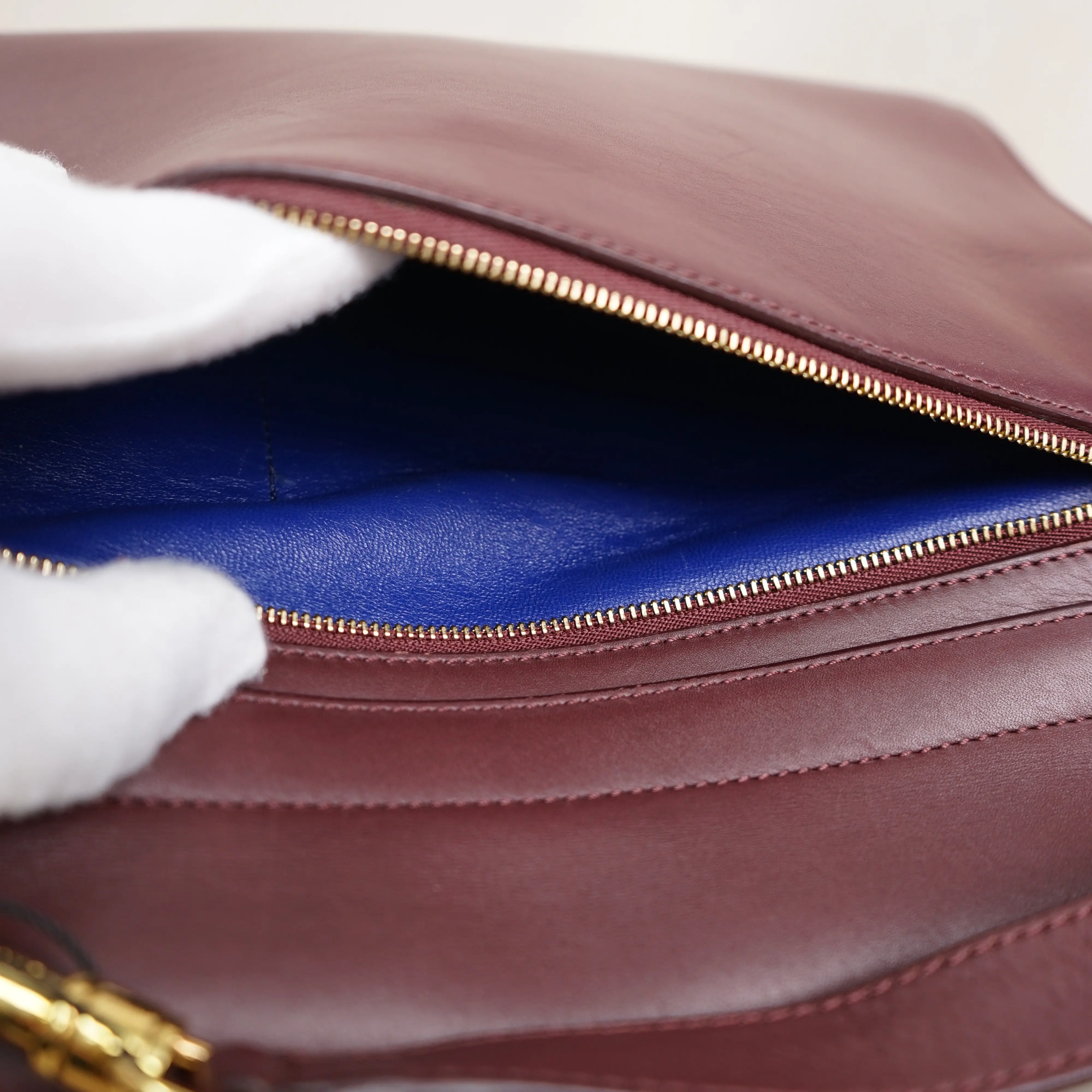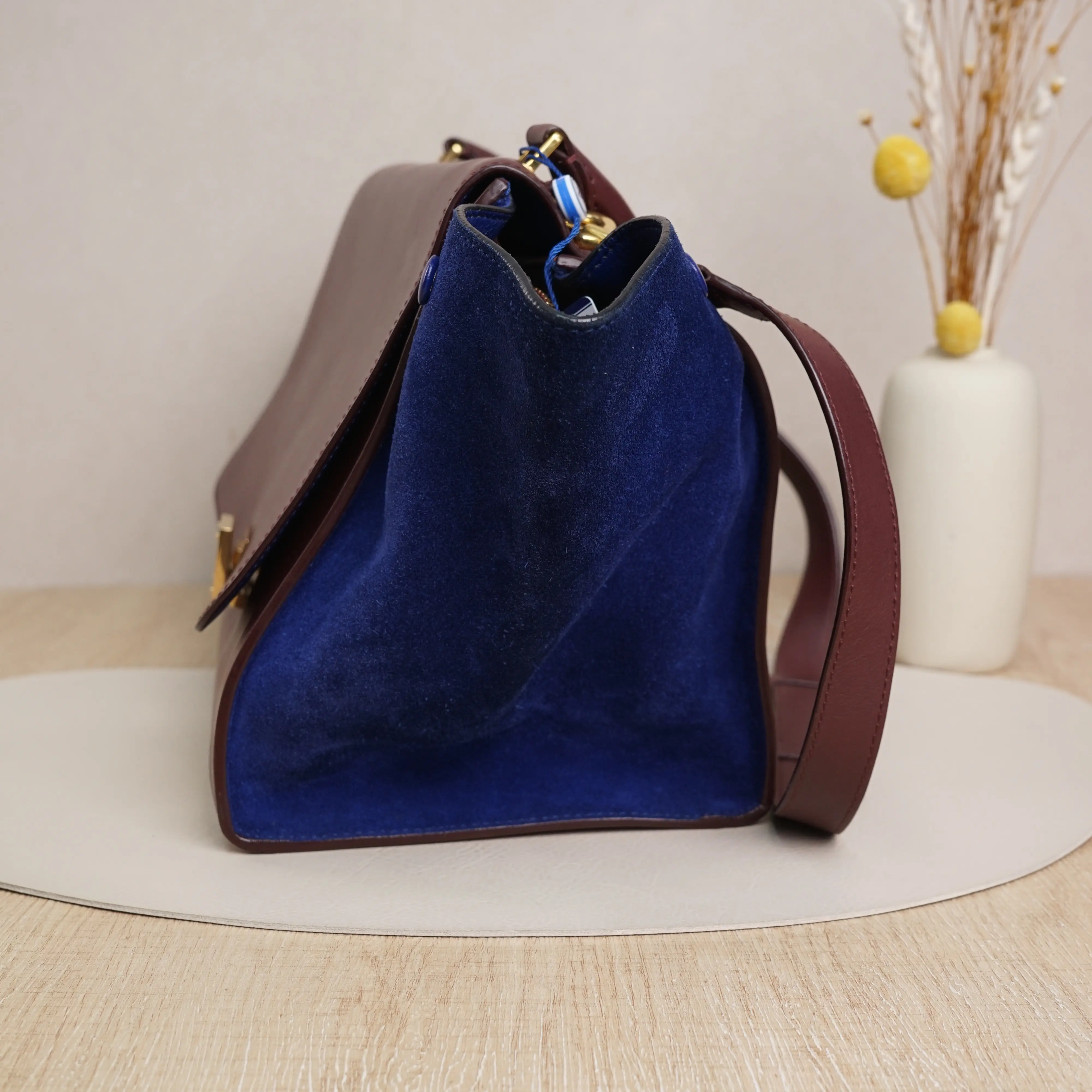 ·Design: Burgundy calfskin leather with blue suede side panels, gold-tone hardware, and a detachable shoulder strap.