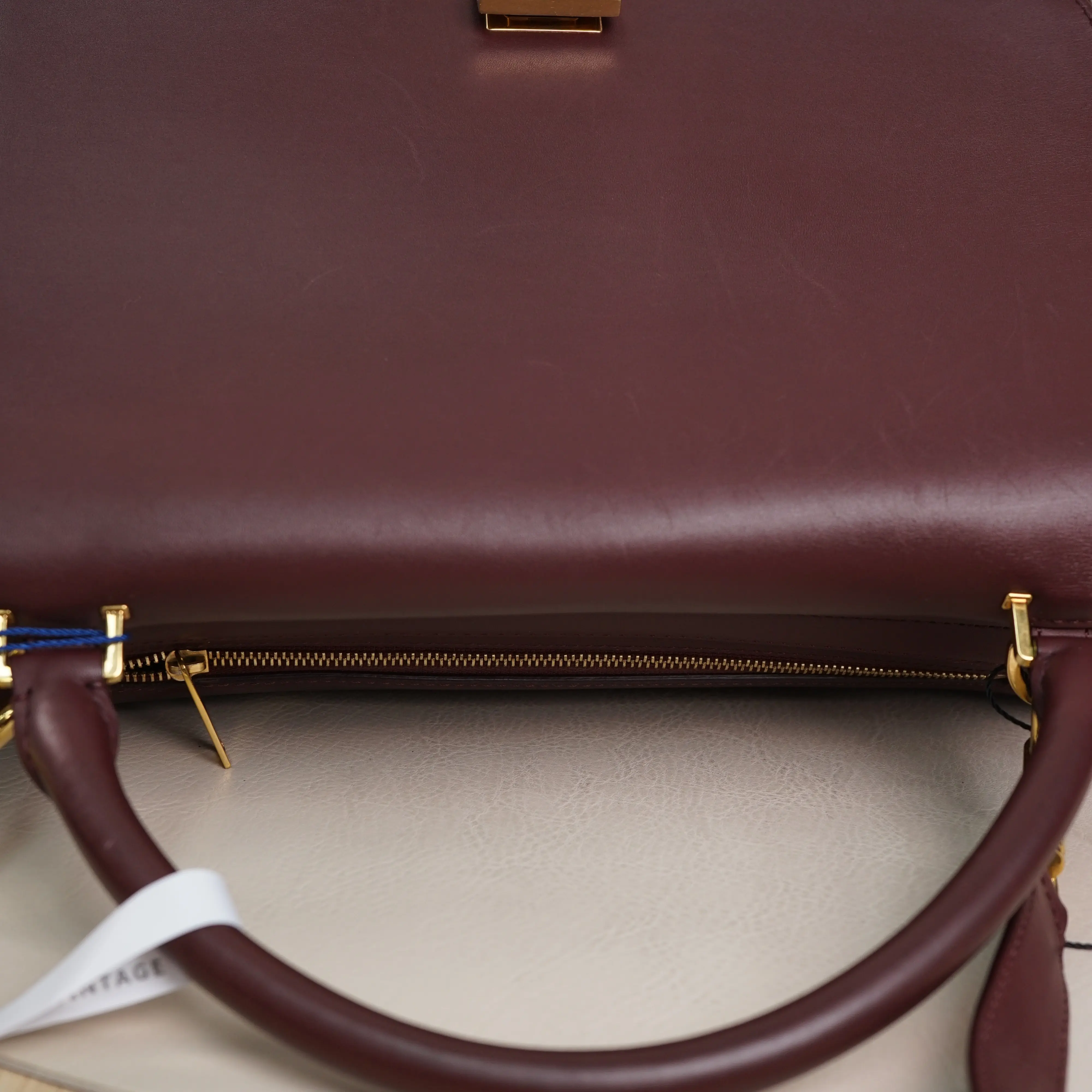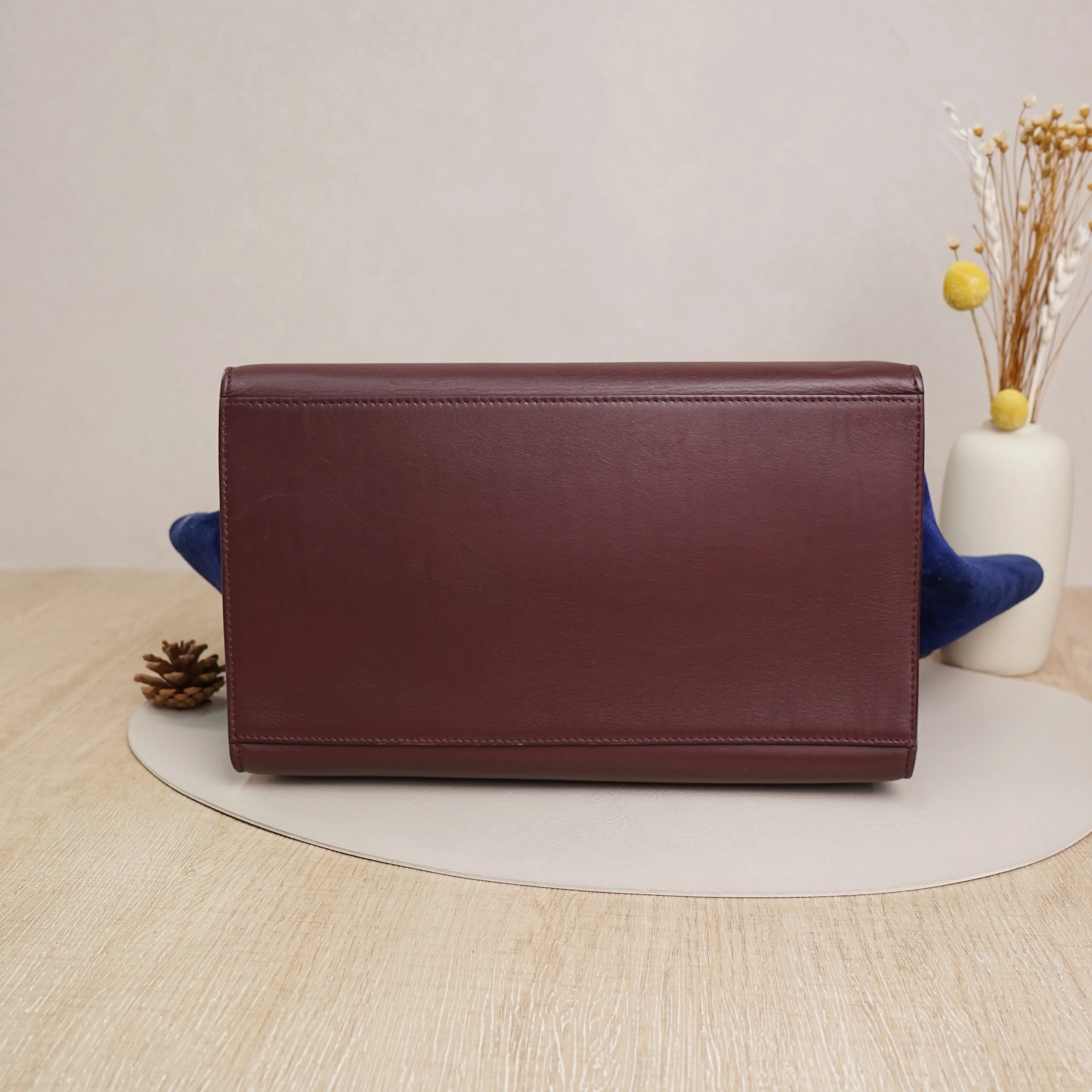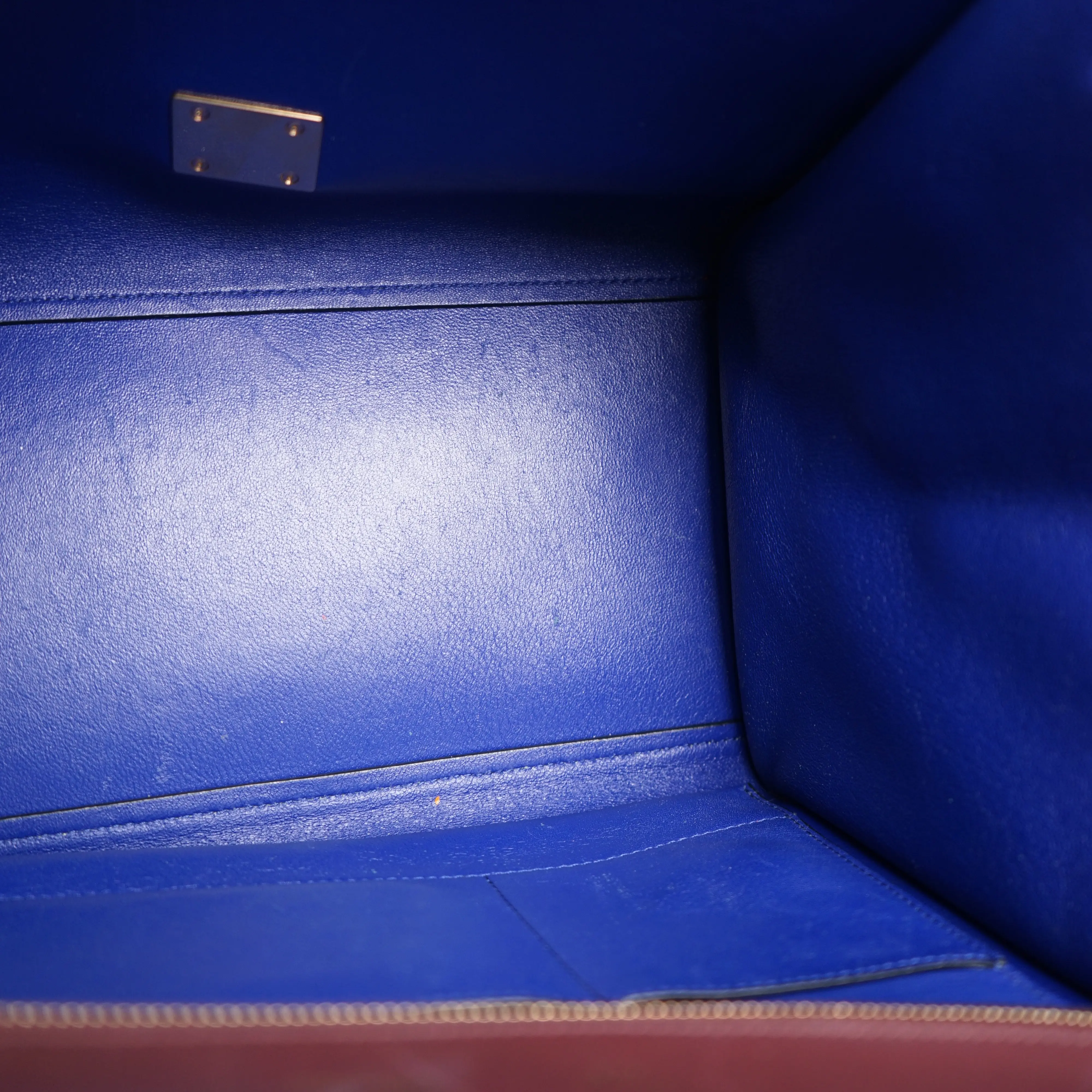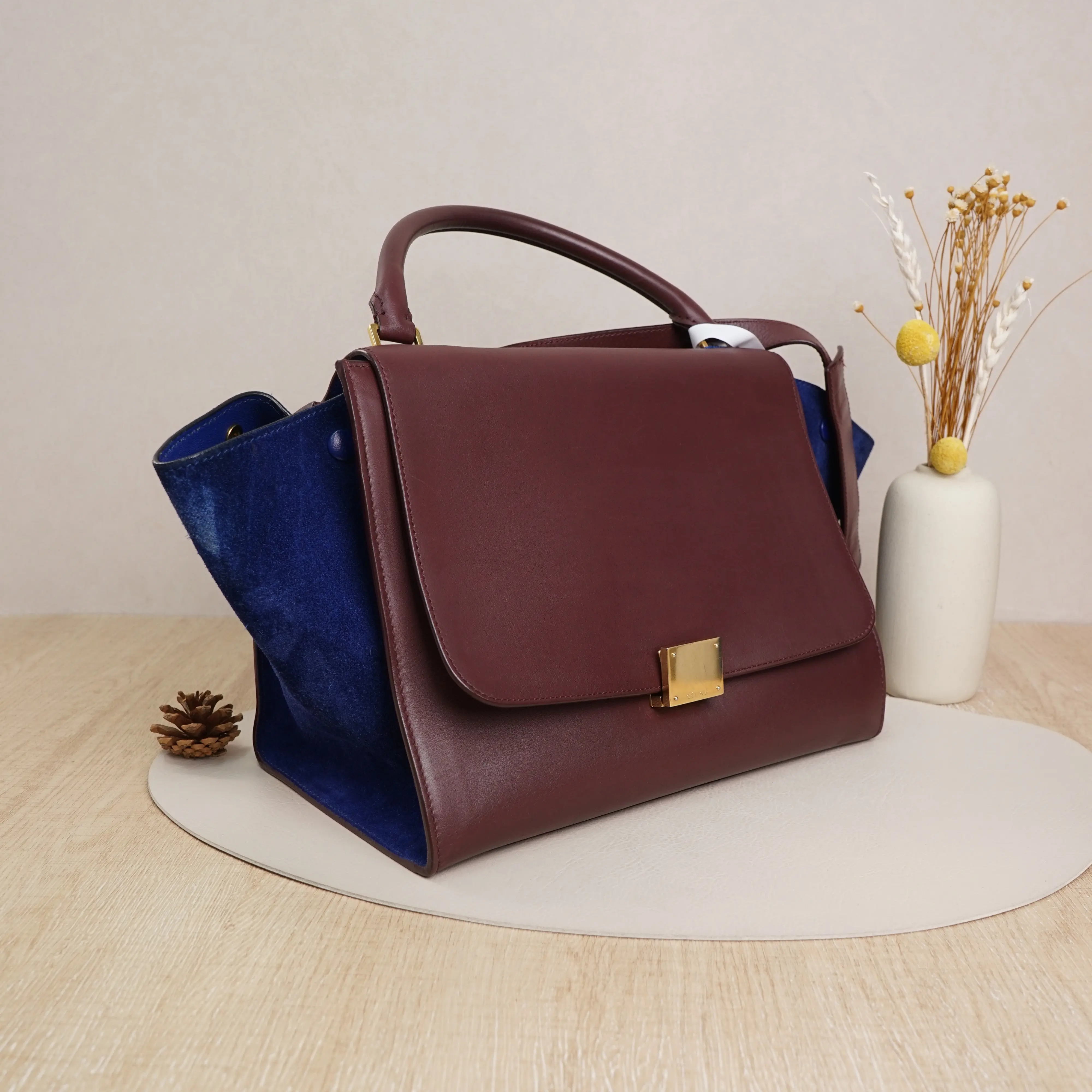 ·Design: Burgundy calfskin leather with blue suede side panels, gold-tone hardware, and a detachable shoulder strap.