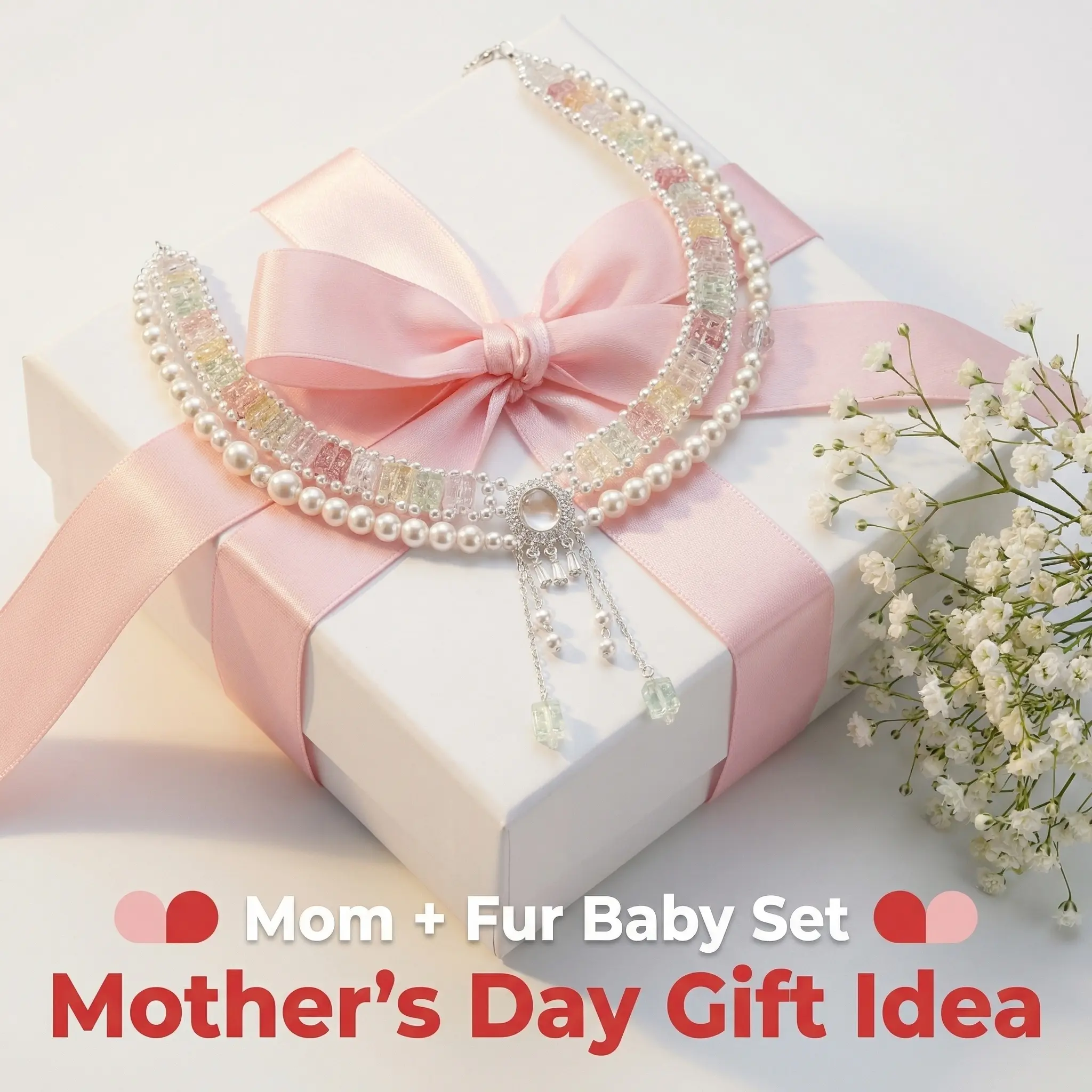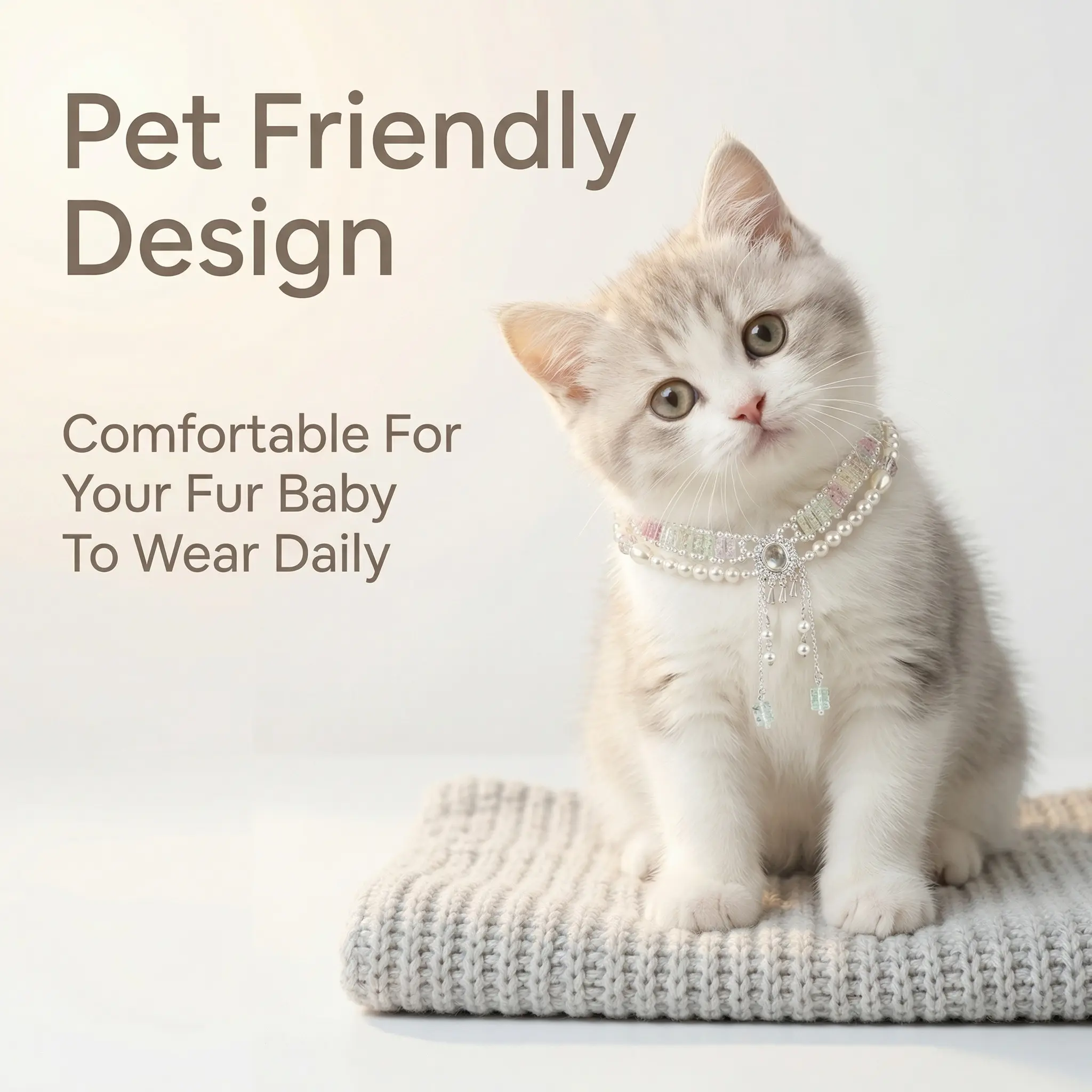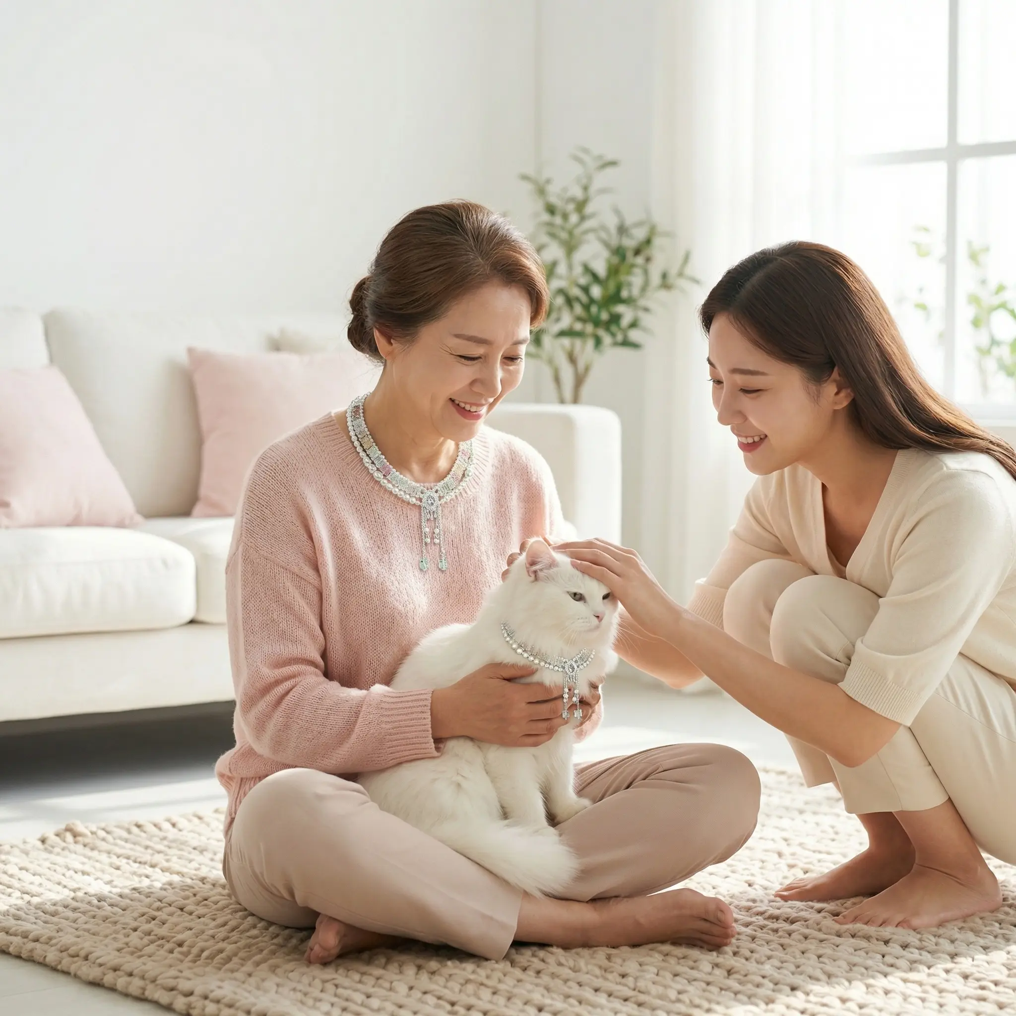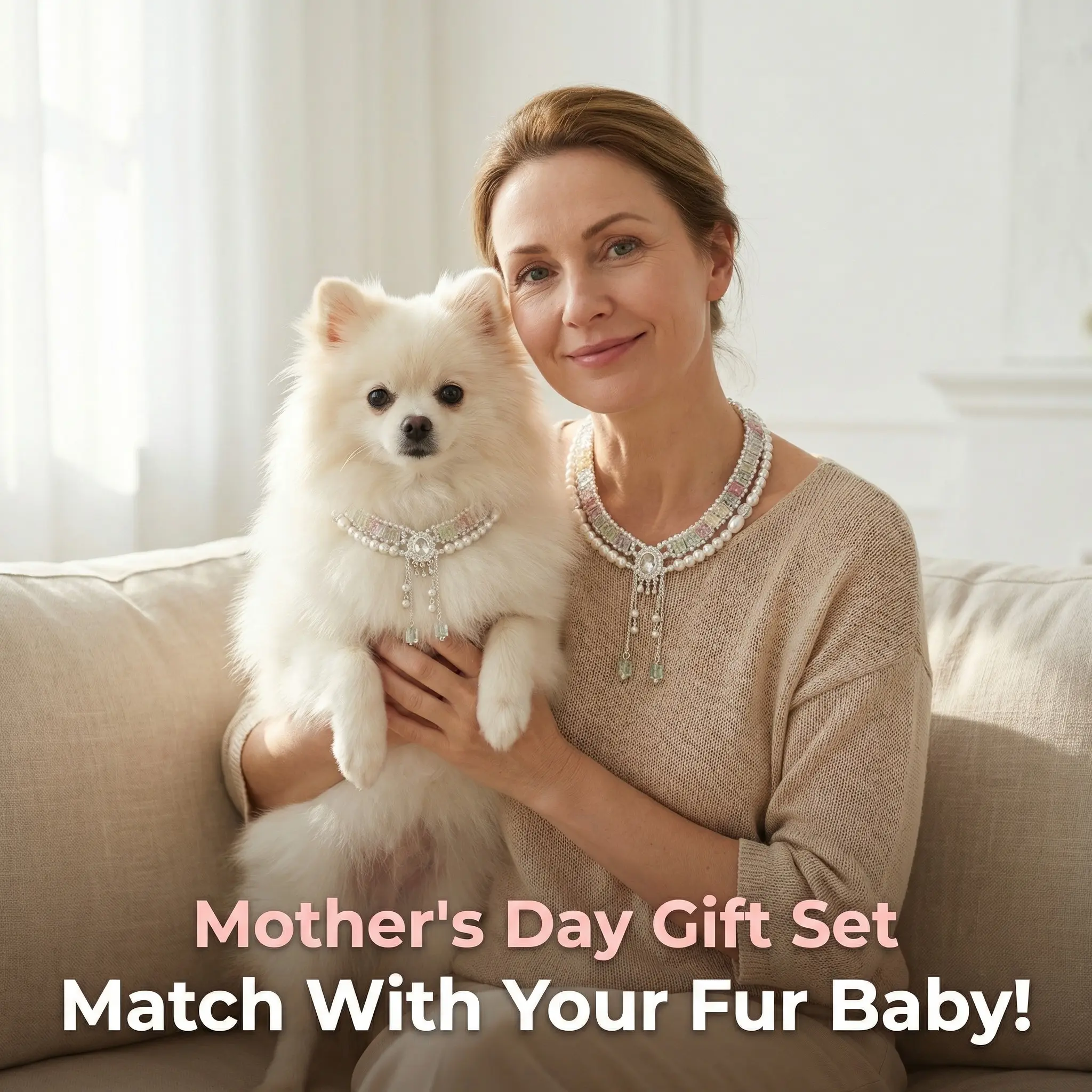 When it looks up at you, there is light in its eyes. That kind of light is called dependence. This necklace uses sparkling diamonds to keep that kind of light for you. Pearls are the softness when you look back at them. One for you, one for it. When you look at each other, the overlapping shadows between your necks are the reflections in each other's eyes.