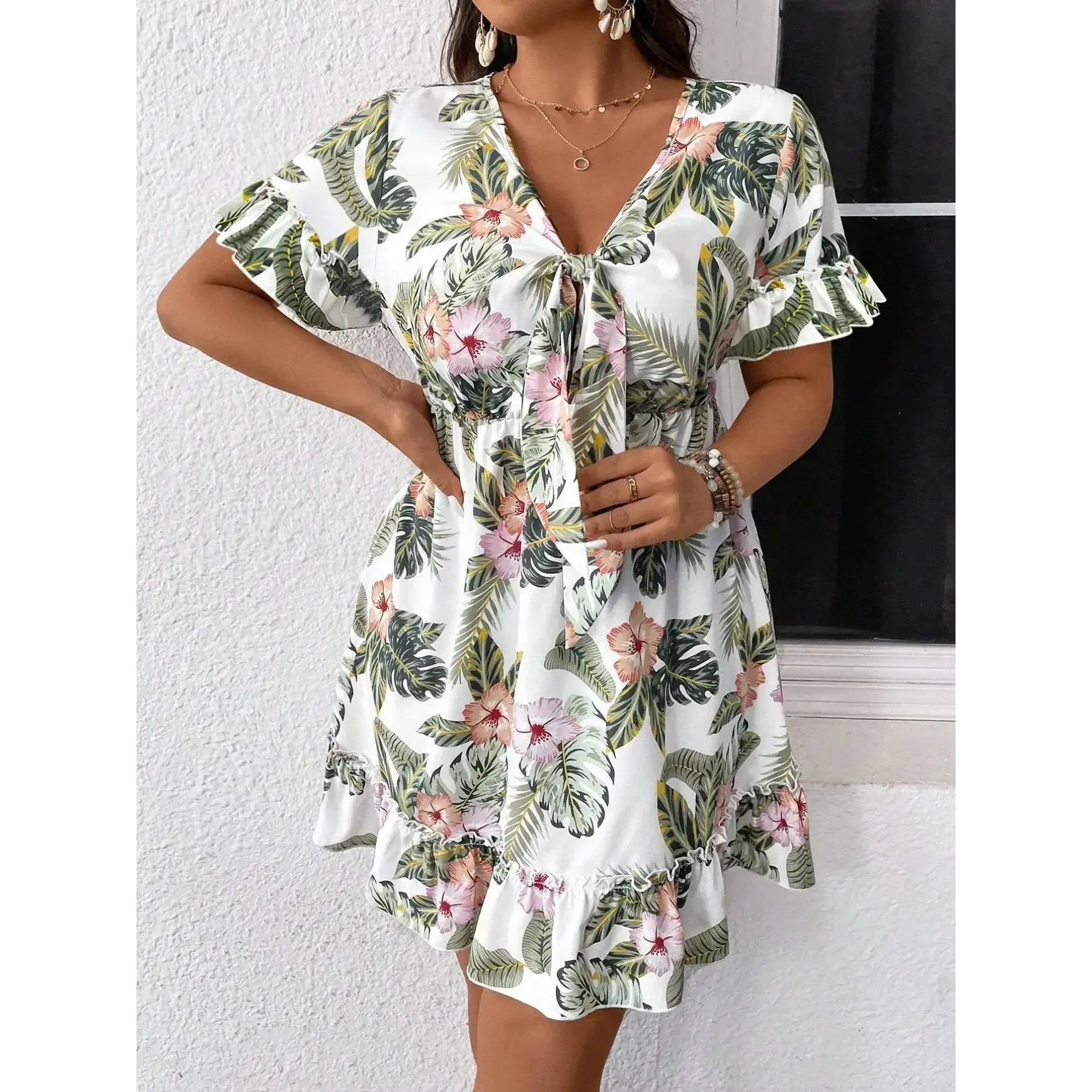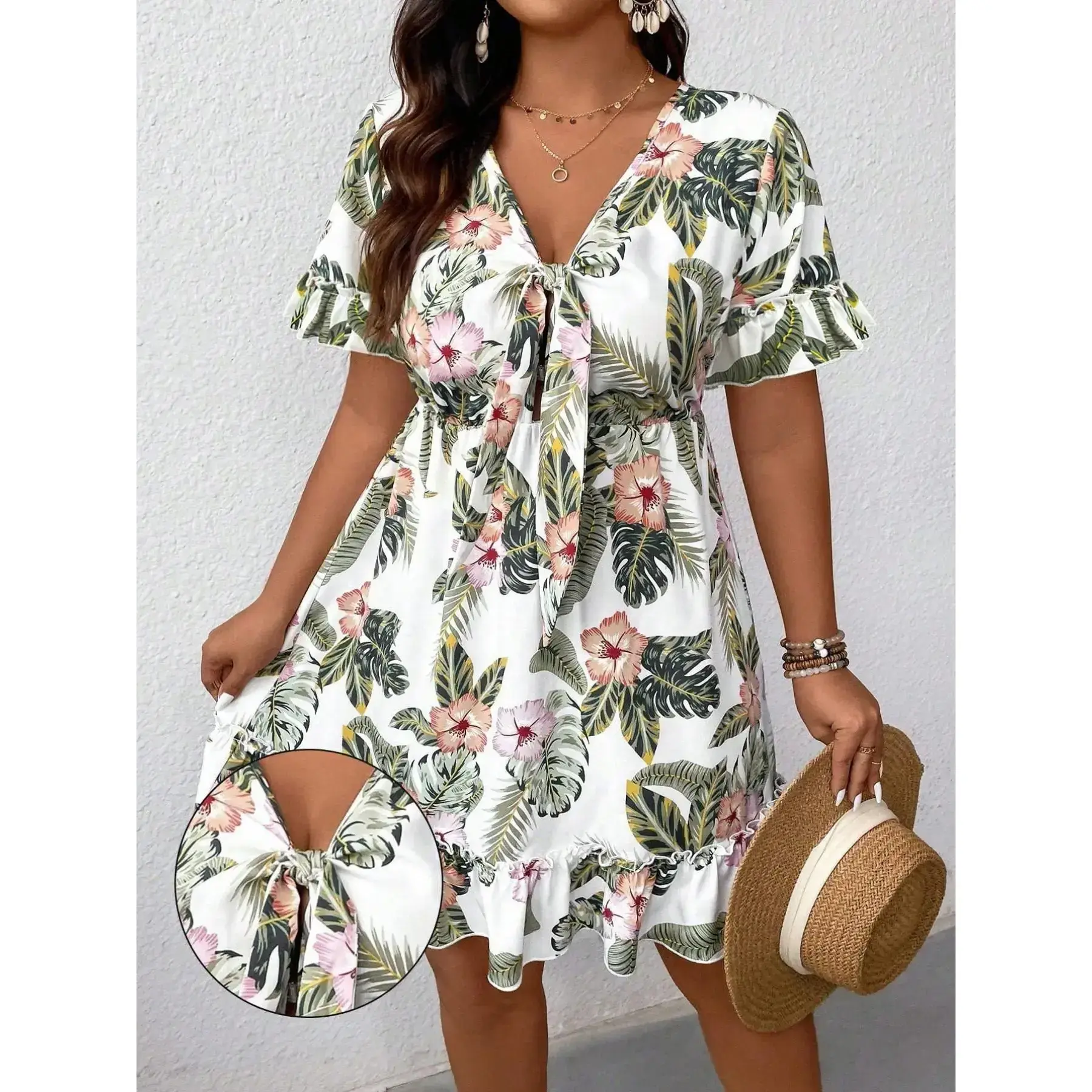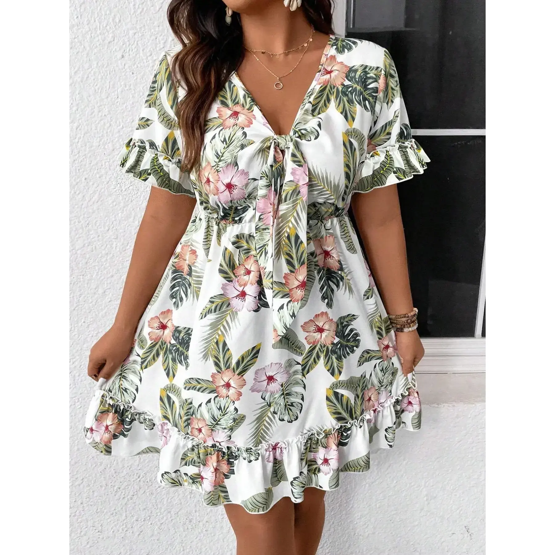 Women's plus size belly control lightweight tropical floral mini dress with front tie V-neck flowing sleeves and ruffle edge beach vacation summer sun skirt Hawaiian nude, casual floral degree pretend bohemian printRAIMENTRY