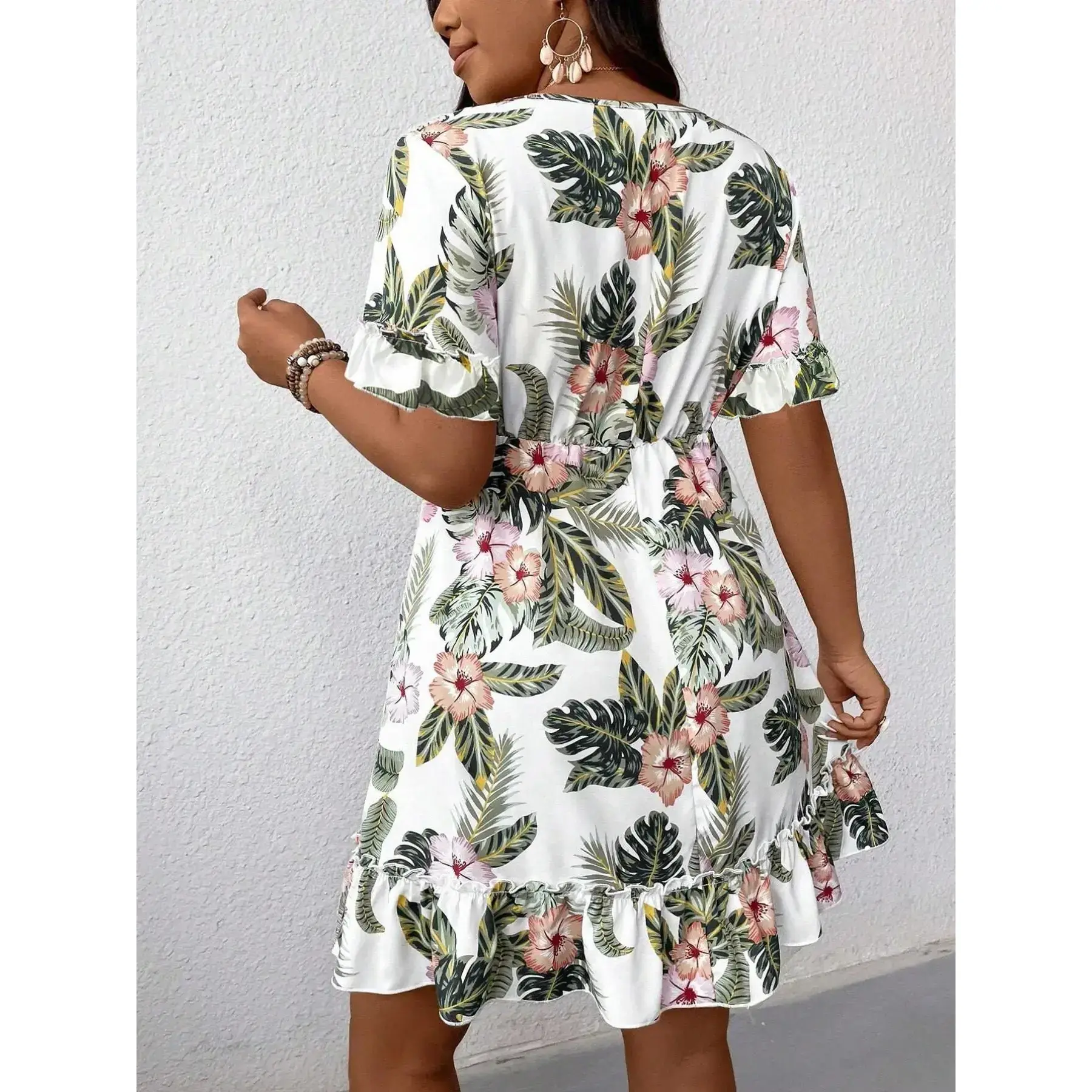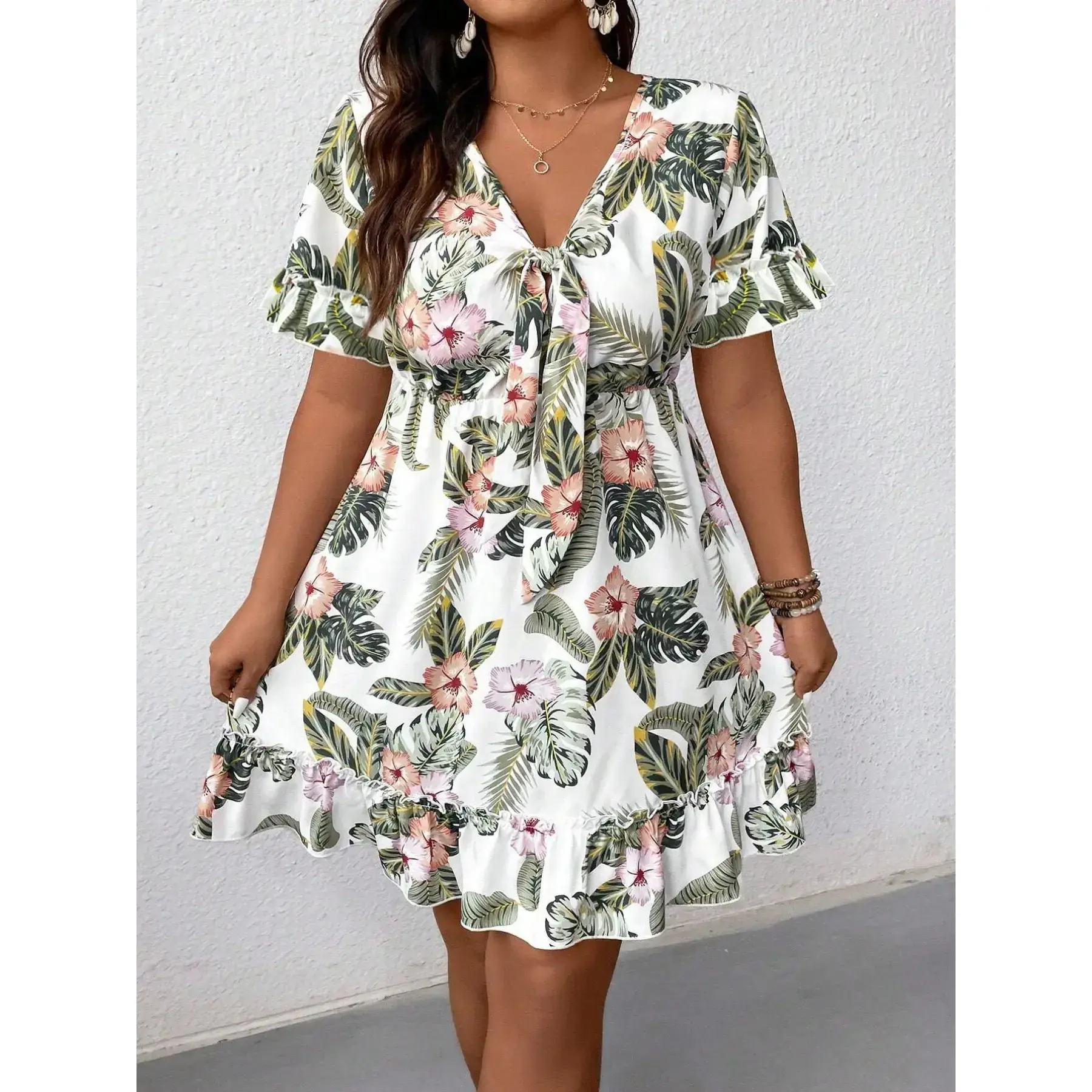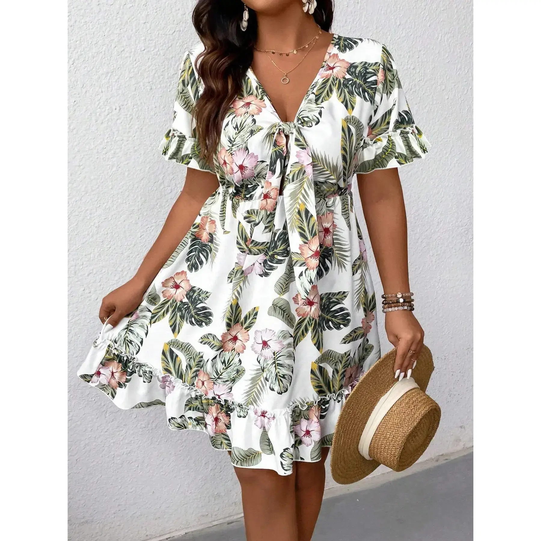 Women's plus size belly control lightweight tropical floral mini dress with front tie V-neck flowing sleeves and ruffle edge beach vacation summer sun skirt Hawaiian nude, casual floral degree pretend bohemian printRAIMENTRY