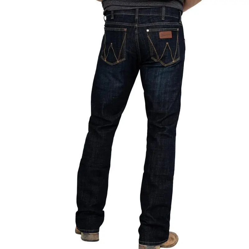 75% cotton / 24% polyester / 1% elastane. Button up with zip-fly. 5 Pocket design. Dark wash. Boot cut. Slim seat and thigh. Mid rise. Classic stitched 'W' embroidery on back pockets. Hand sanding detailing with natural whiskering below the waist. Machine wash cold and tumble dry low.