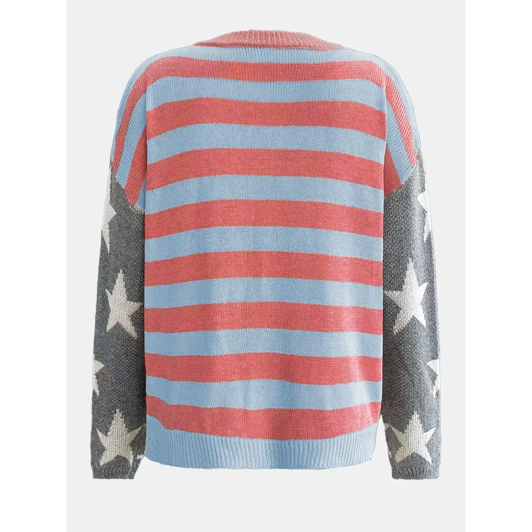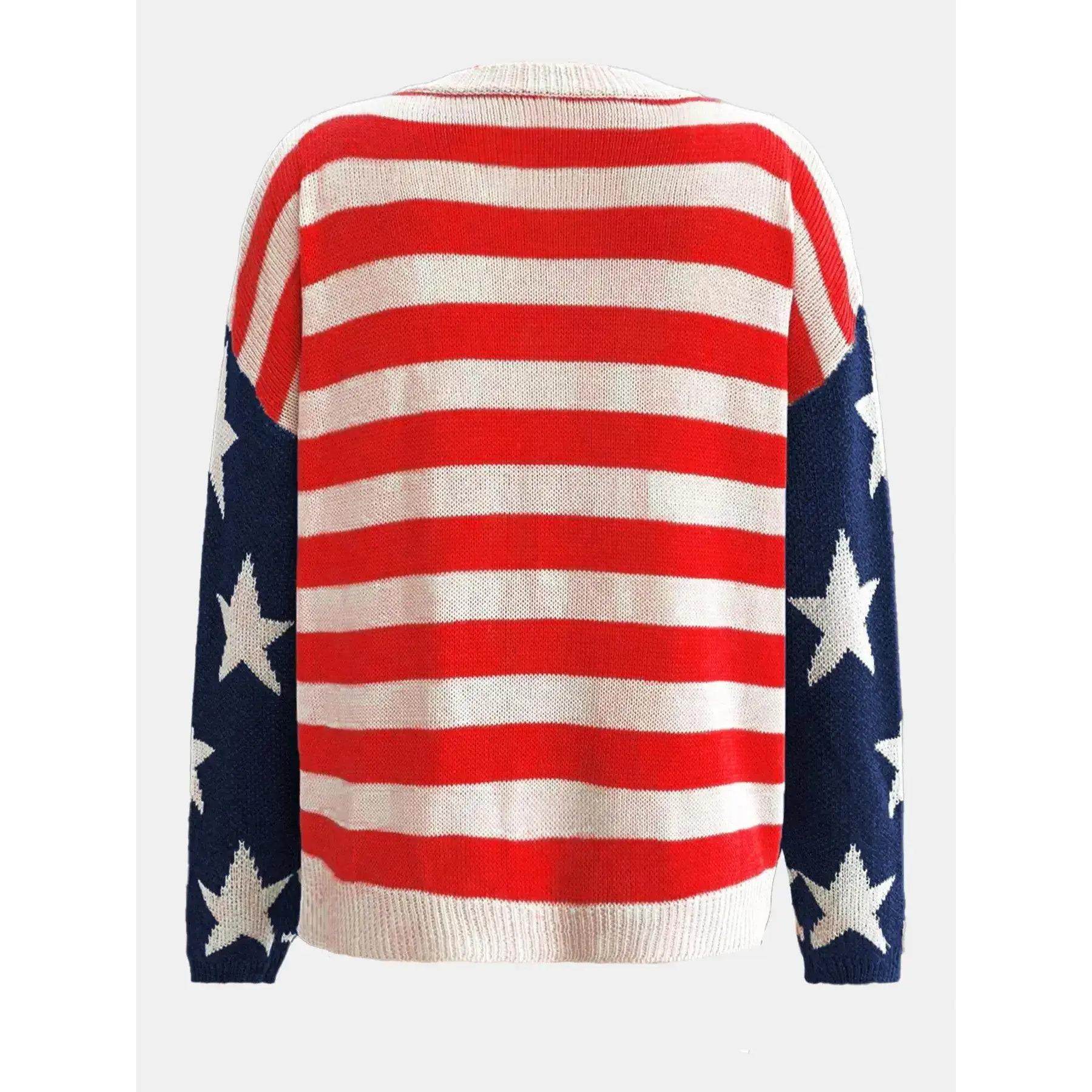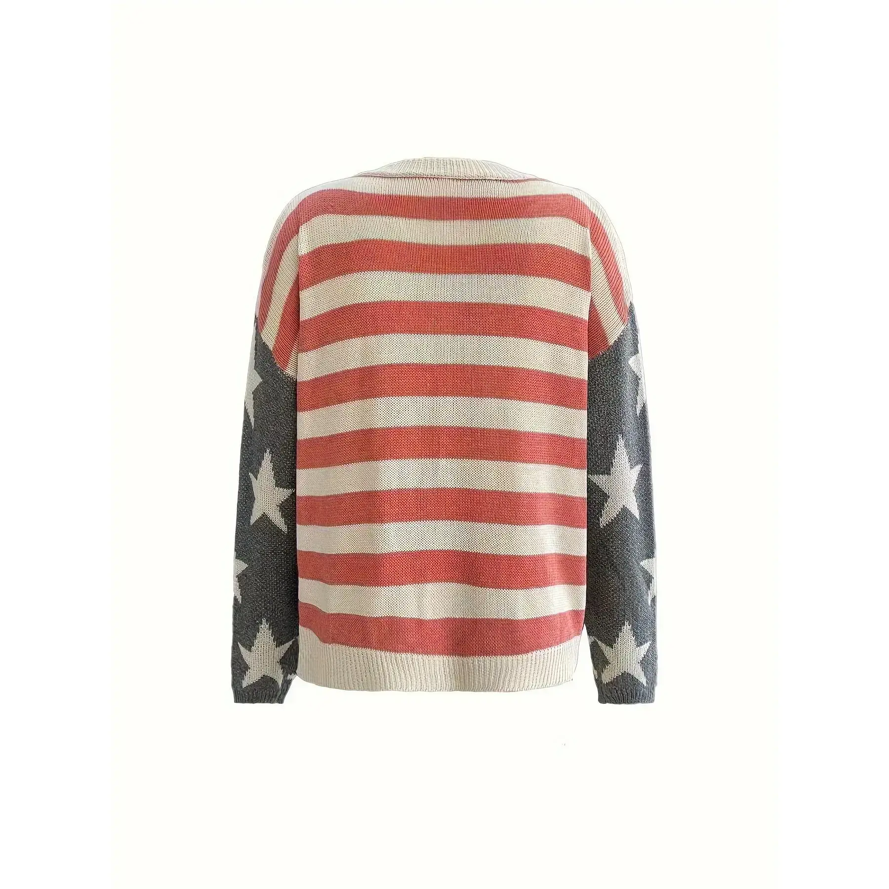 【Patriotic Theme】: Showcasing a striking American flag graphic, this top adds a unique and bold element that celebrates national pride. 【Relaxed Fit】: Featuring a loose-fitting silhouette that enhances ease of movement, making it suitable for various activities throughout your day. 【Functional Features】: Constructed with long sleeves and drop shoulder design, it provides added coverage and a relaxed look perfect for transitional seasons. 【Medium Stretch】: Crafted with medium stretch fabric, offering a pleasant fit that allows flexibility while retaining the garment's shape over time. 【Everyday Wear】: Ideal for daily outings, this knit top's round neckline and regular length make it a practical addition to your wardrobe.