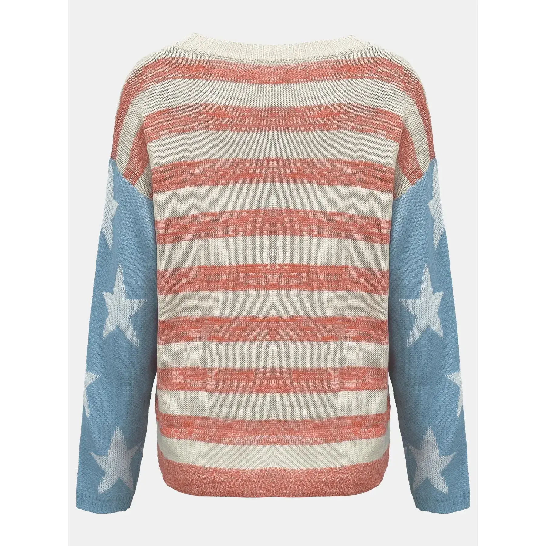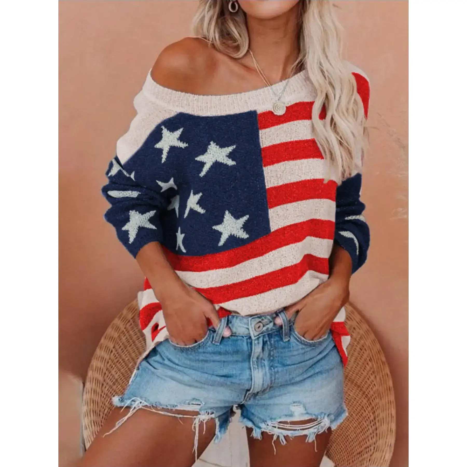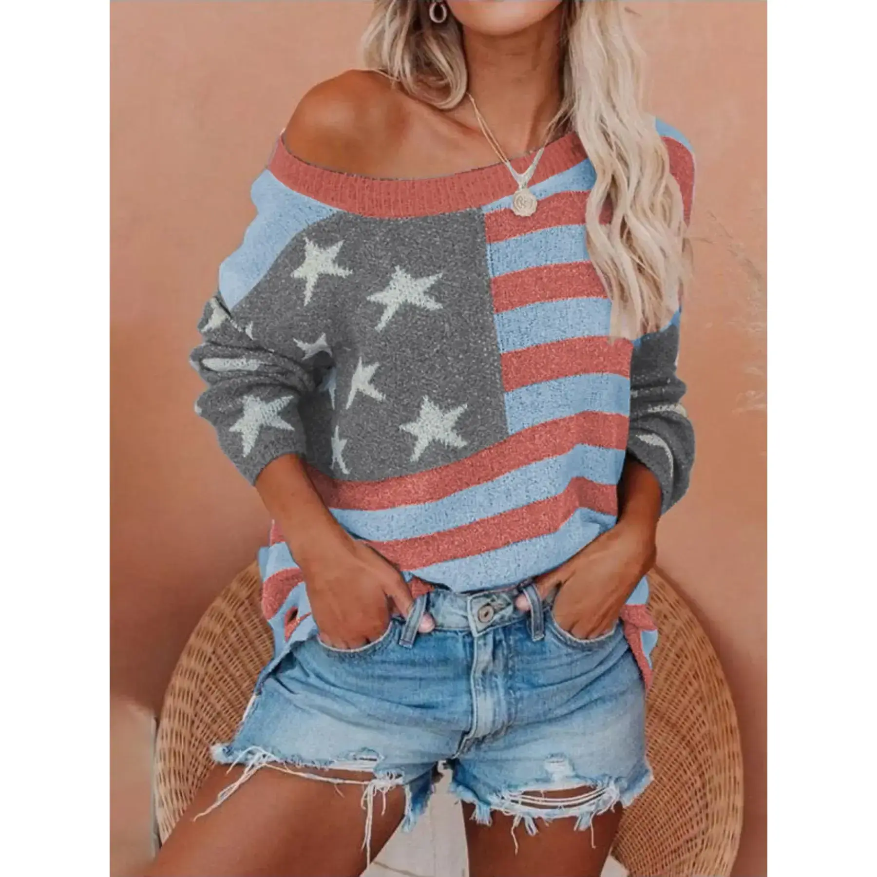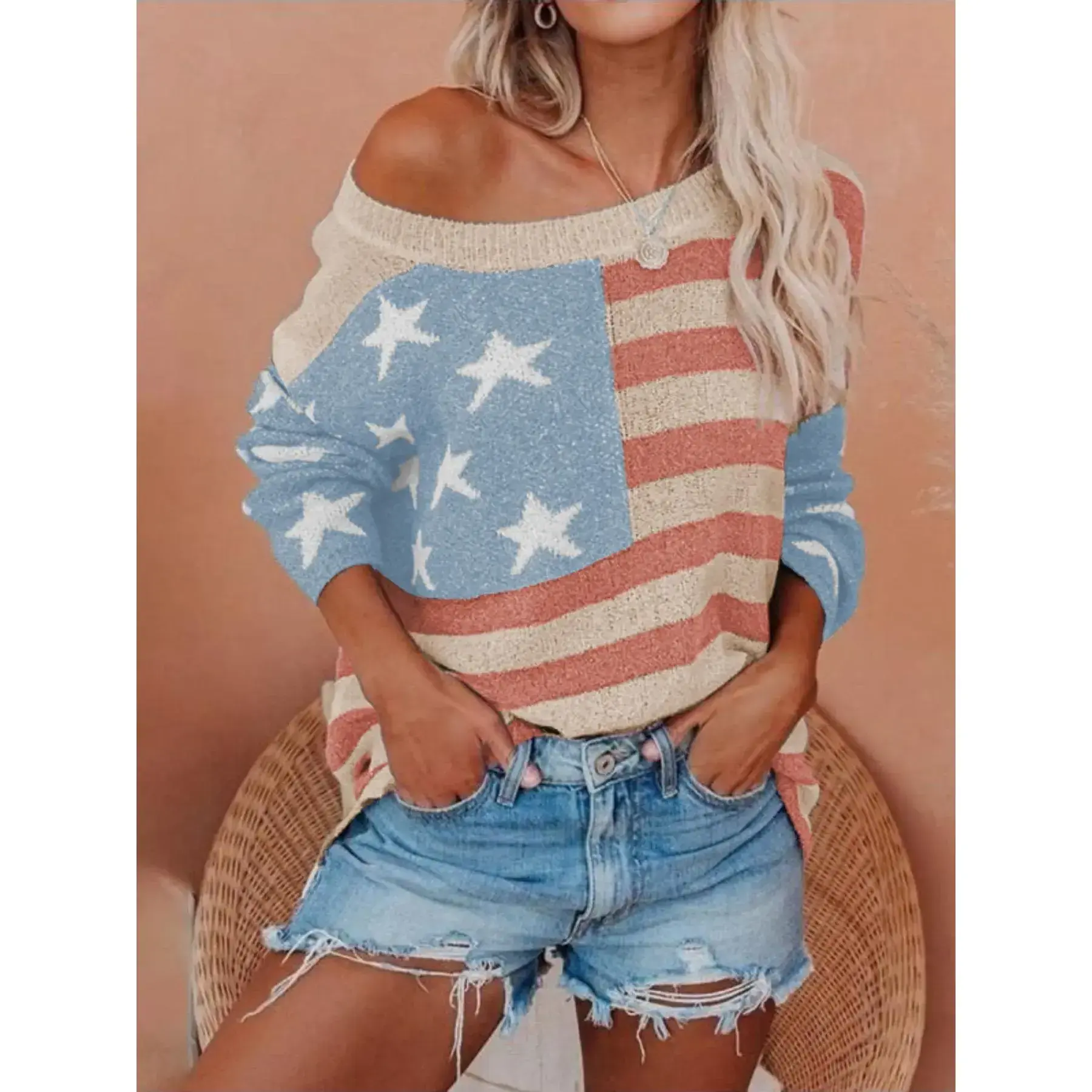 Women's flag printed off shoulder round neck knitted top, spring and autumn casual long sleeved round neck knitted shirt, fashionable women's daily knitted clothingRAIMENTRY