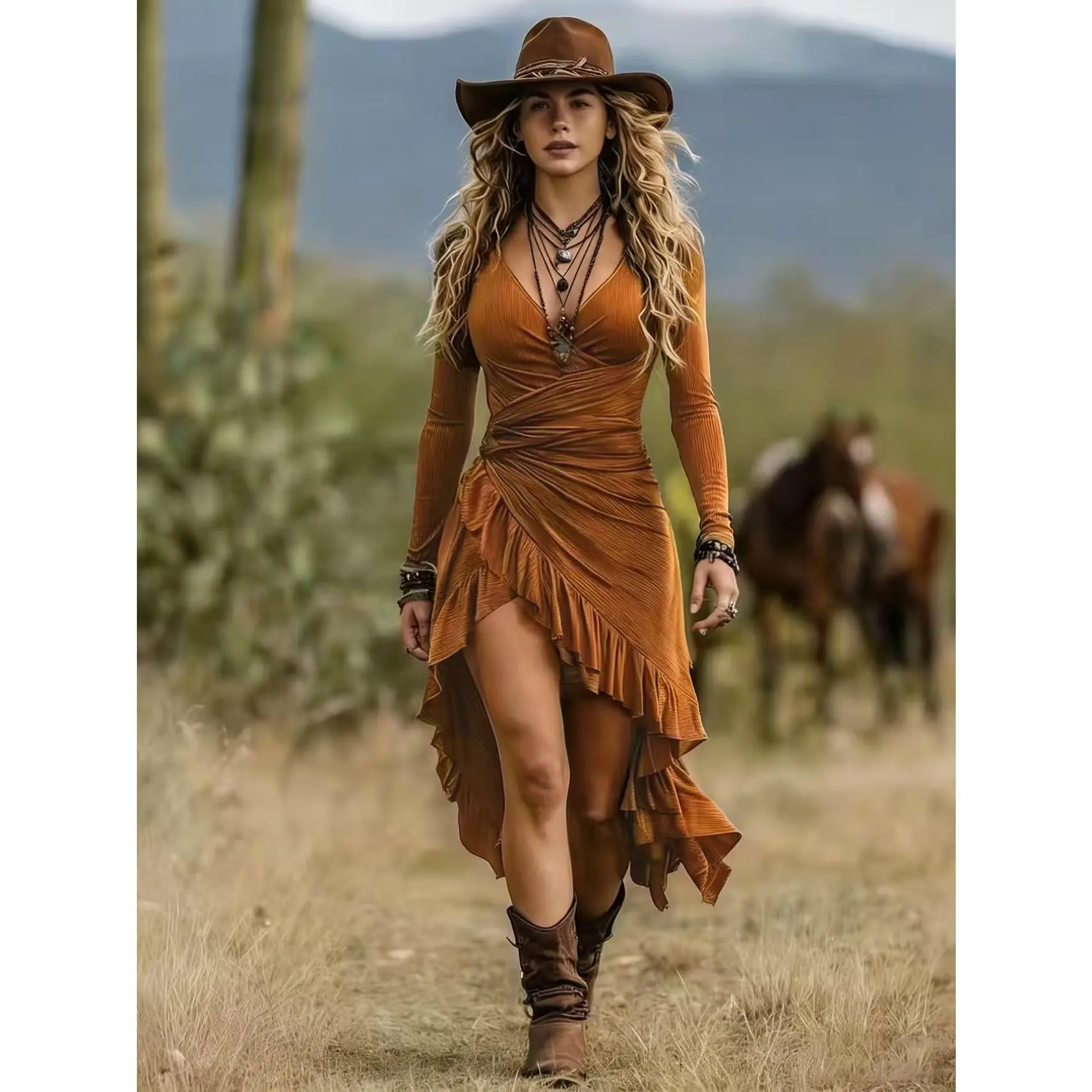 Bohemian Style Women's Midi Long Sleeve Dress with Cross Design, Ruffled Flounce Hem and Unique Asymmetrical Skirt, Trendy Western Fashion Dress for SummerRAIMENTRY