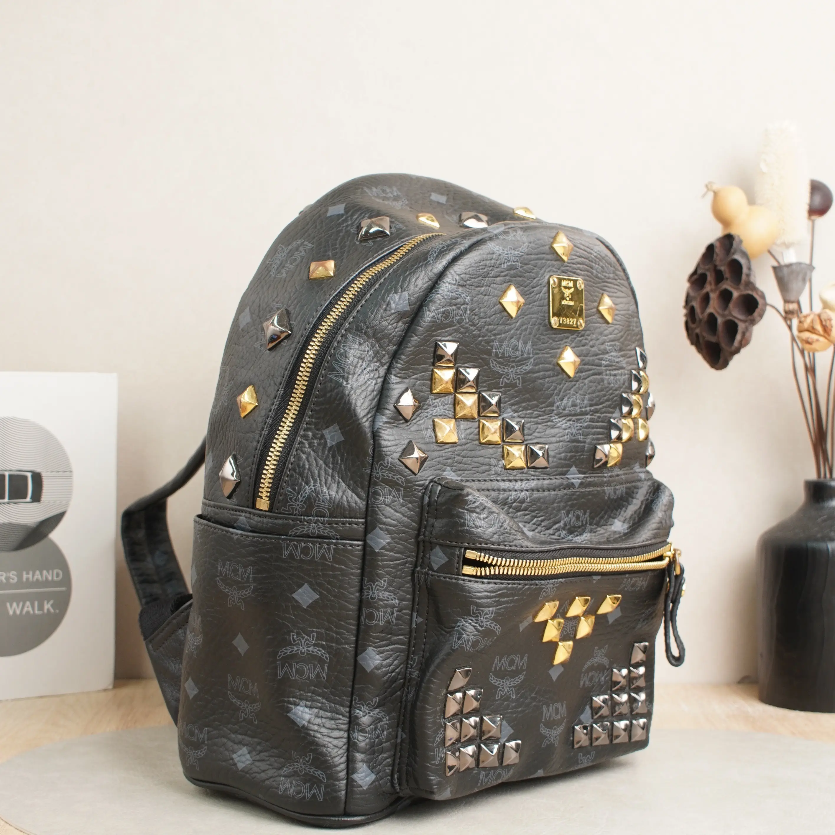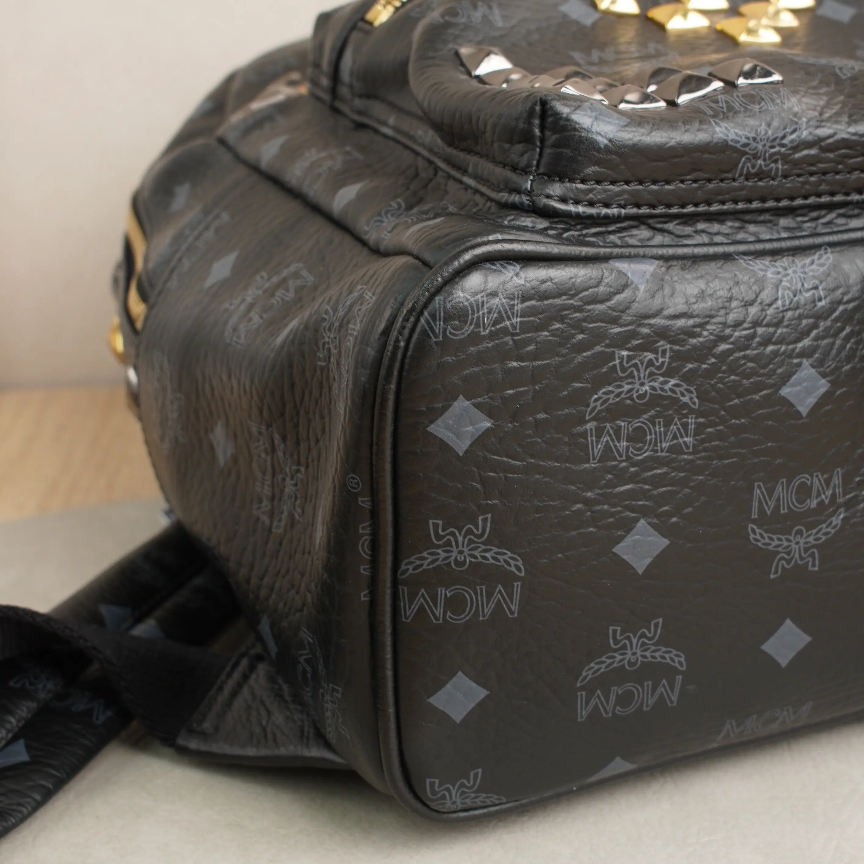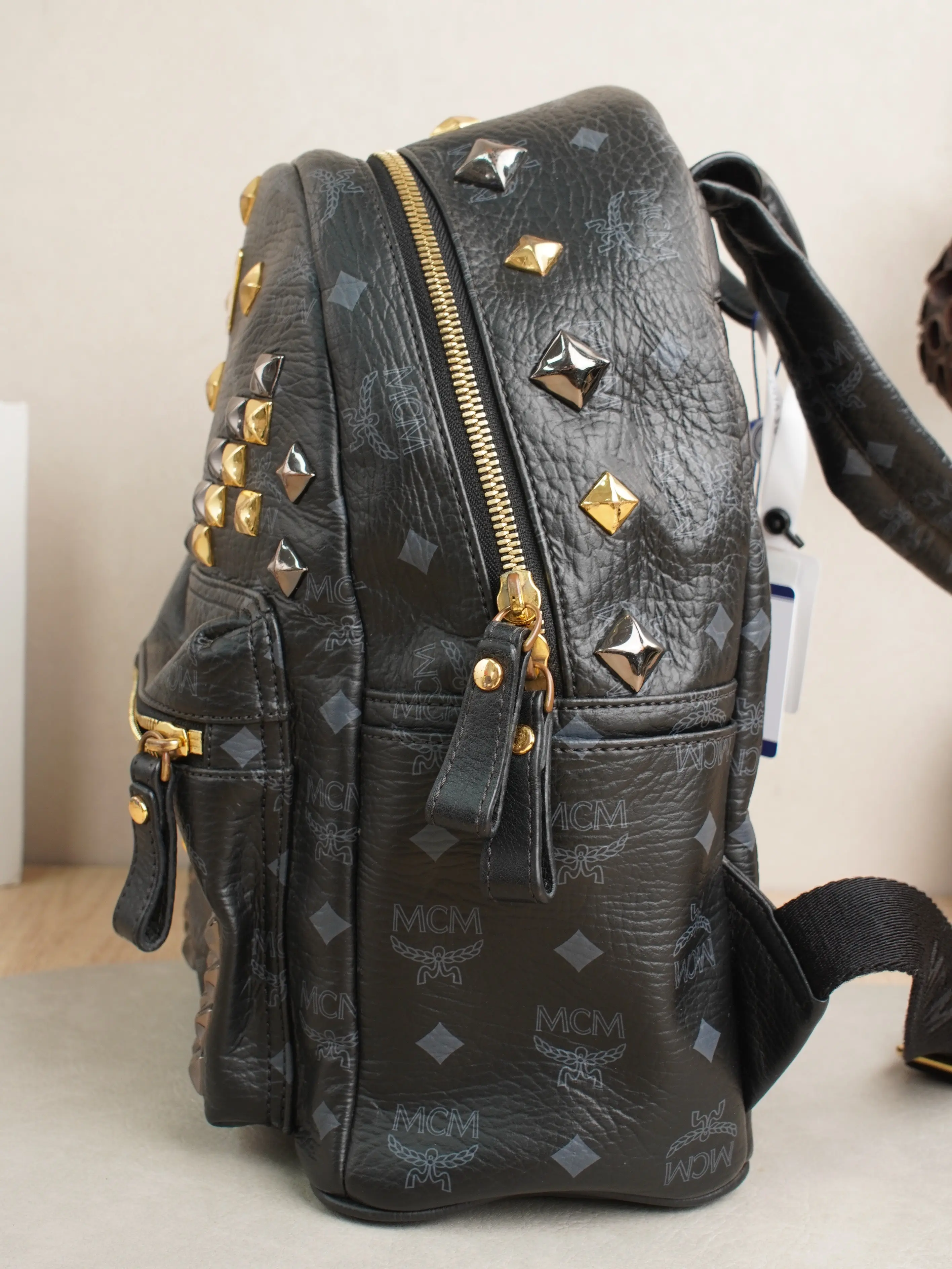 ·Design: Signature MCM monogram, studded V-shaped embellishments, gold-tone logo plate, multi-compartment interior.