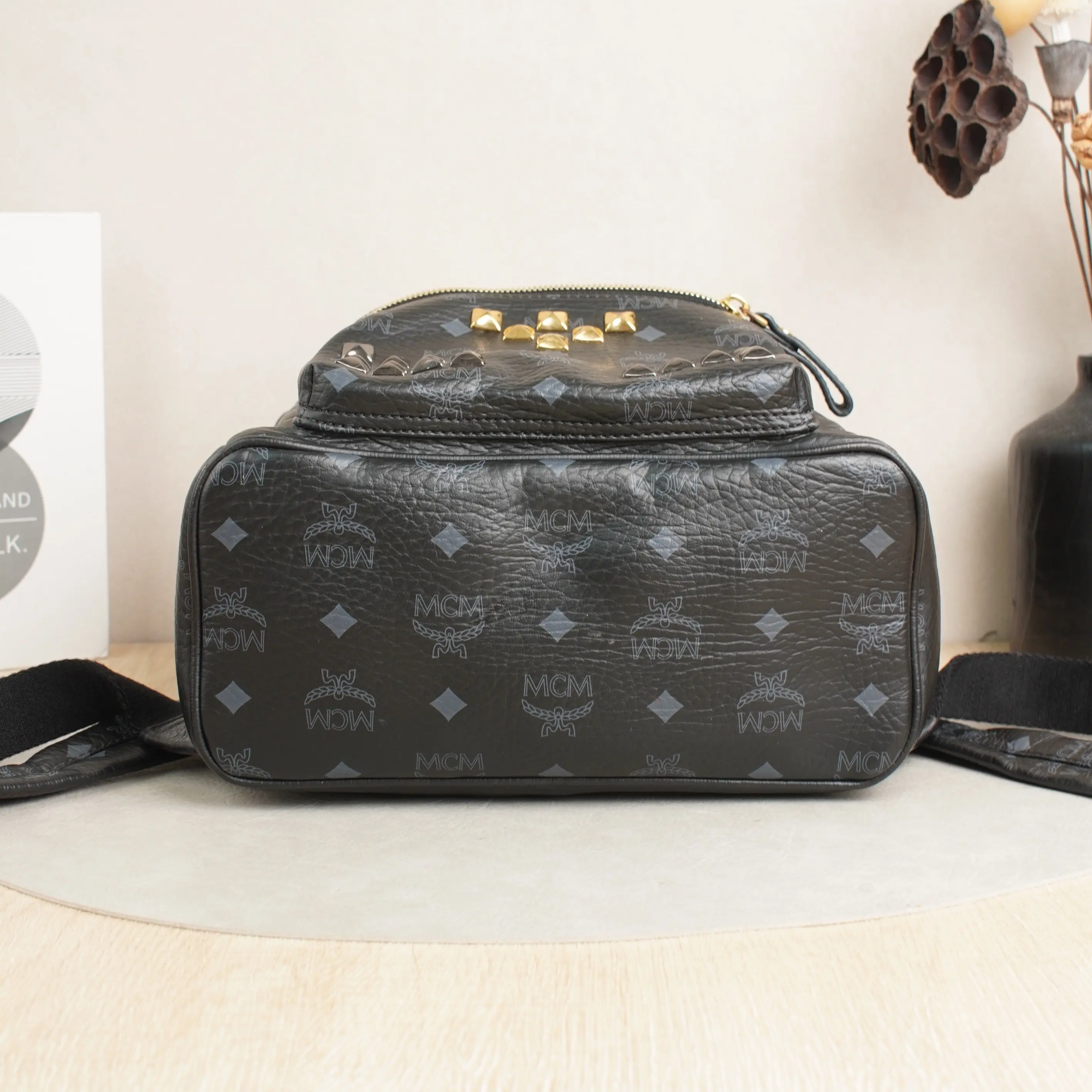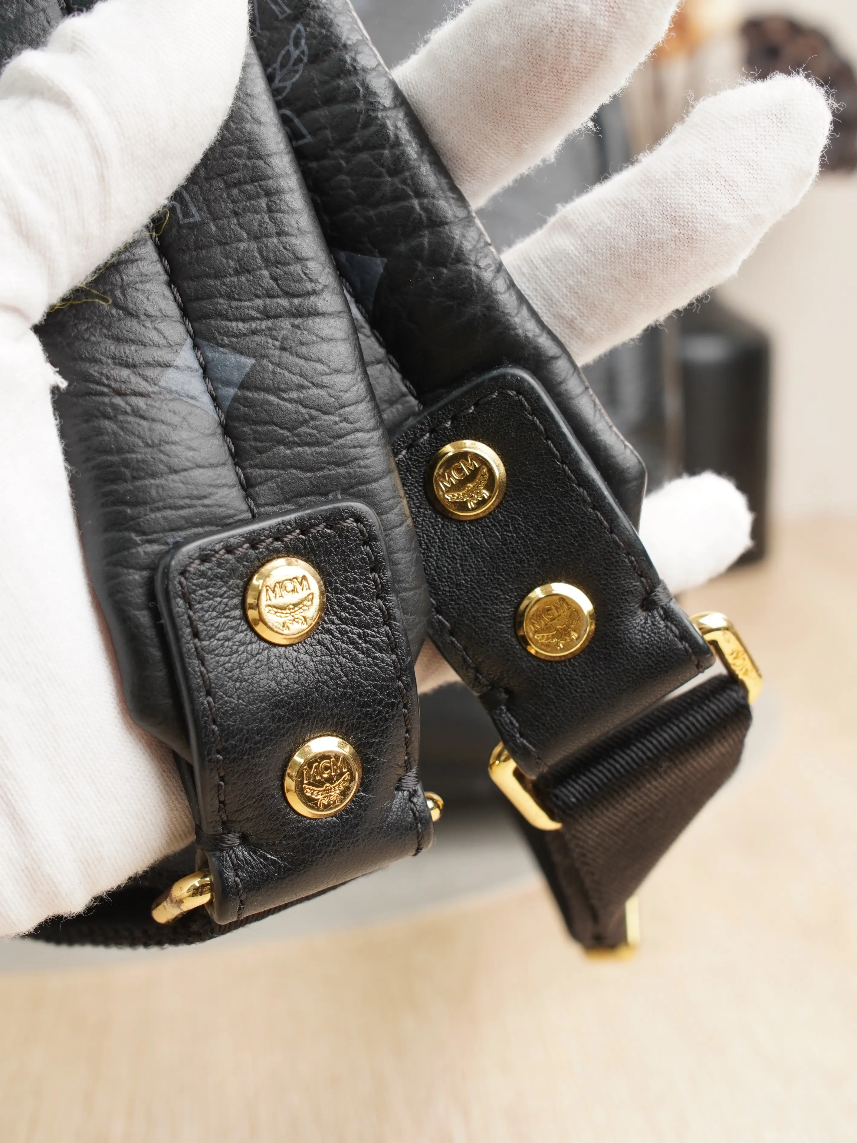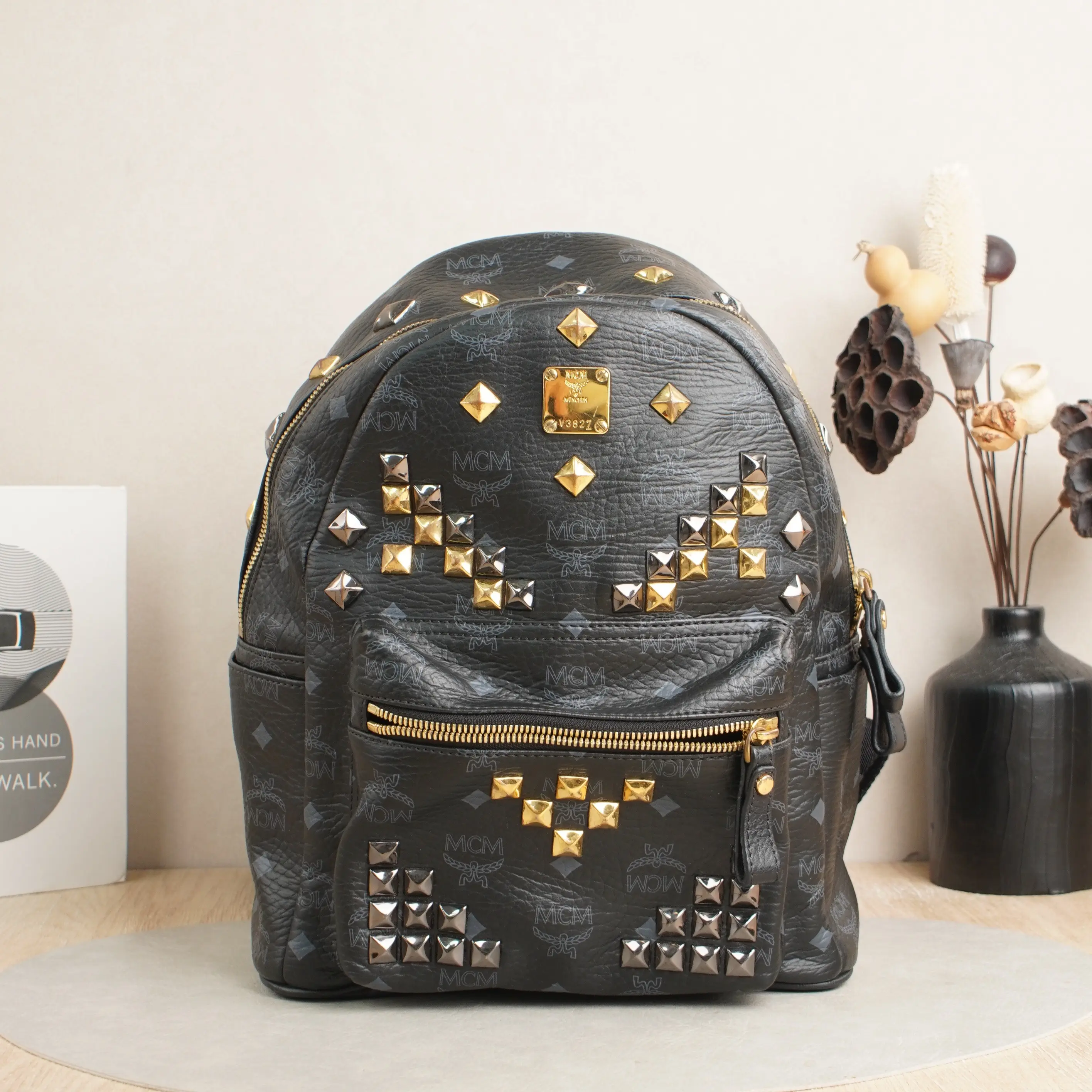 ·Design: Signature MCM monogram, studded V-shaped embellishments, gold-tone logo plate, multi-compartment interior.