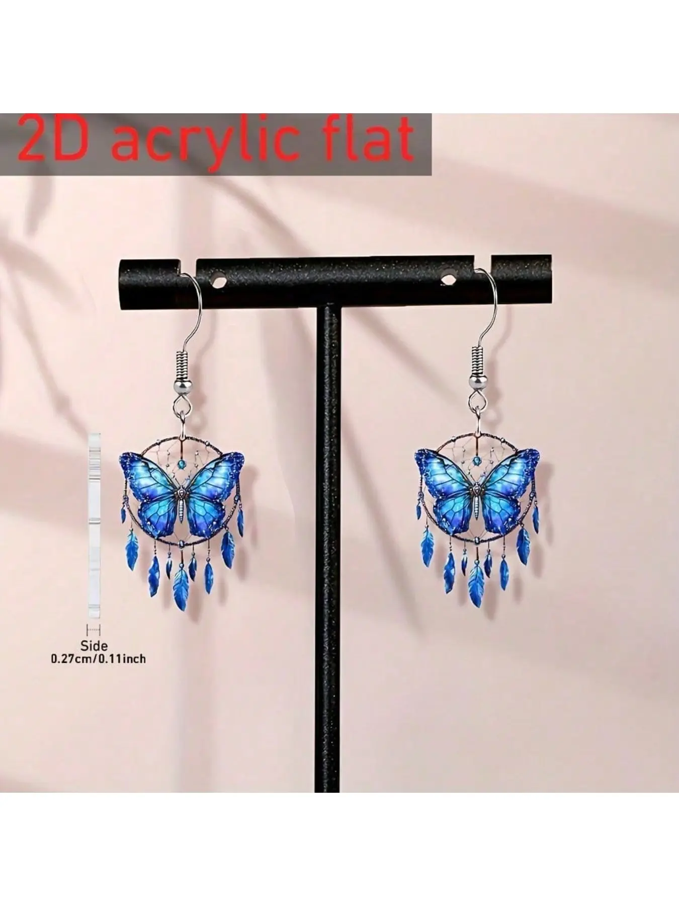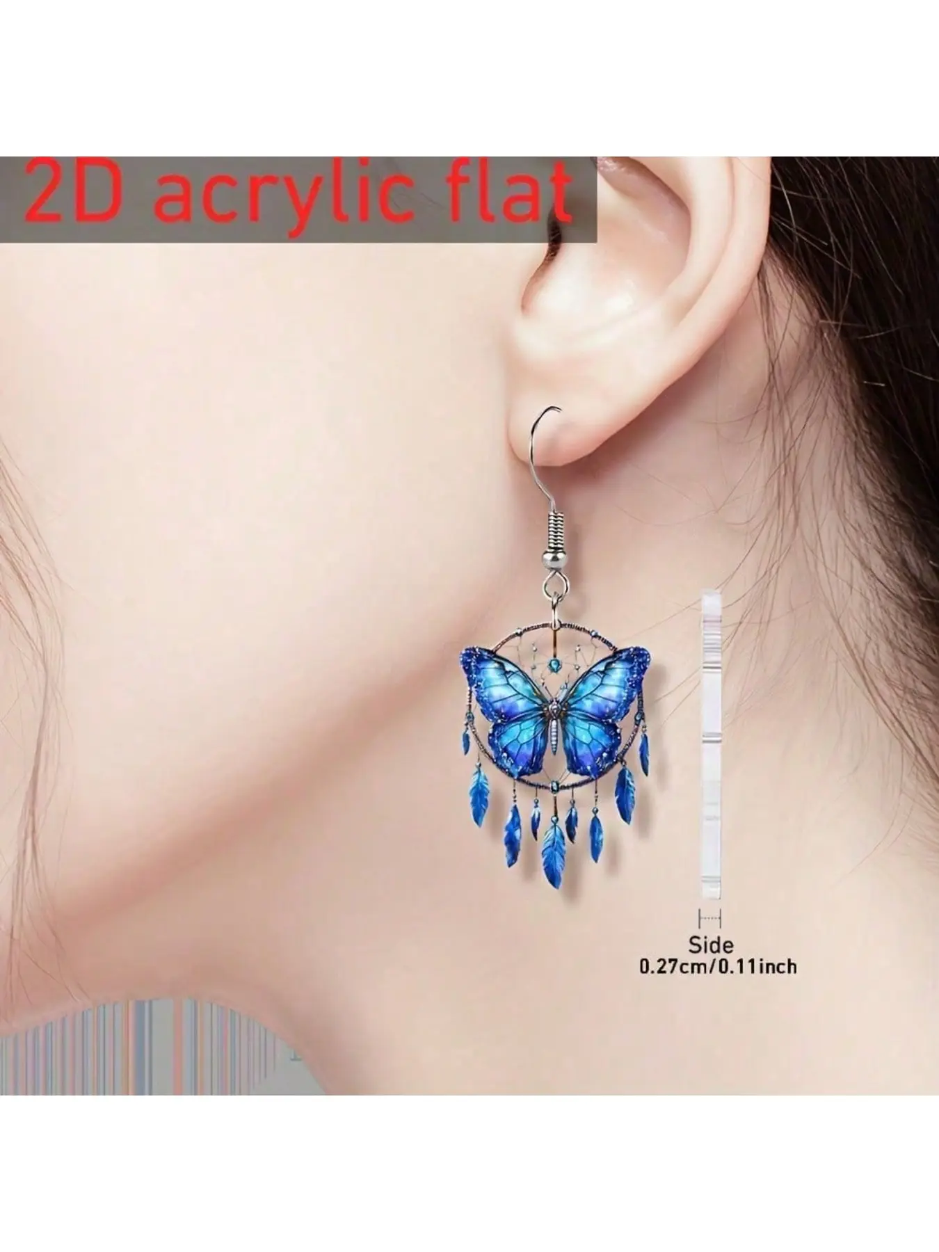 a pair of Bohemian style blue butterfly dream catcher earrings - acrylic double-sided printing, lightweight and suitable for casual dressing/parties, perfect gift for lovers, exquisite party butterfly pattern accessories, Mother's Day gift