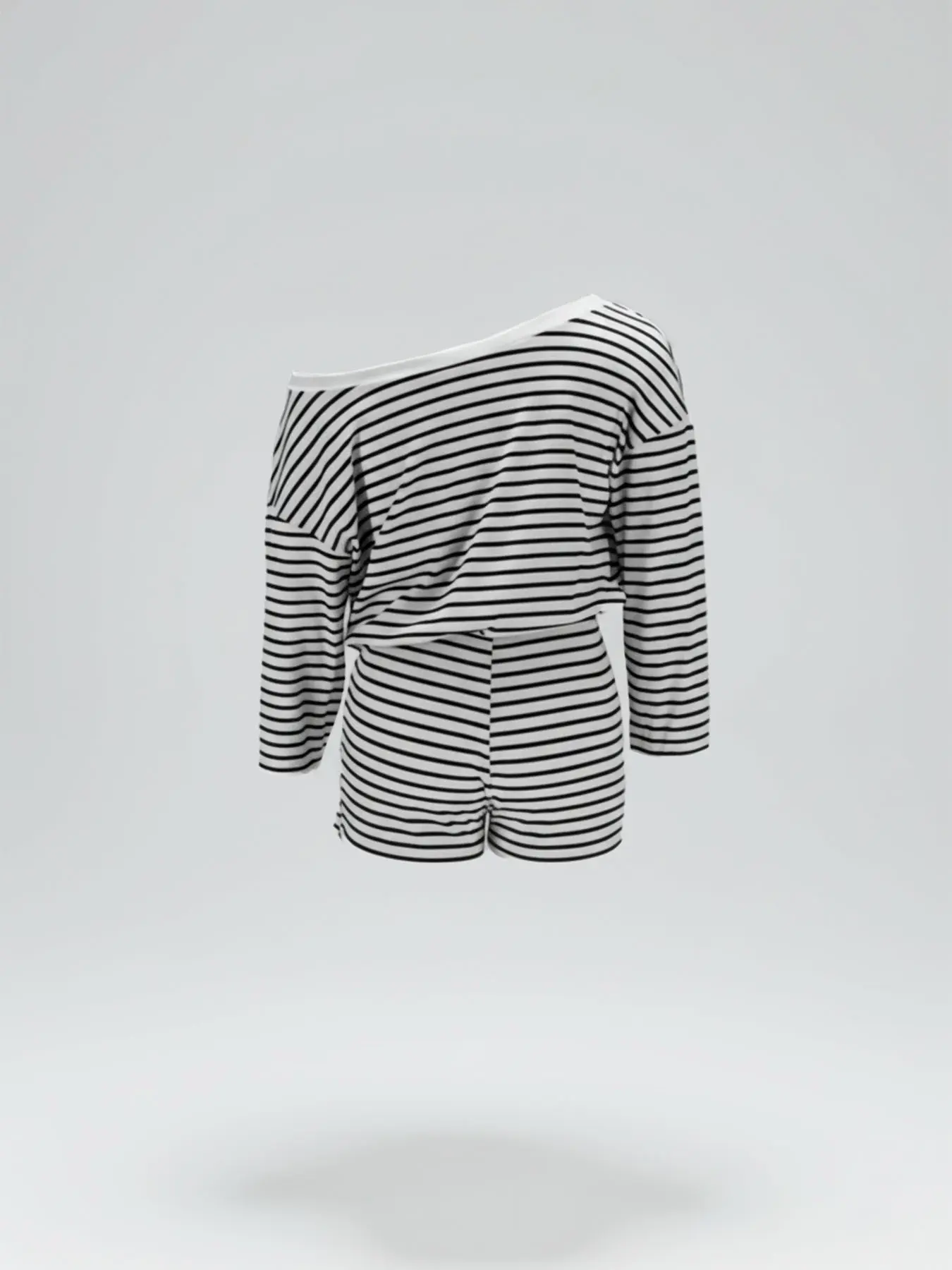 Women's Striped Casual Two-Piece Set, One-Shoulder Revealing Belly Long Sleeve Top + Drawstring Shorts, Hot Girl Home Wear