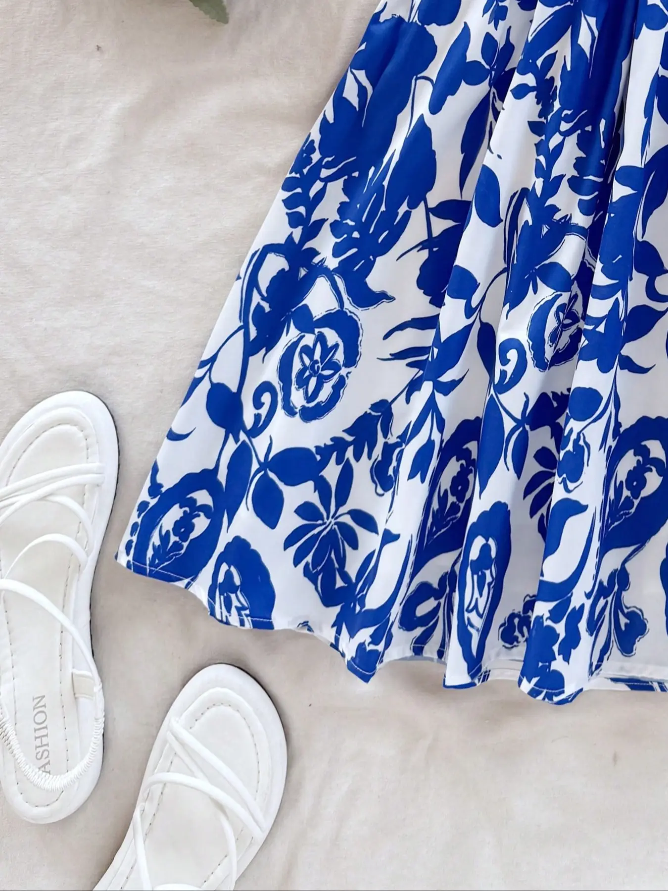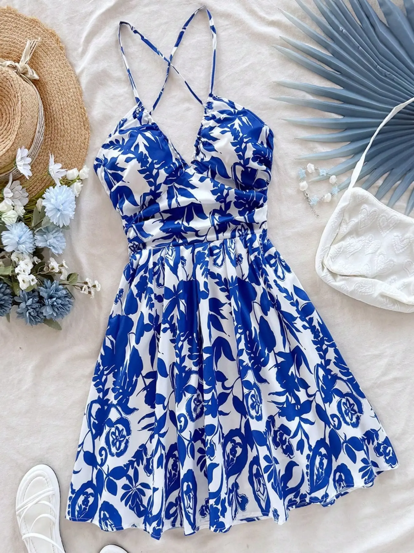 Women's Vacation-Style Blue & White Floral Print Deep V-Neck Backless Bowknot Back Ruffle Hem Dress, Suitable For Weddings, Graduations, Back To School, Cute Lunch, Sexy Bachelorette, Summer