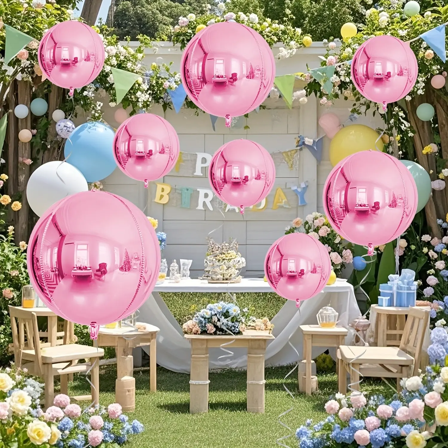 【Chrome Finish】: Features a chrome-plated finish that adds a shiny, reflective quality to the balloons.