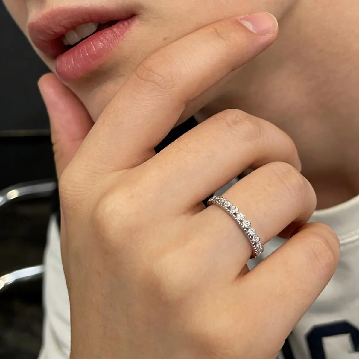 ·This elegant eternity band features 24 precisely set 1.5mm synthetic moissanite stones, circling the band in perfect harmony. The continuous design symbolizes endless love, commitment, and connection.