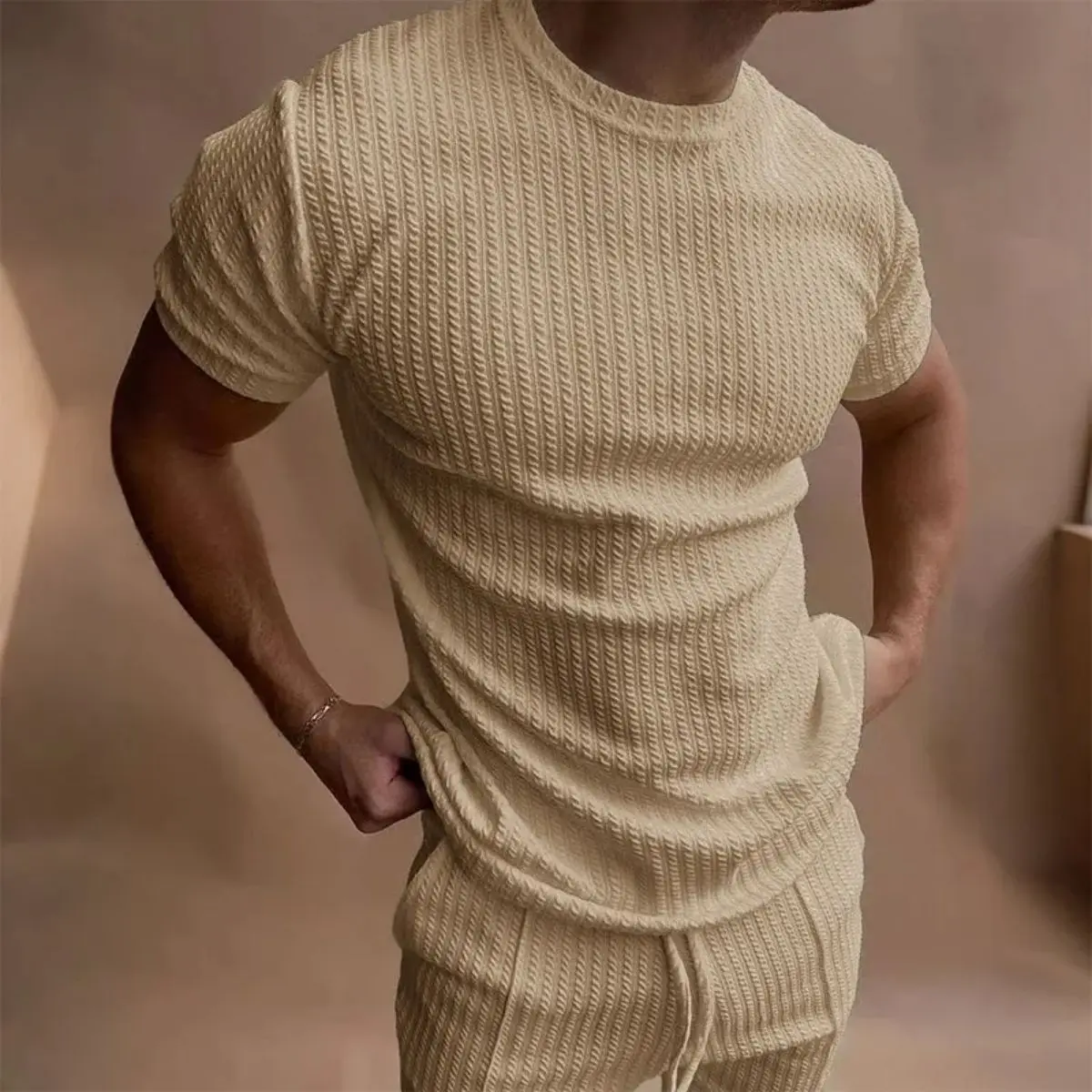 This men's waffle knit two-piece set includes a solid color short sleeve t-shirt and elastic waist shorts, made of soft, lightweight, and breathable waffle fabric that provides exceptional comfort for all-day wear, featuring a classic solid color design, relaxed casual fit, and an elastic waistband on the shorts for a comfortable and adjustable fit, perfect as casual loungewear, daily home wear, outdoor leisure, streetwear, or light sports tracksuit, easy to put on and take off, simple to match, and bringing you a stylish, cozy, and effortless wearing experience in daily life.Material: High-quality
