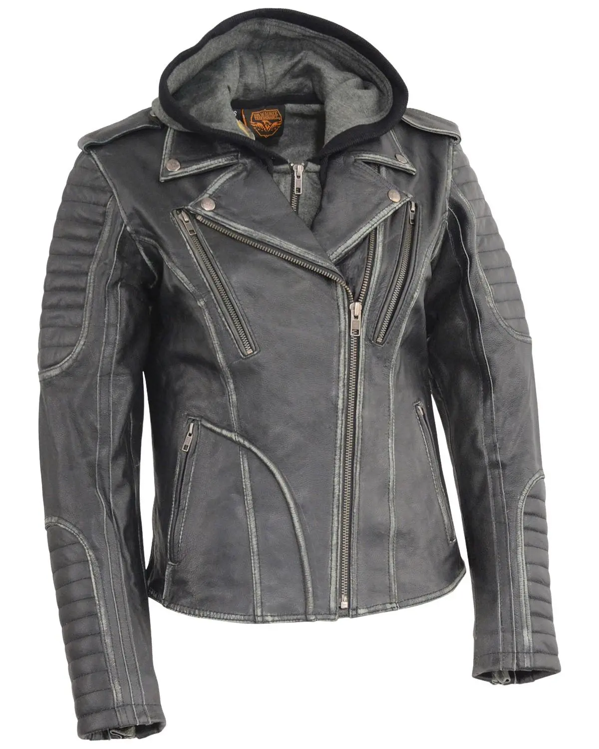 1.2-1.3mm premium cowhide. Two chest and back vents. Dual inside concealed weapon pockets. Two lower hand pockets. Full sleeve removable fleece hoodie jacket. Interior electronic media pocket with wire feed.