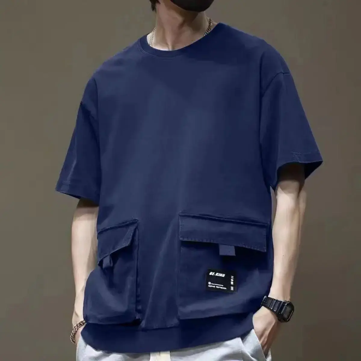 This mens cargo short-sleeve T-shirt highlights a trendy high-street style with a classic round neck and practical pocket design, showing unique street fashion and daily functionality. The dropped shoulder cut creates a relaxed, laid-back silhouette that fits naturally and offers freedom of movement, making it ideal for sports, running, daily outings, street shoots, casual gatherings and weekend activities. Perfect for summer wear, it brings a fashionable and effortless look whether youre hanging out with friends, exercising outdoors, or enjoying a casual day in the city. Easy to match with various pants and shoes, this tee is a must-have versatile piece for your modern casual wardrobe. Material: High-quality