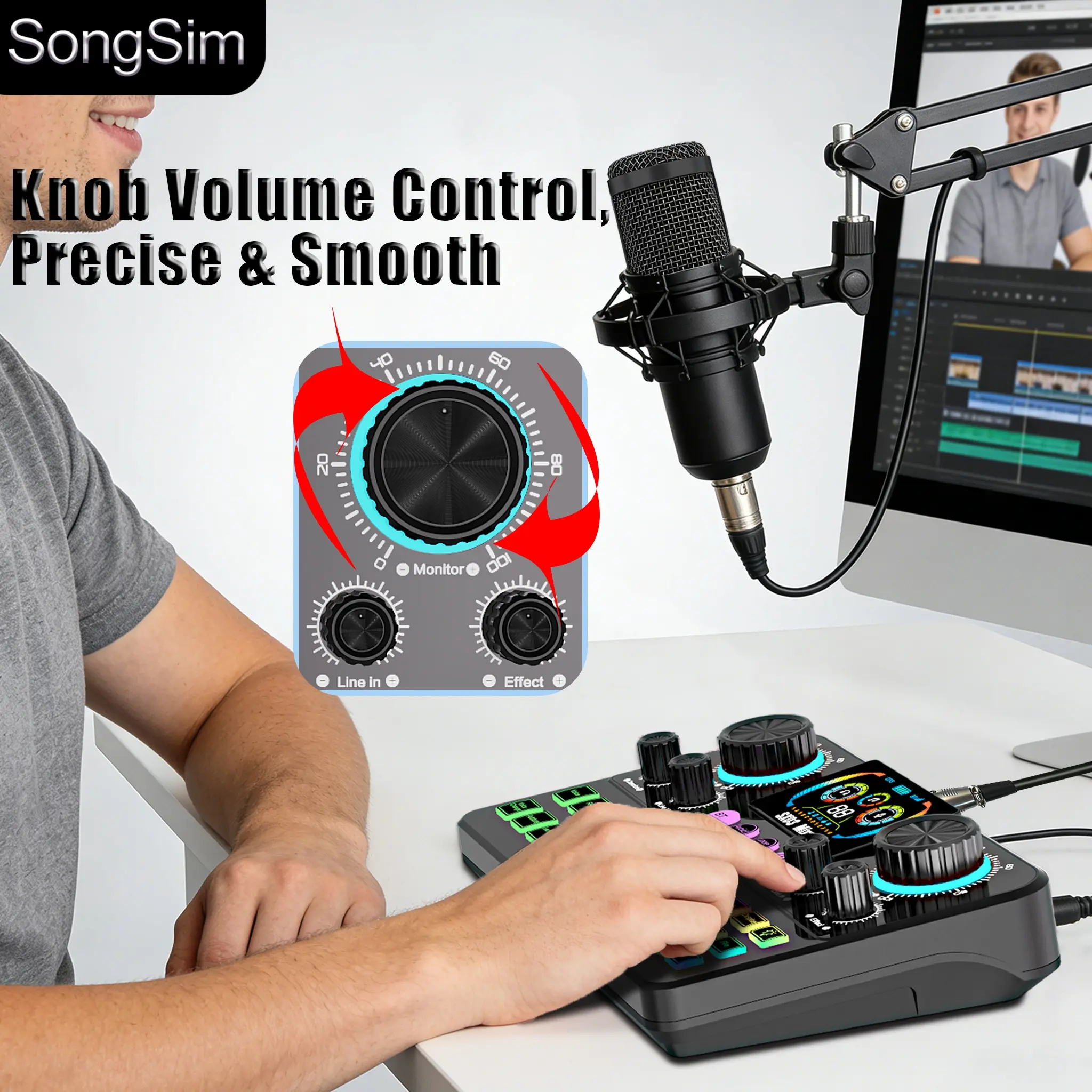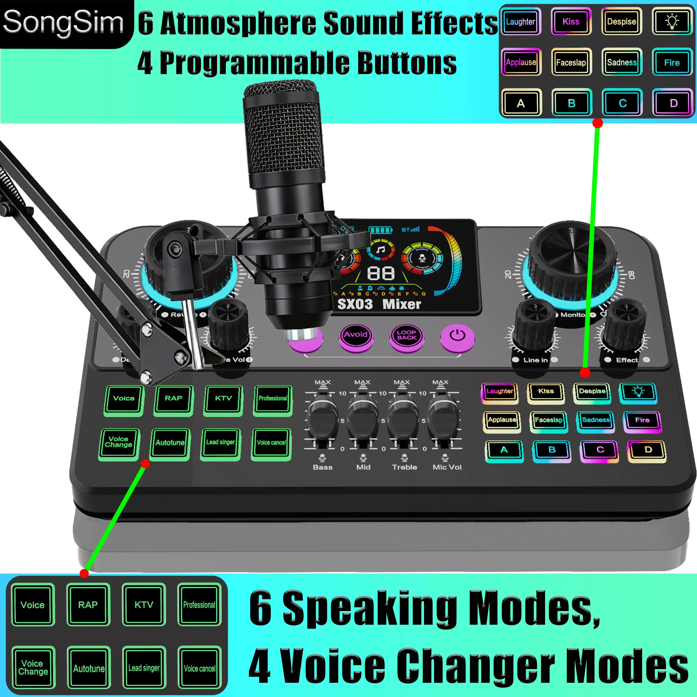 Professional Podcast Voice Changer Kit, Includes Microphone and Stand, 3 Channel Audio Input, OTG/USB Output, Suitable for Voicing, Speaking, Singing