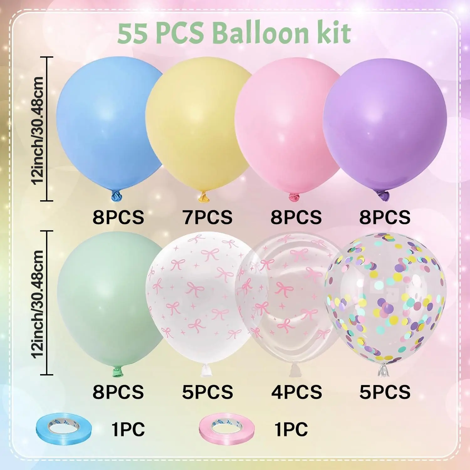 Pink bow balloons, rainbow balloon birthday decorations, 53 pieces of 12 inch pink bow printed balloons with 2 plain ribbons, children's confetti balloons, girls' princess bridal gift party decorations