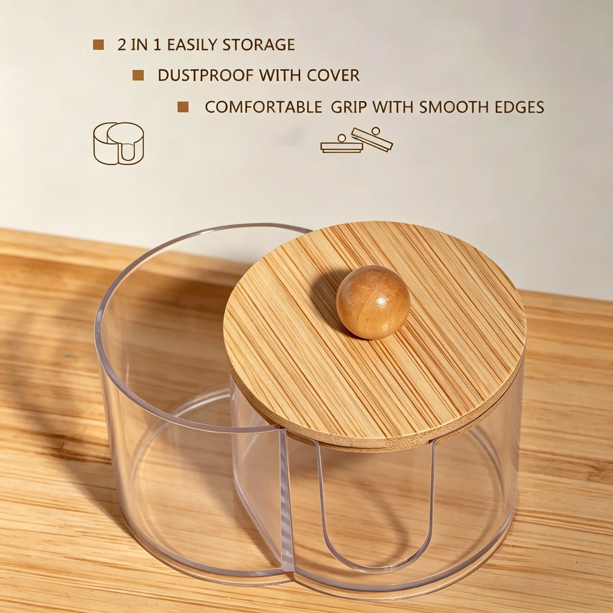 5. 2-In-1 Transparent Cotton Swab Makeup Storage Box, Wooden Lid, Dual Compartment Bathroom Organizer, Space-Saving Vanity Tray, Natural Wood Finish