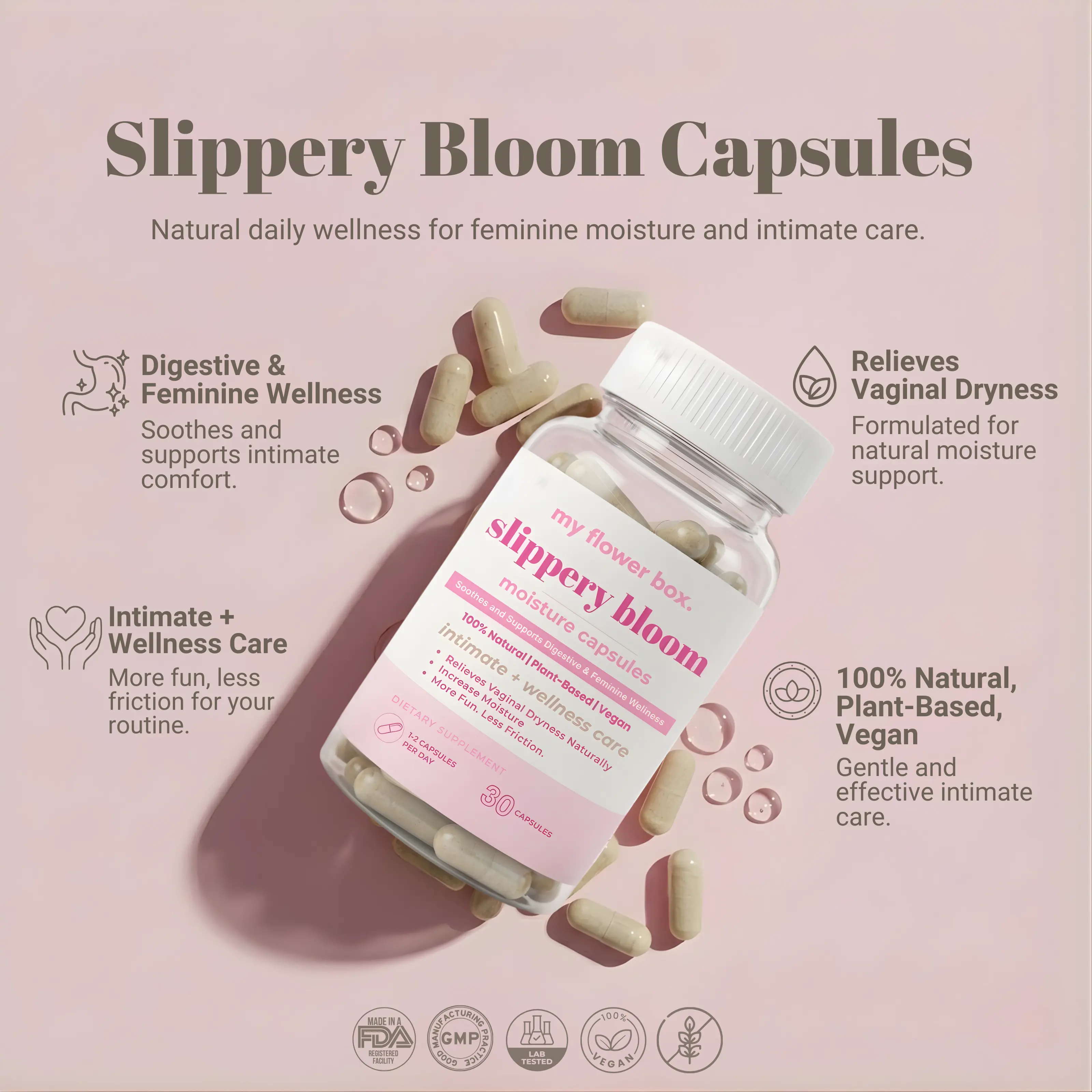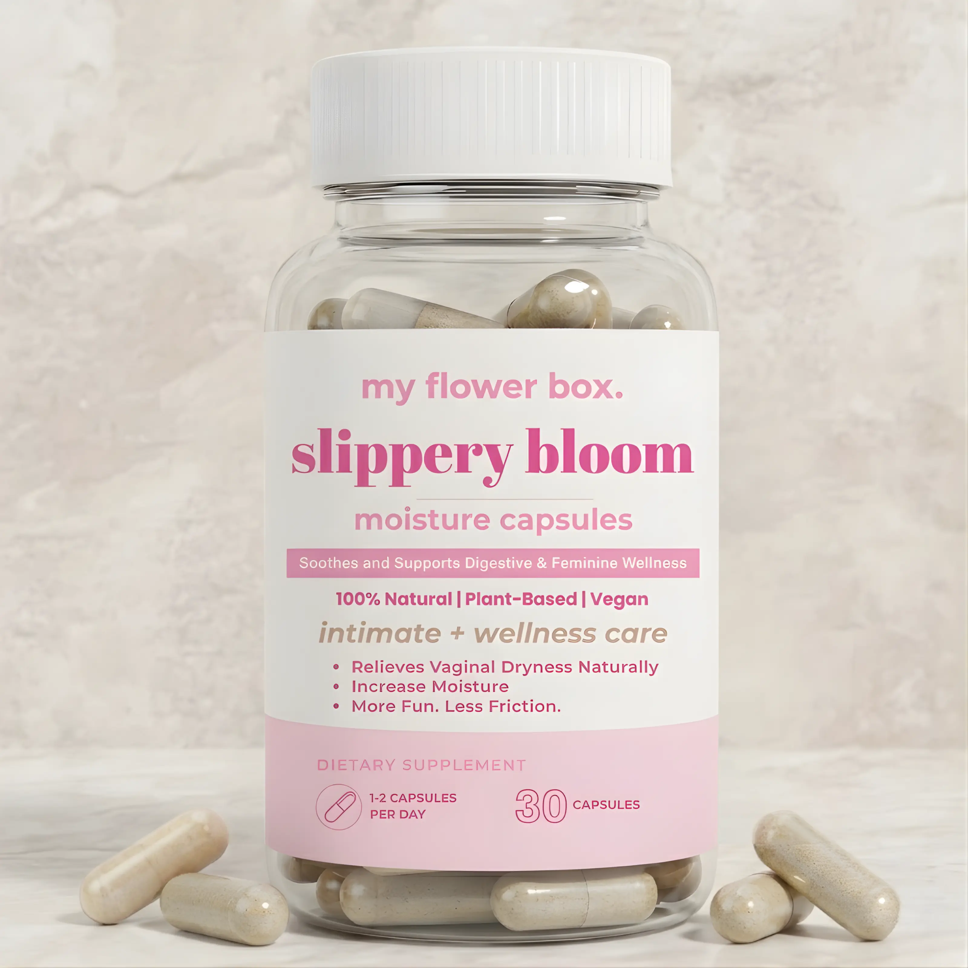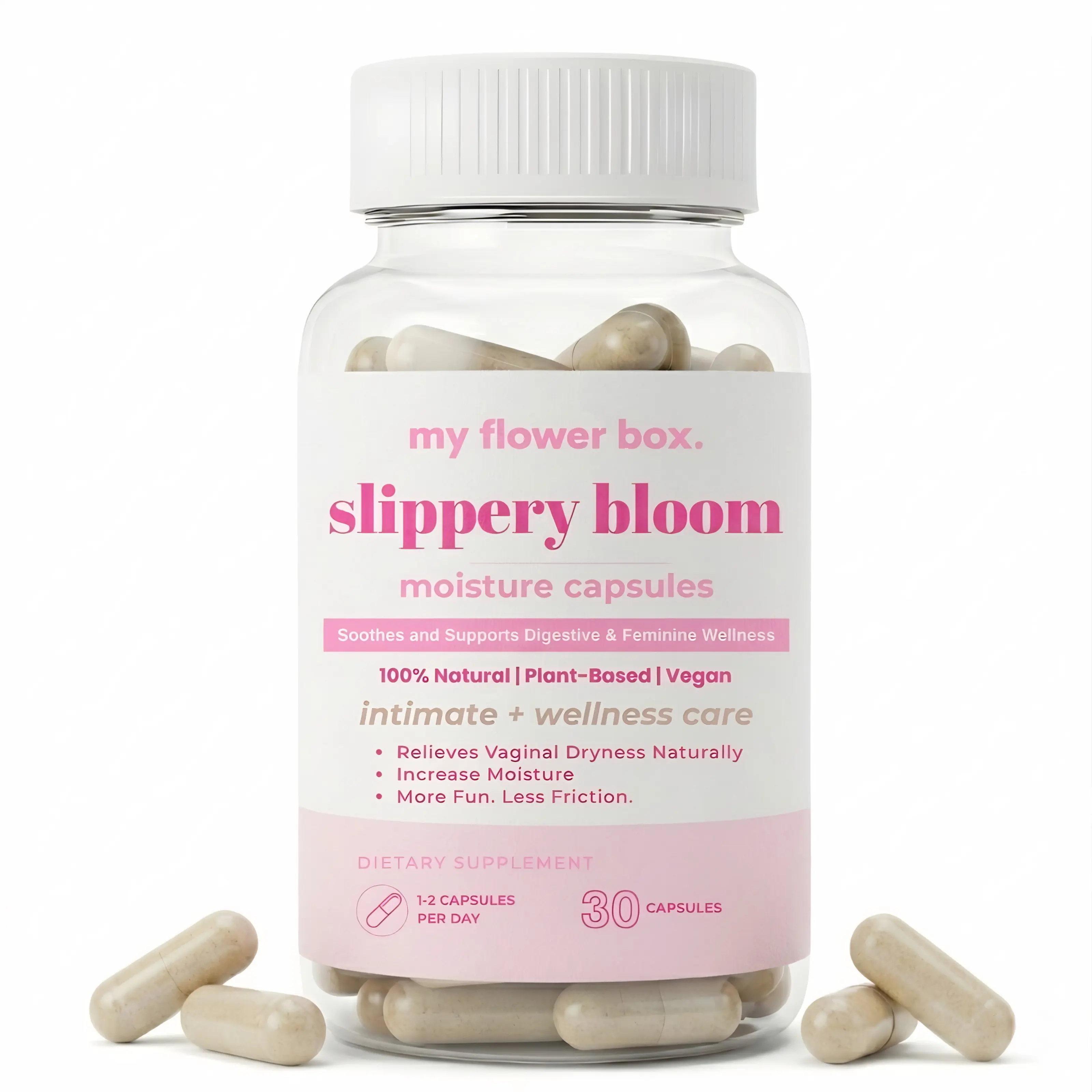 Slippery Bloom – Slippery Elm Capsules are designed to support feminine moisture, vaginal dryness, and gut health