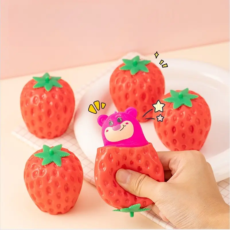 Realistic Strawberry Squeeze Toy โ give it a squeeze and a cute little bear pops out ๐๐ป! An ultra-bouncy, squeezable sensory stress-relief toy, perfect for parent-child interaction and a great icebreaker for social gatherings.