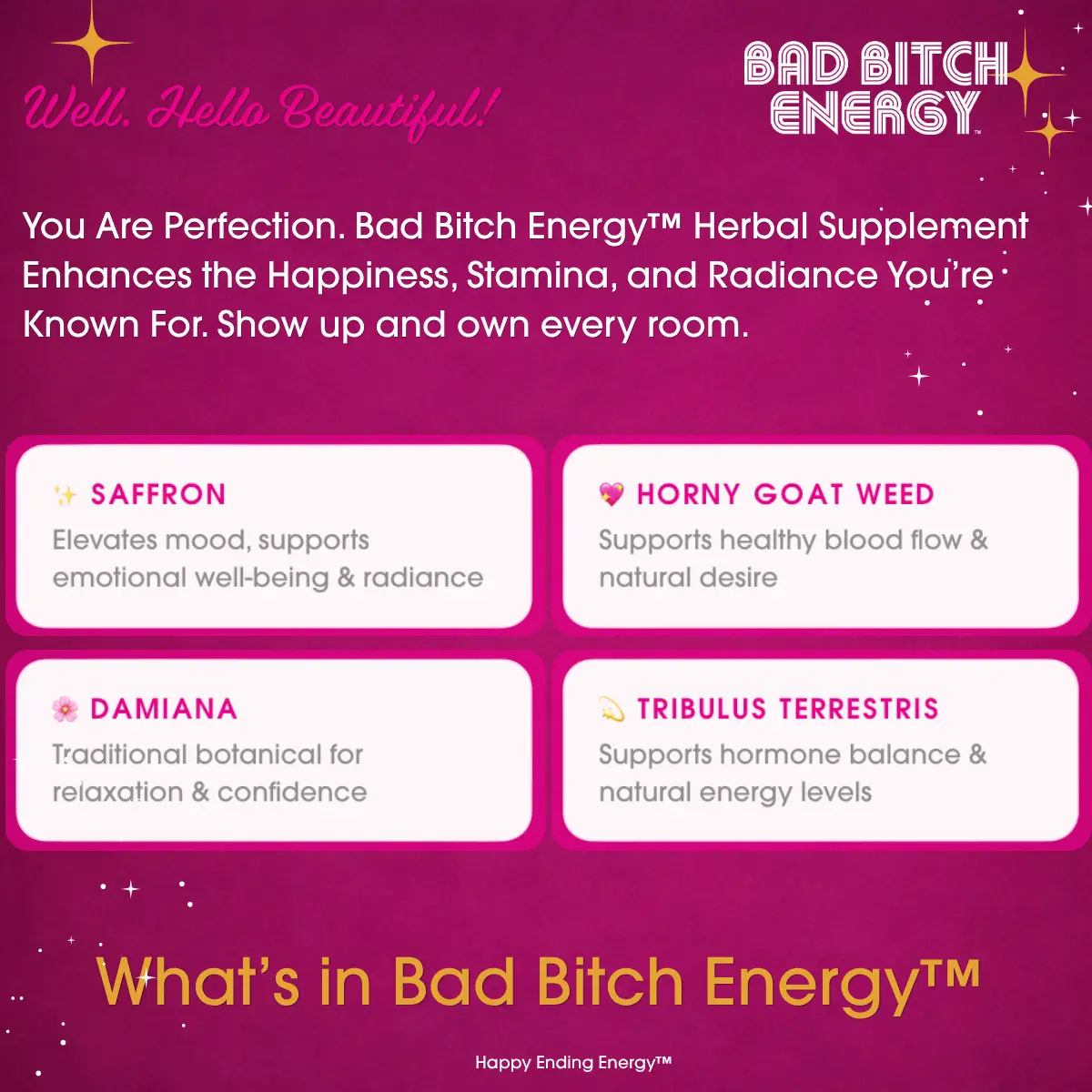 Bad Bitch Energy is the caffeine-free botanical energy drink built for the woman who runs the room — no stimulants, no apologies.