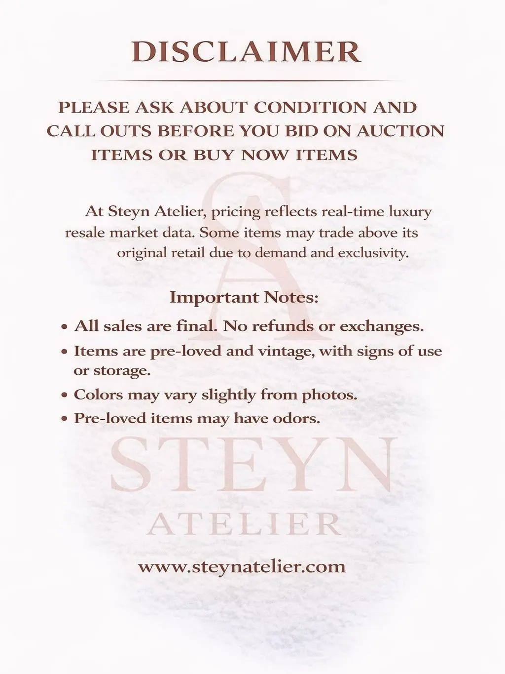 At Steyn Atelier, pricing reflects real-time luxury resale market data. Some items may trade above its original retail due to demand and exclusivity.
