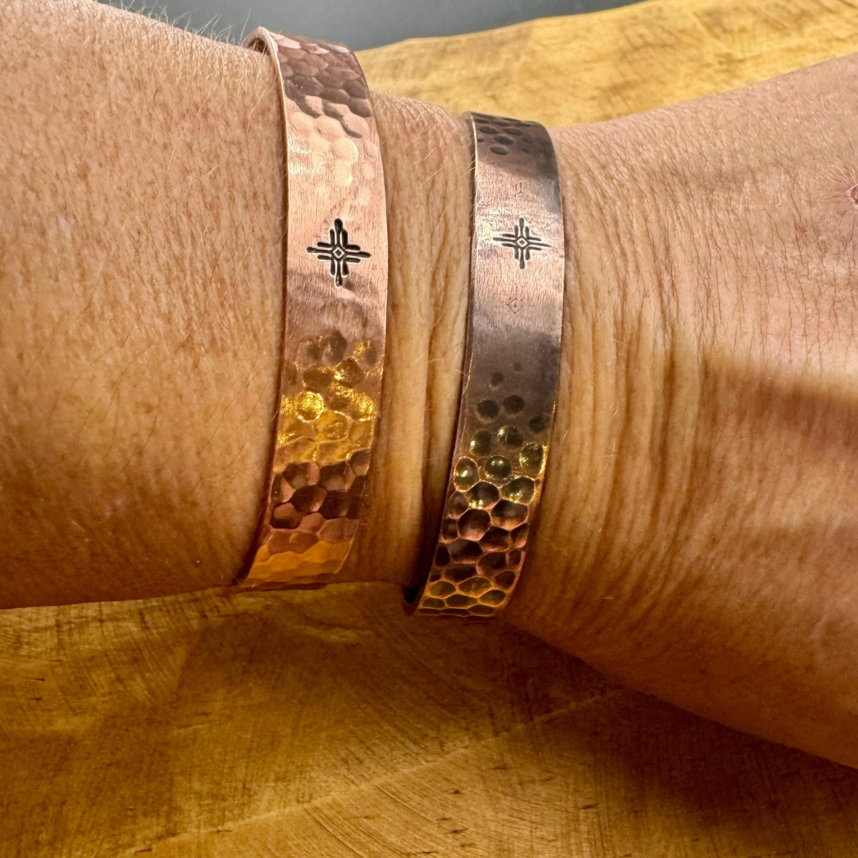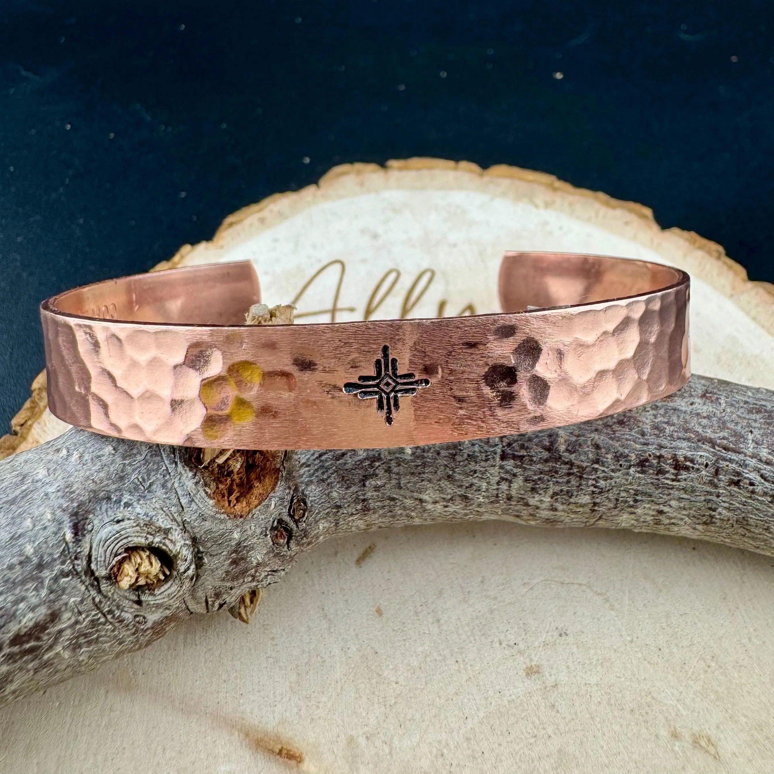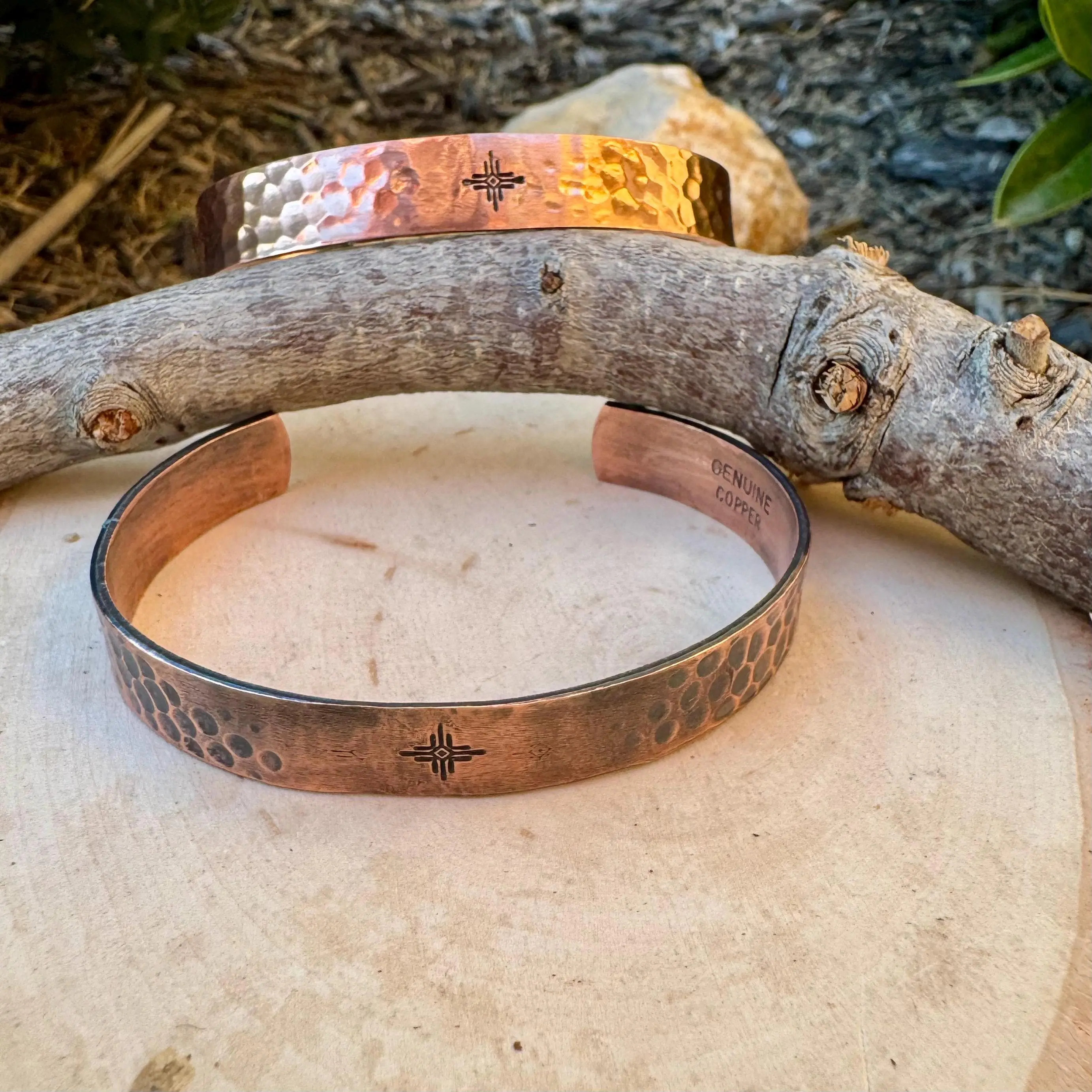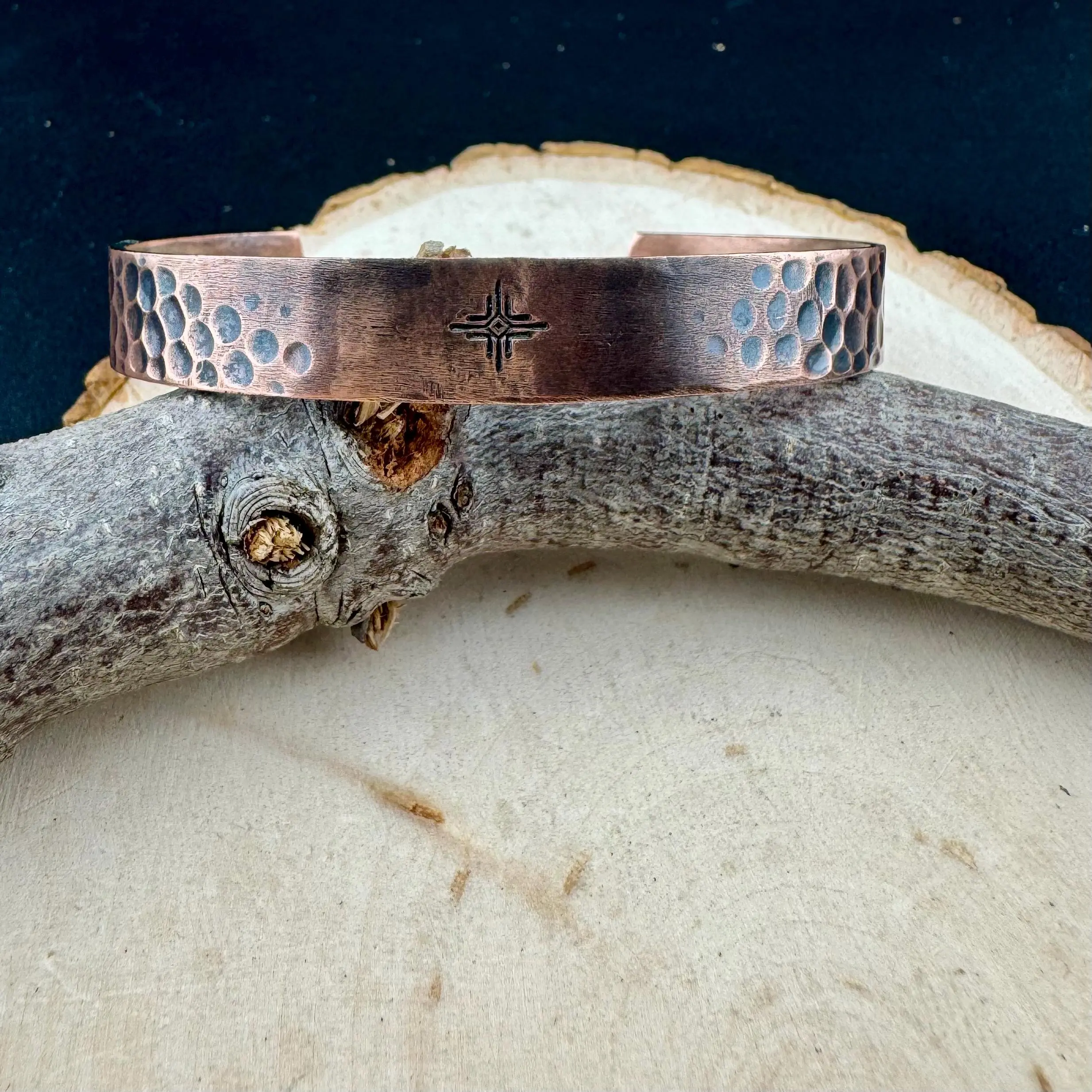 Celebrate heritage and handcrafted artistry with this striking copper cuff bracelet, measuring 9.6mm (3/8 inch) wide and adorned with the Southwest Halo Zia symbol. Each piece is cut, formed, hammered, and antiqued by hand, offering a choice between a vintage oxidized patina or a sleek polished finish — both equally stunning whether worn solo or stacked.
