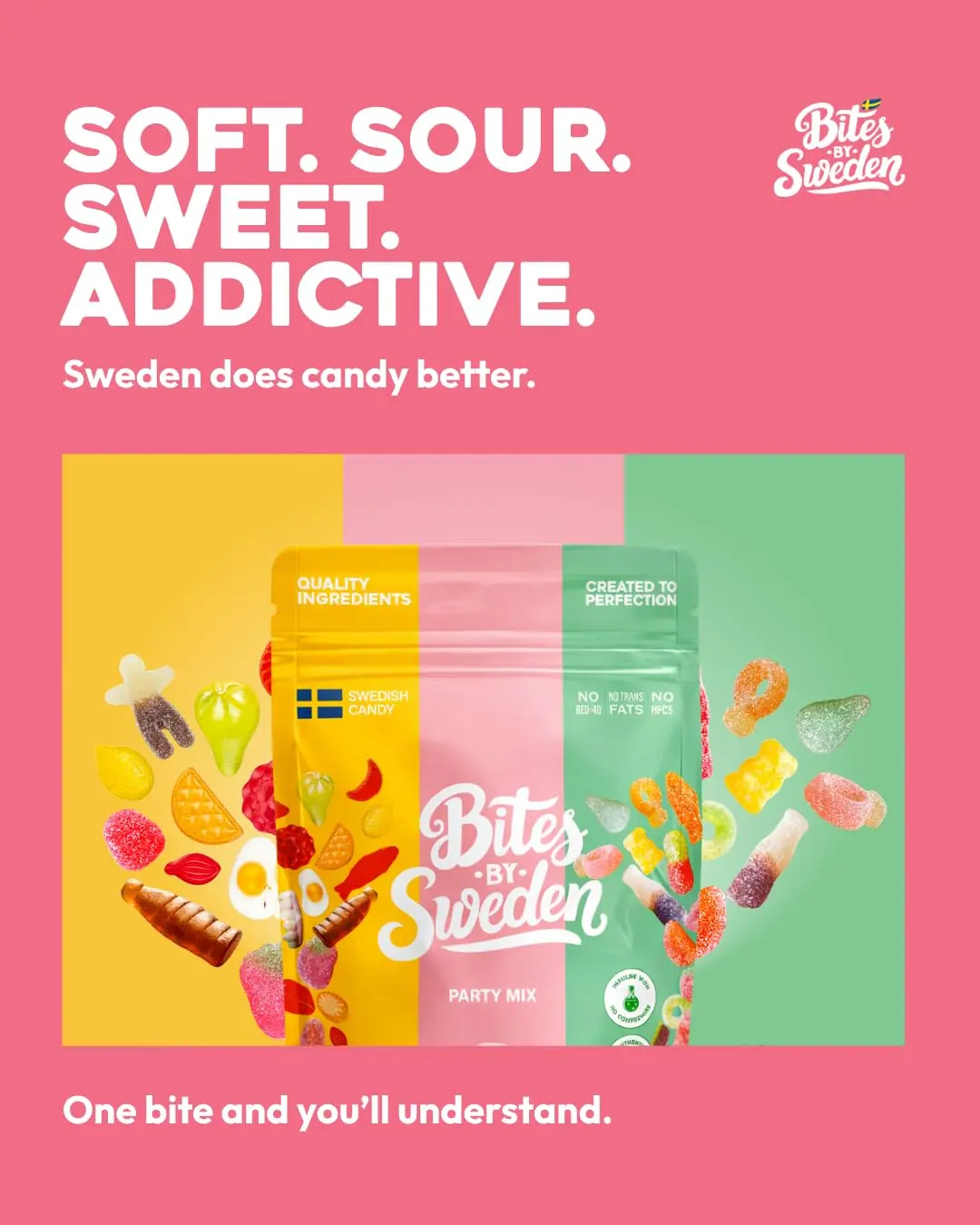 Bites by Sweden brings the best of Sweden’s iconic candy culture into one perfectly curated mix. Inspired by the tradition of Lördagsgodis, each bag features a balanced selection of sweet, sour, and chewy favorites—always authentic and made without GMOs, Red 40, high fructose corn syrup, or trans fats. A better-for-you indulgence without compromising on flavor.